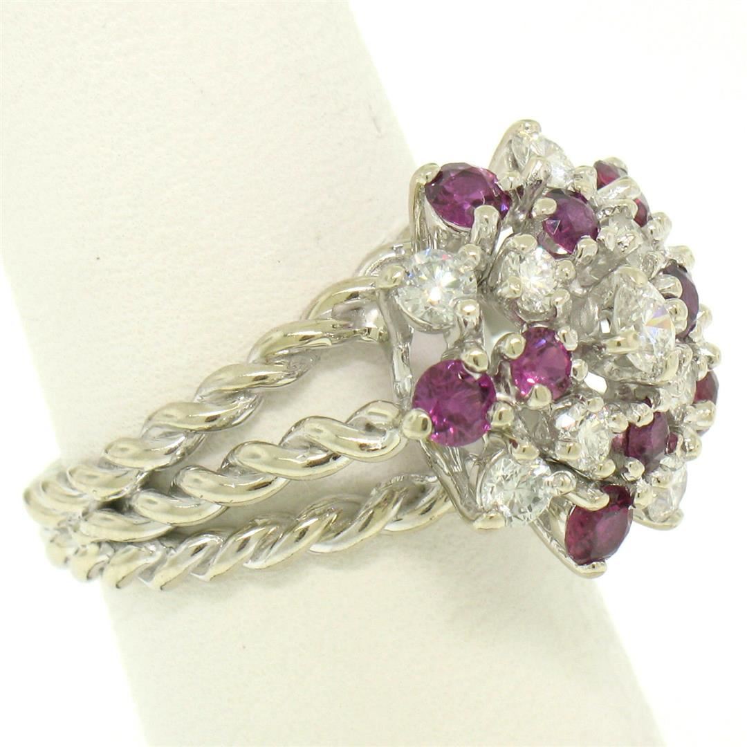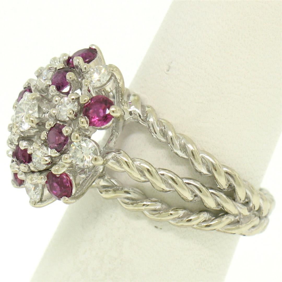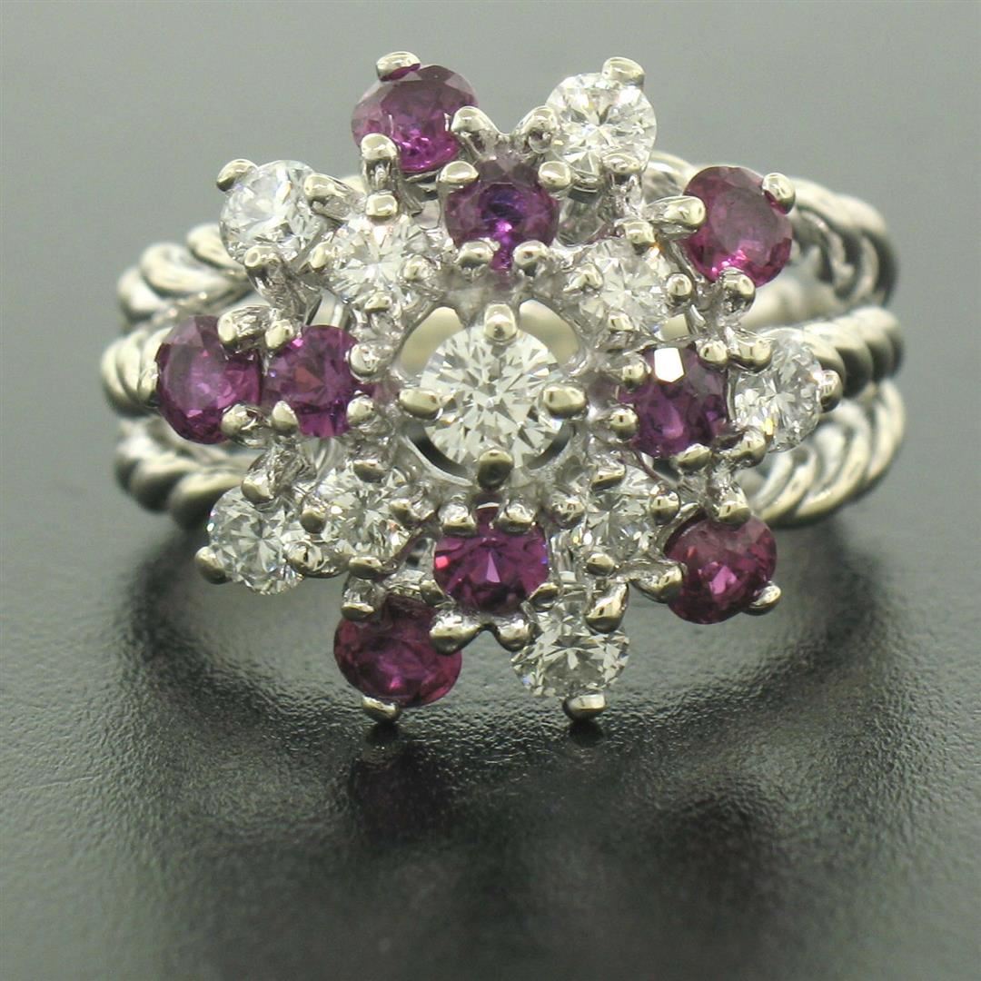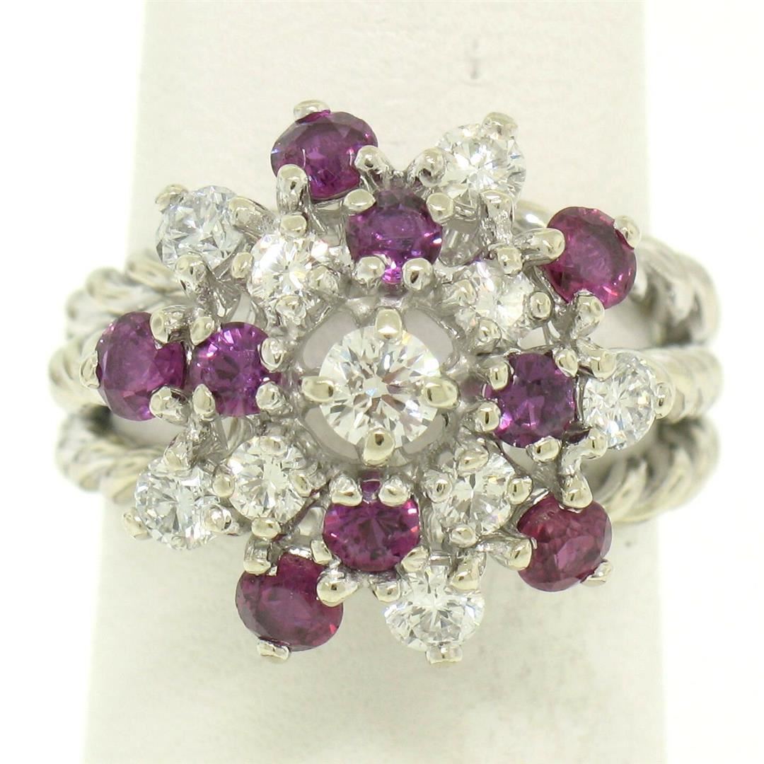 One 14K White Gold 2.10ctw Diamond & Ruby Cluster Daisy Twisted Wire Cocktail Ring. Item Details - Material: Solid 14K White Gold, Weight: 7.50 Grams, Stone(s): (10) Natural Genuine Diamonds - Round Brilliant Cut - Prong Set - F Color - VS1 Clarity - 0.90ctw (approx.), (9) Natural Genuine Rubies - Round Cut - Prong Set - Amazing Burgundy-Red Color - 1.20ctw (approx.), Total Carat Weight: 2.10 (approx.), Ring Size: 6.0, Ring Width: 16.25mm, Ring Height: 11.05mm rise off the finger, Condition: Like New!