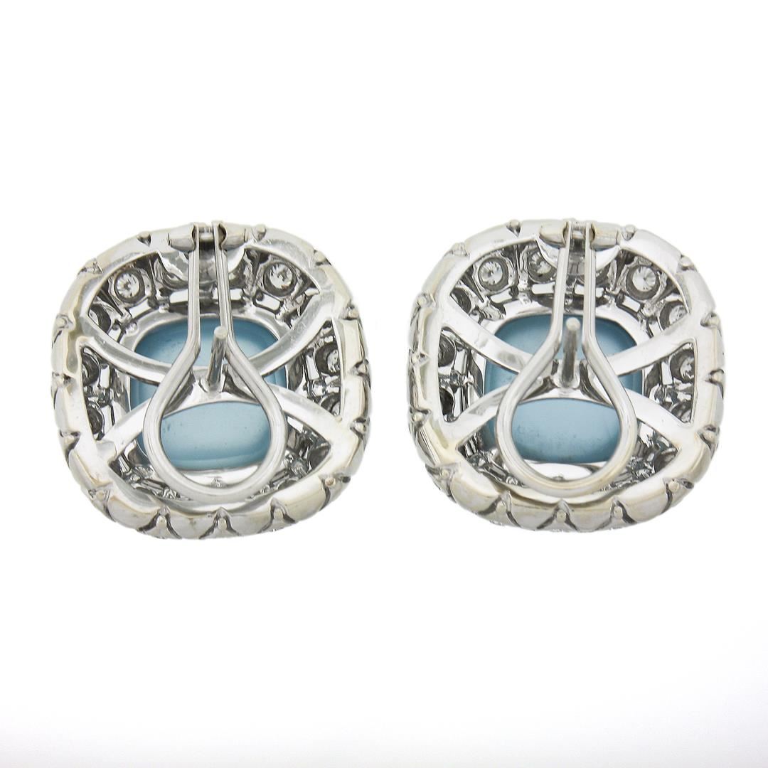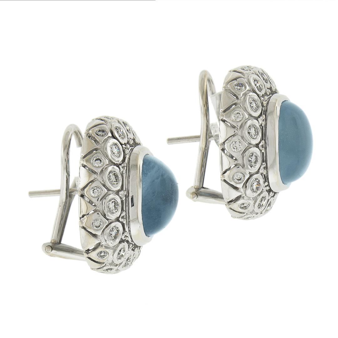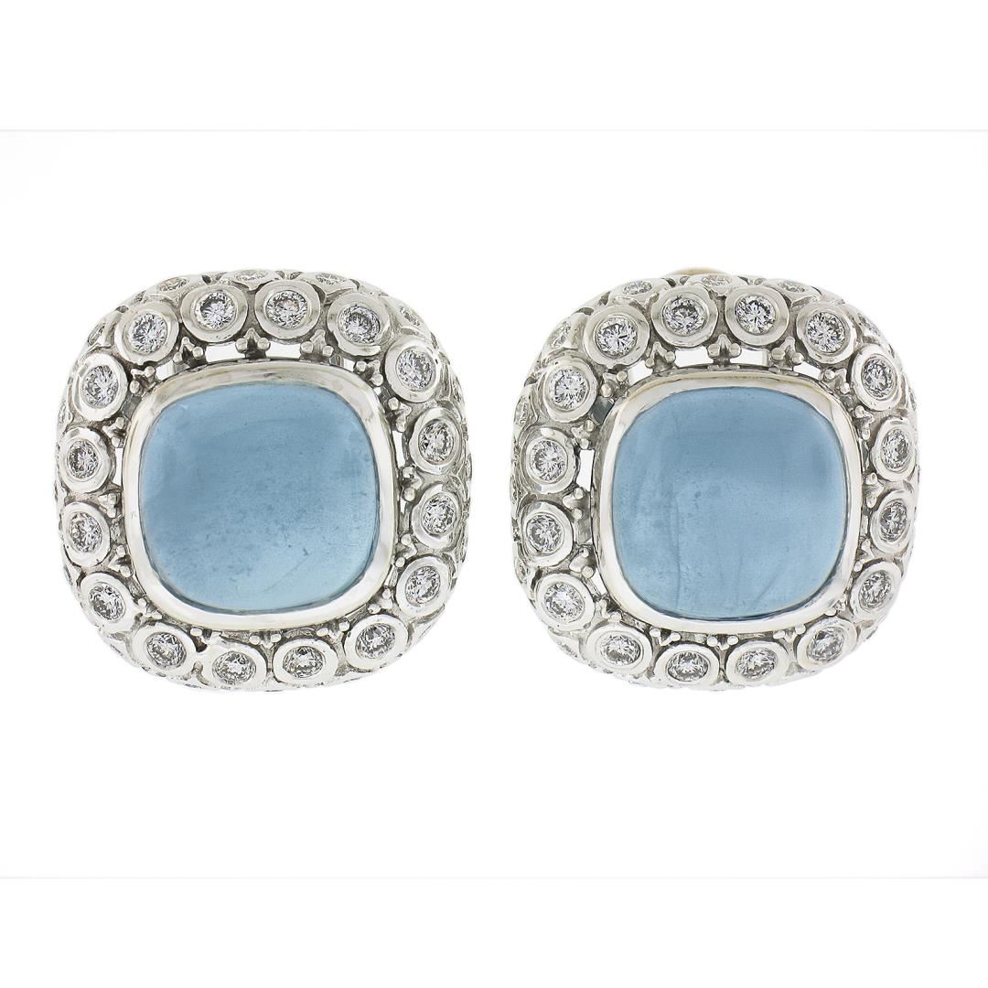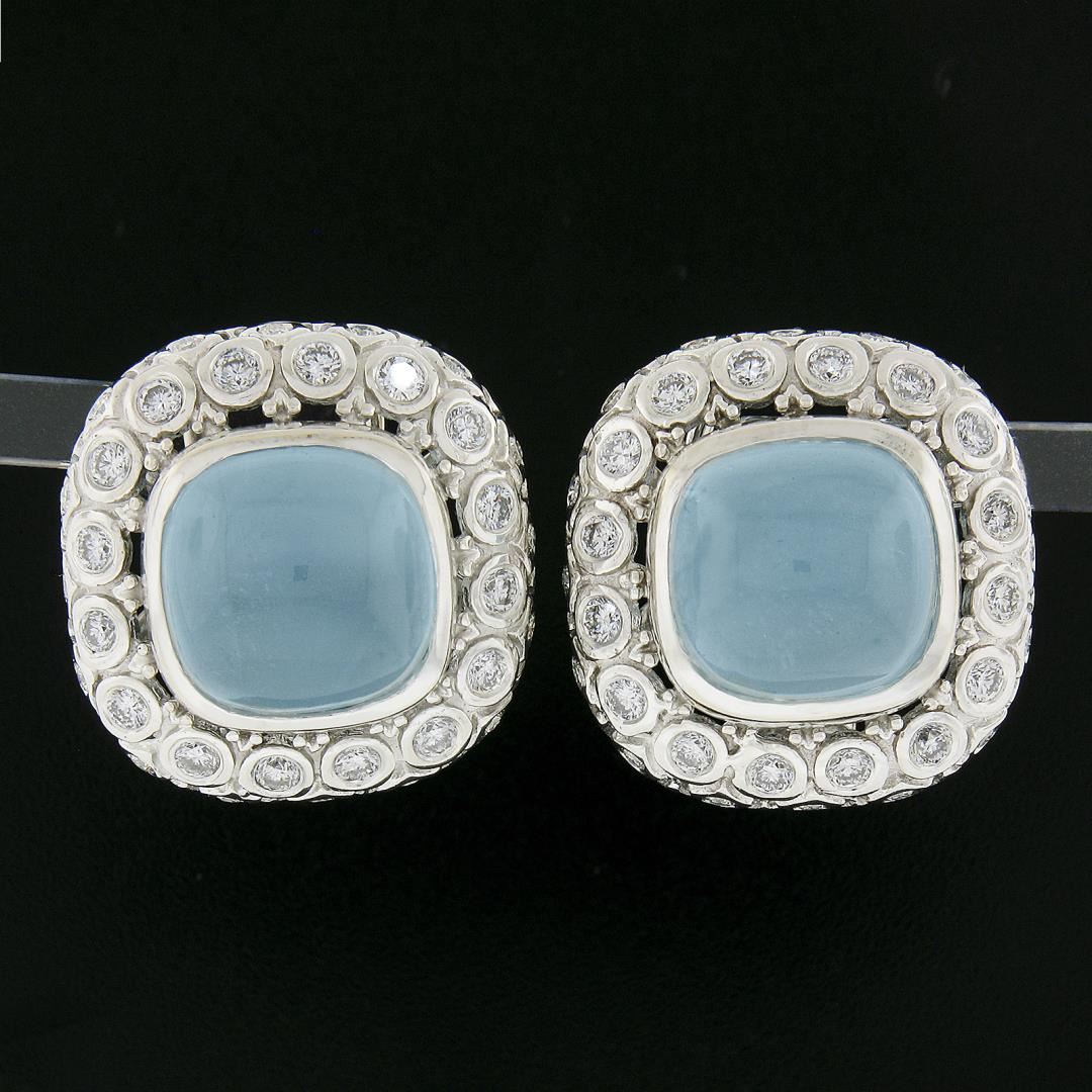 A solid 14k white gold button earrings, featuring 2 cushion cabochon natural aquamarine (12.5x12.5mm (approx.) - 18ctw), surouned with a halo of 64 round cut natural diamonds (G-I - VS1-SI1 ; 2.0ctw). The earrings measure approximately 23x22.6mm and weigh a total of 21.32 grams.