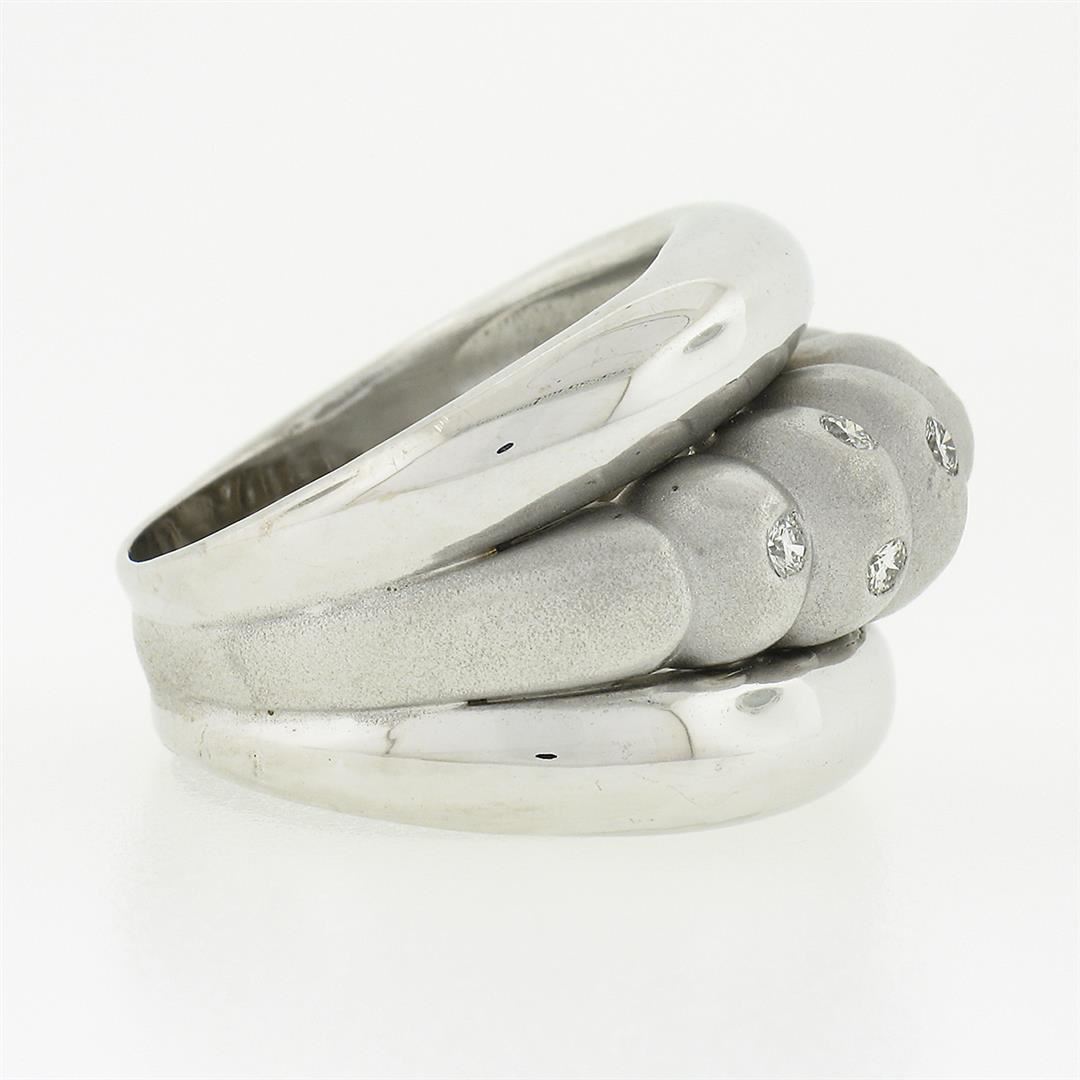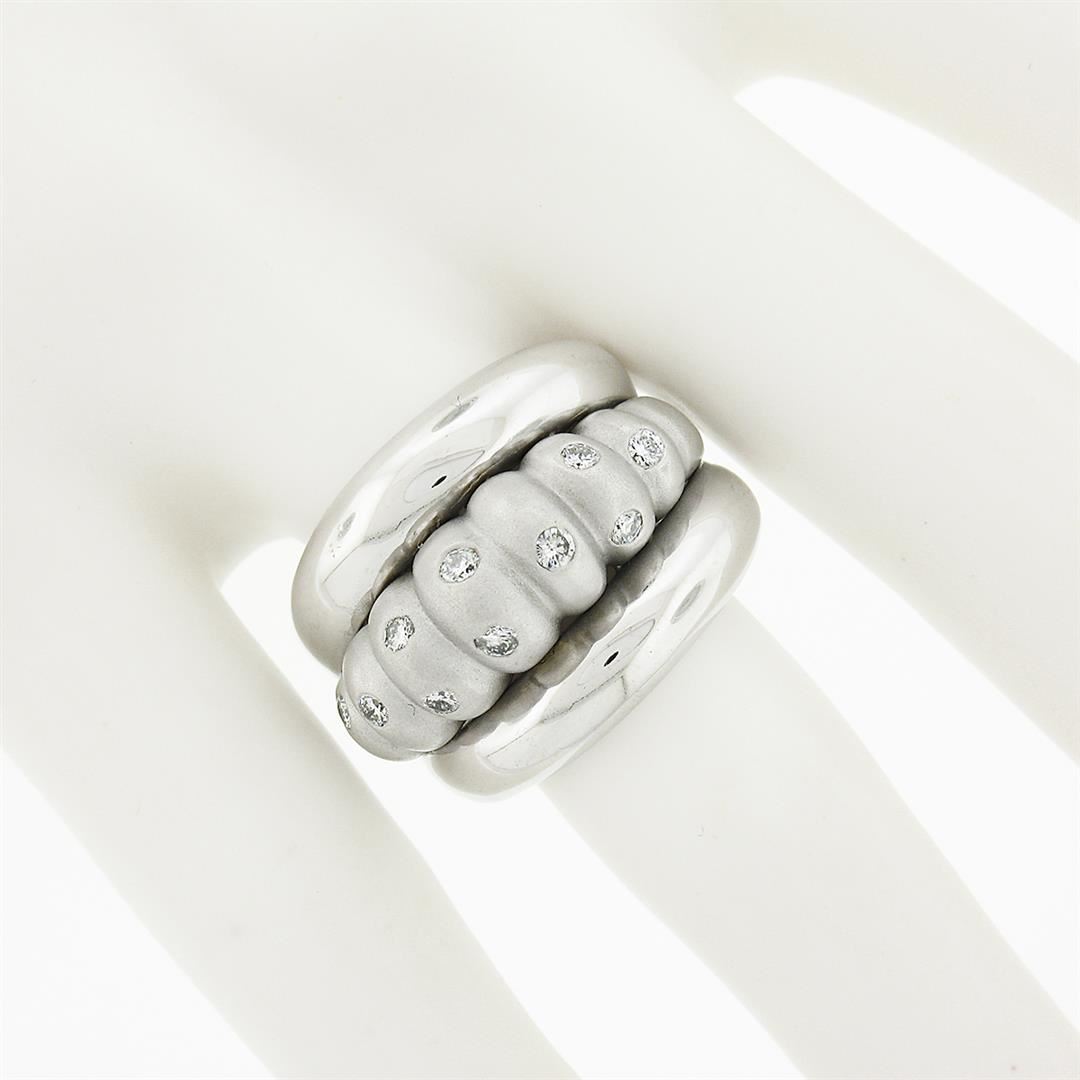 A solid 14k white gold wide domed band ring, featuring 10 round brilliant cut natural diamonds (G/H- VS1/VS2 ; 0.25ctw). The ring is size 8.0, weighs a total of 15.19 grams, and measures 18.25mm wide.