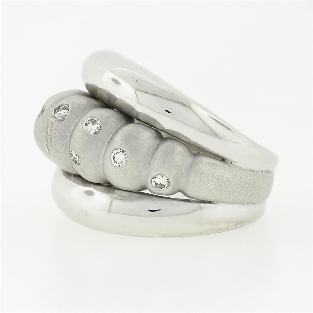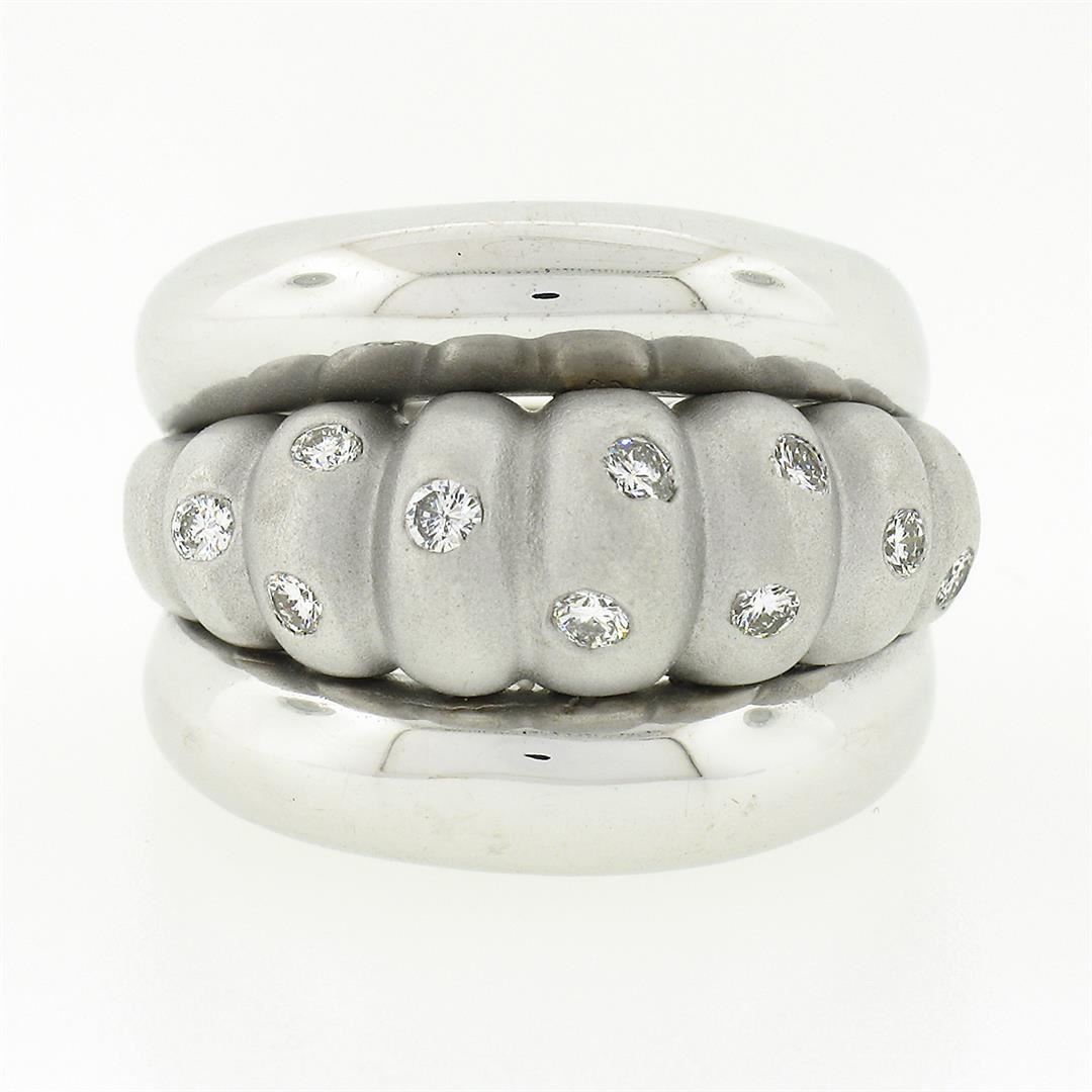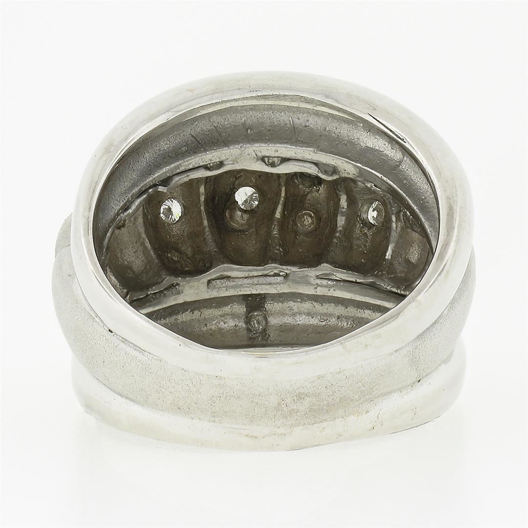 A solid 14k white gold wide domed band ring, featuring 10 round brilliant cut natural diamonds (G/H- VS1/VS2 ; 0.25ctw). The ring is size 8.0, weighs a total of 15.19 grams, and measures 18.25mm wide.