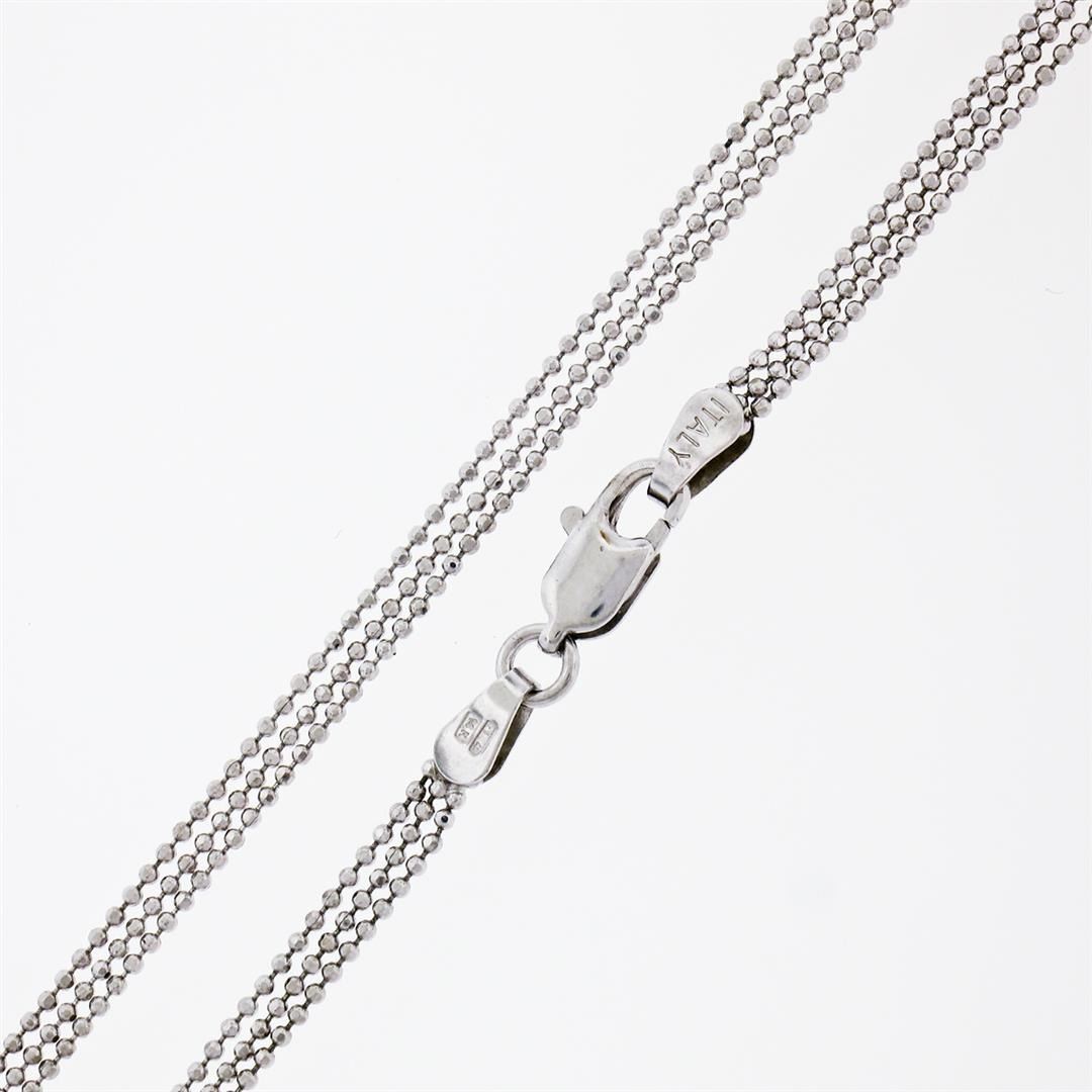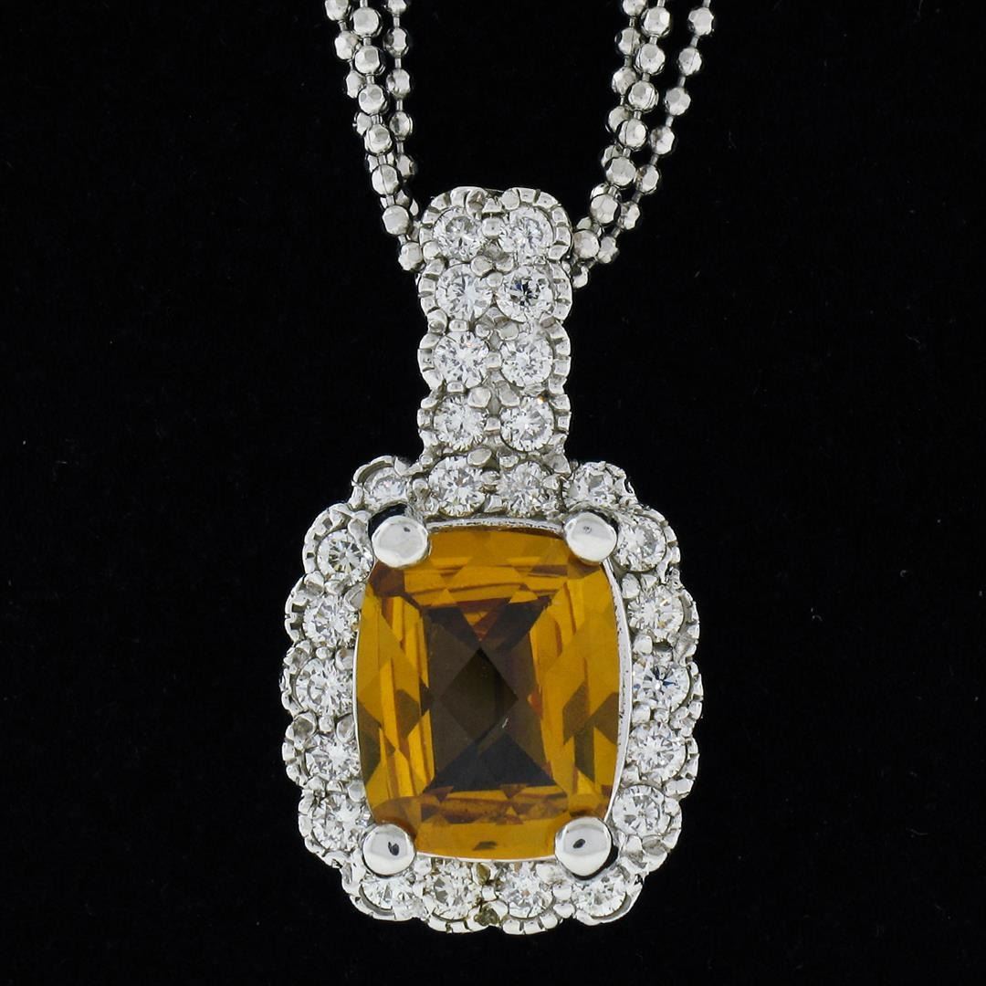 An estate solid 14k white gold pendant necklace, with 1 cushion checkerboard cut natural citrine (3.16ct), surrounded with 26 round brilliant cut natural diamonds (F- VS2; 0.55ctw). The pendant weighs a total of 7.87 grams, measures 22.0x12.50mm including the bail, and 16 inch multi-strand bead link chain