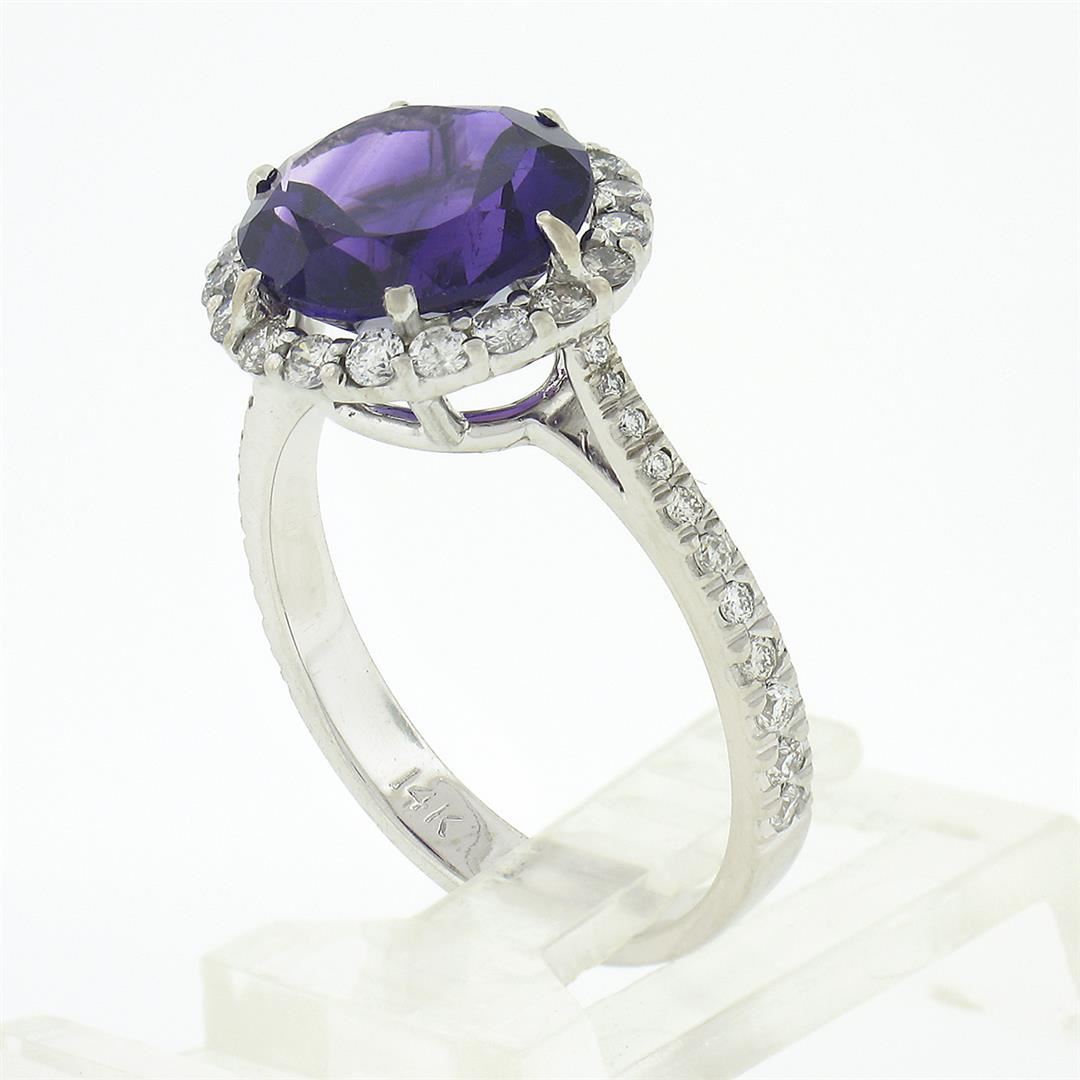 A solid 14k white gold ring, with 1 round brilliant cut natural amethyst (10mm - 3.3ct), surrounded with a halo of 39 round brilliant cut natural diamonds (G/H - VS2 ; 0.80ctw).The ring is size 7.5, weighs a total of 3.84 grams, and measures 12.85mm wide.