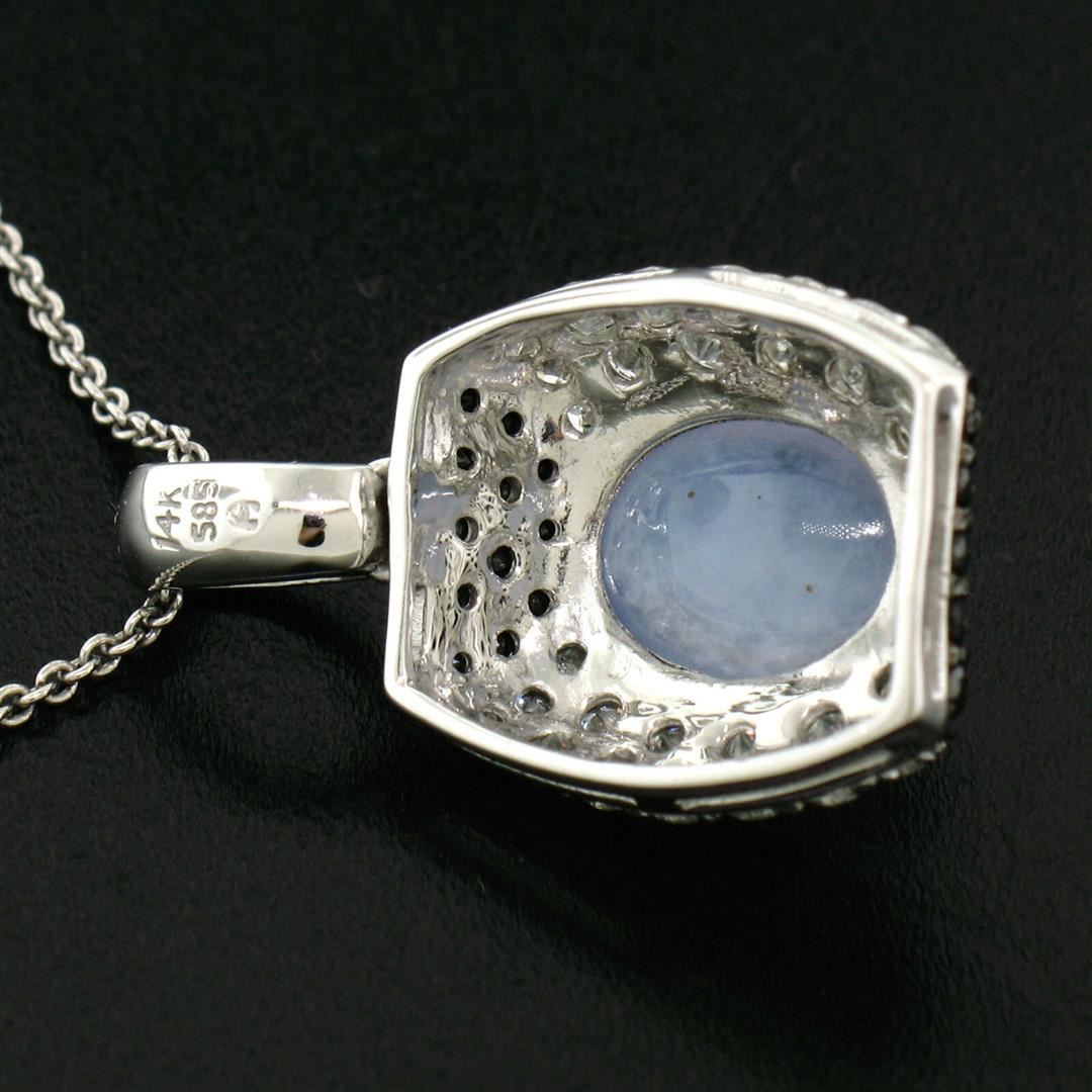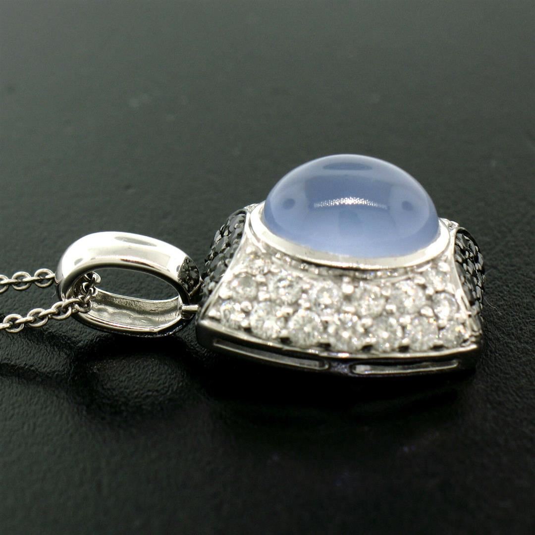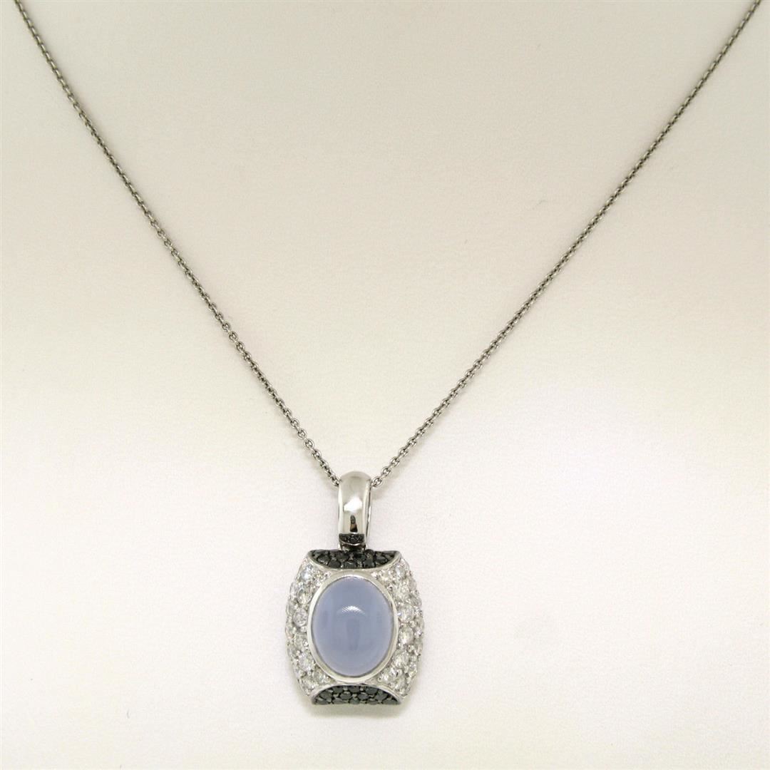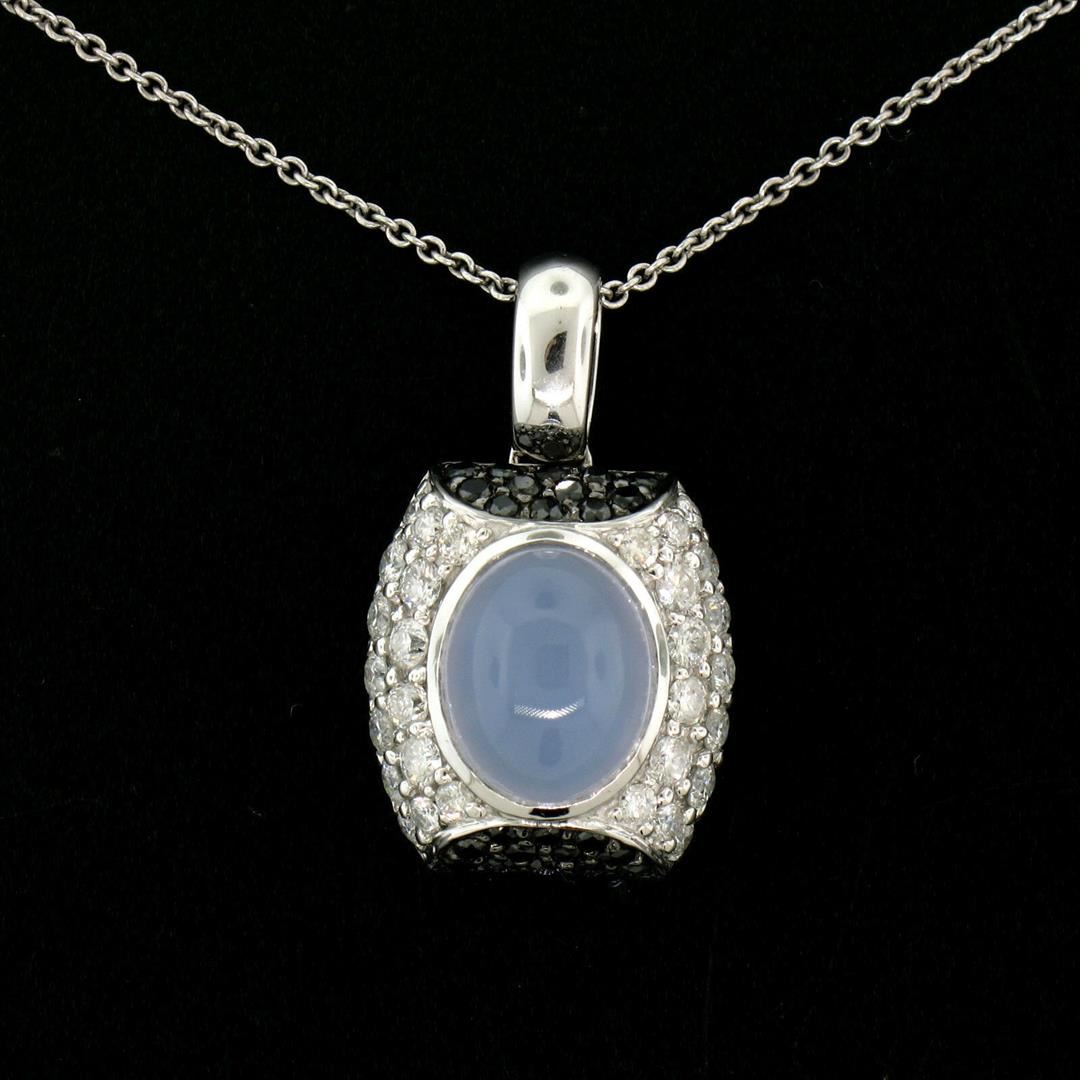 A solid 14k white gold pendant with a blue chalcedony (8.80x6.70mm; 3.20ct) accented by 30 natural white diamonds (G/H - SI1; 0.76ctw) and 24 natural black diamonds (0.35ctw). 16 inch cable link chain, 5.39 grams total weight, pendant measures 24.1x14.3mm.