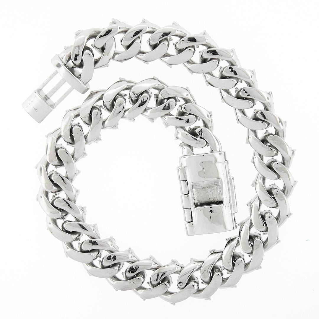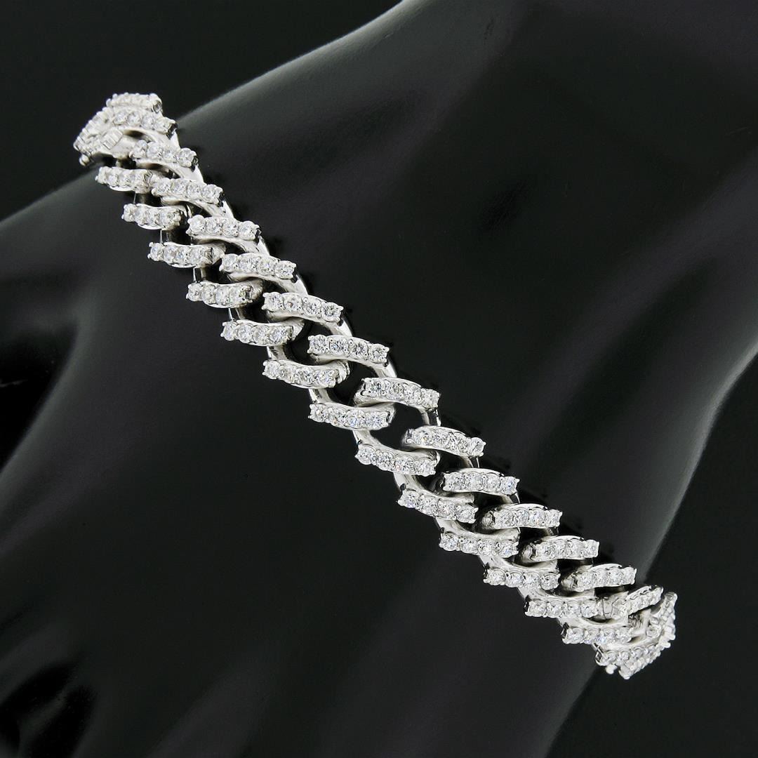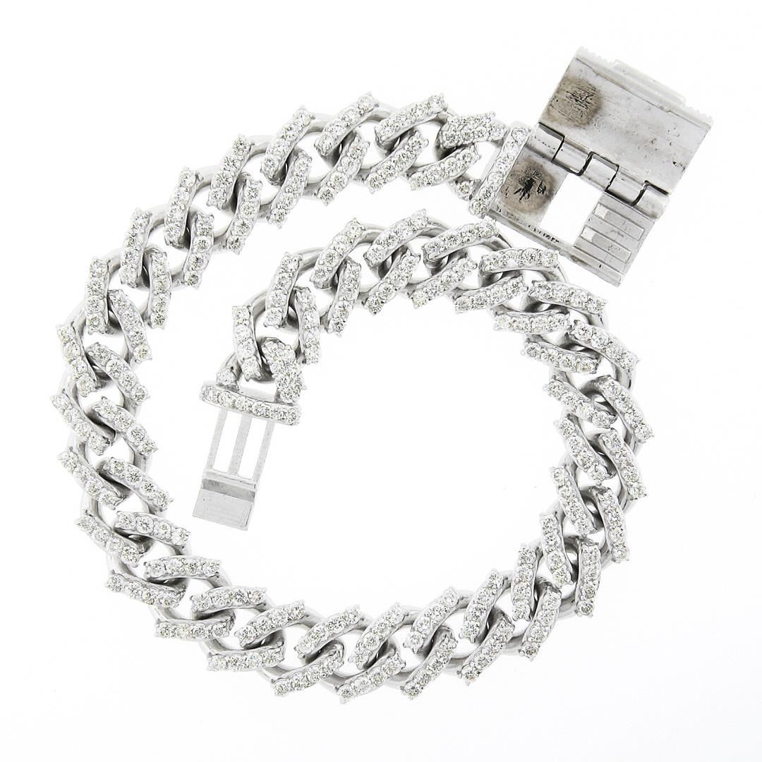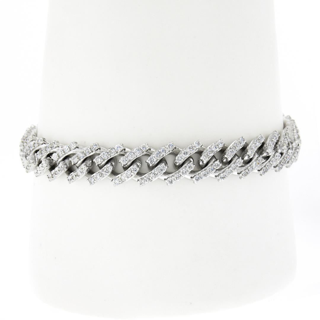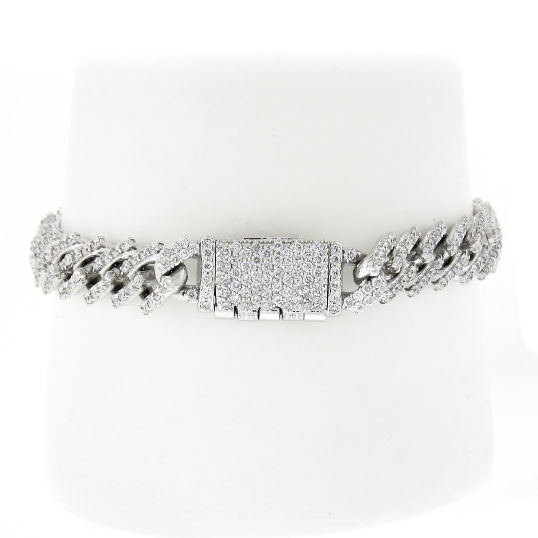 A solid 14k white gold cuban bracelet, with 326 round brilliant cut natural diamonds (G/H - VS2/SI2 w/ a few I ; 5ctw). It weighs a total of 32.30 grams, measures 9mm wide, and measures 7 inches in length.