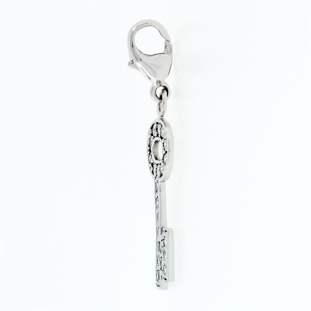 A solid 14k white gold long lock key dangle charm pendant, with 22 round brilliant cut natural diamonds (F/G - VS2/SI1; 0.66ctw). The pendant weighs a total of 2.01 grams, measures 37.2x10.7mm including the bail, and the inside of the bail measures 3.6mm
