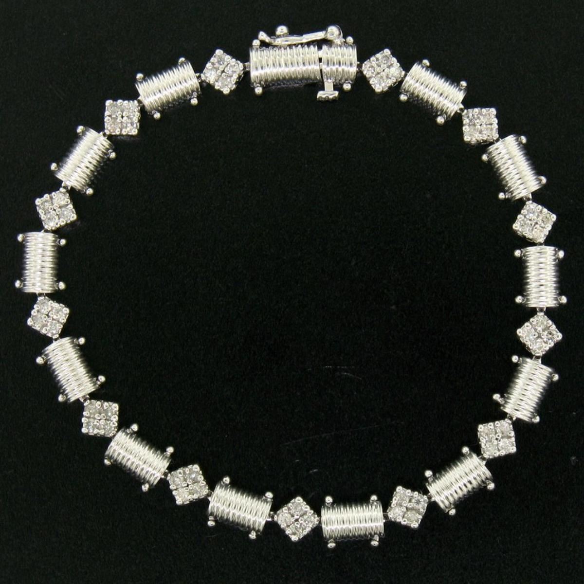 One 14K White Gold 7.25" 1.30ctw Round Diamond Cluster & Ribbed Link Tennis Bracelet. Item Details: Material: 14K Solid White Gold, Weight: 11.79 Grams, Stone(s): (52) Natural Genuine Diamonds - Round Brilliant Cut - Prong Set - VS2/SI1 Clarity - G/H Color, Total Carat Weight: 1.30 (approx.), Type: Ribbed Half Cylinder and Square Diamond Cluster Link, Length: 7.25 Inches, Clasp: Box-Type Clasp w/ Safety Latch, Width: 6.3mm Thickness: 3.58mm rise off the wrist Condition: Like New!