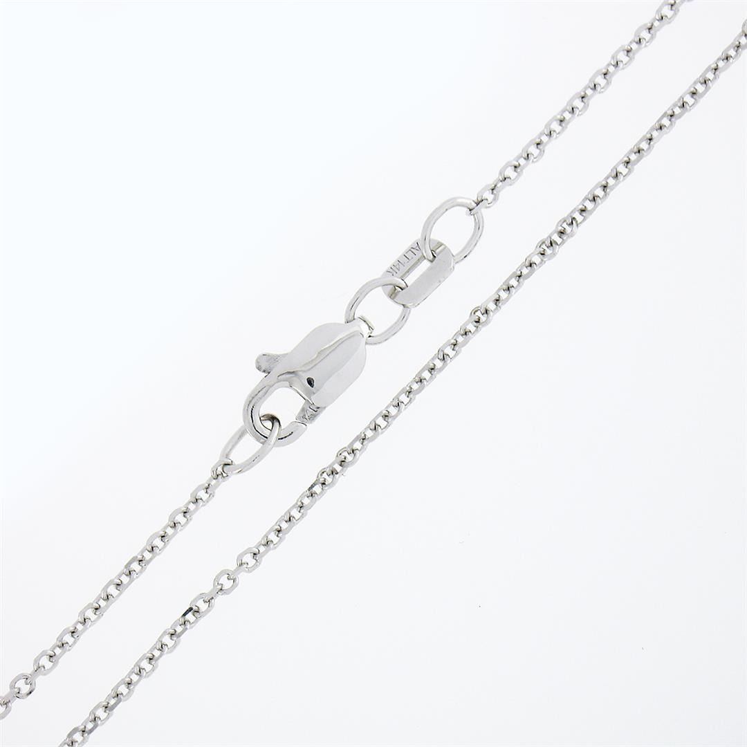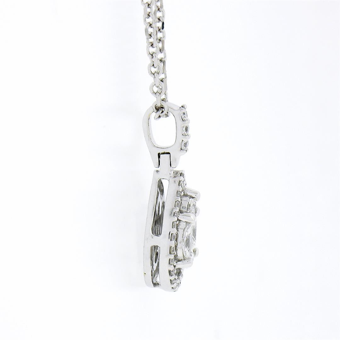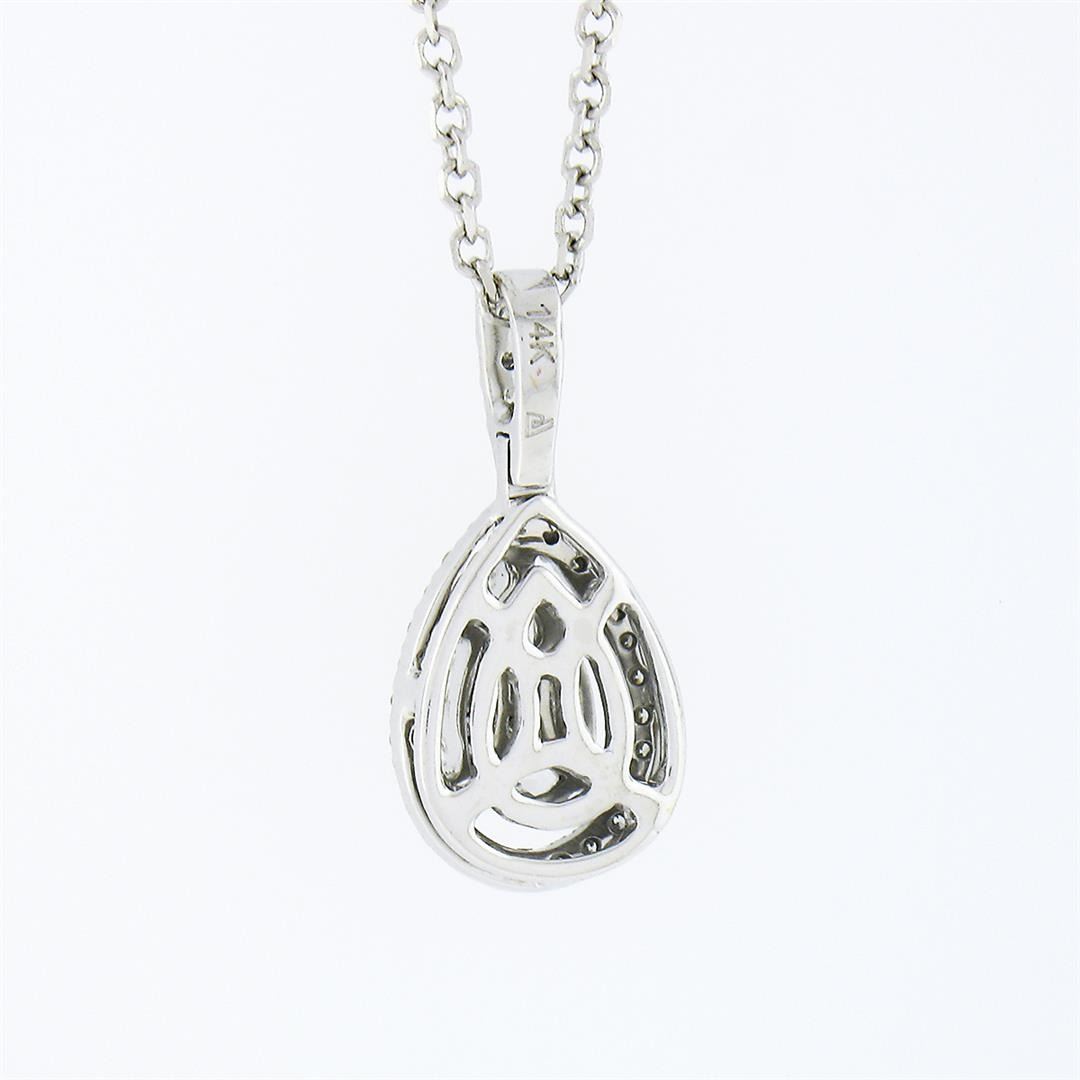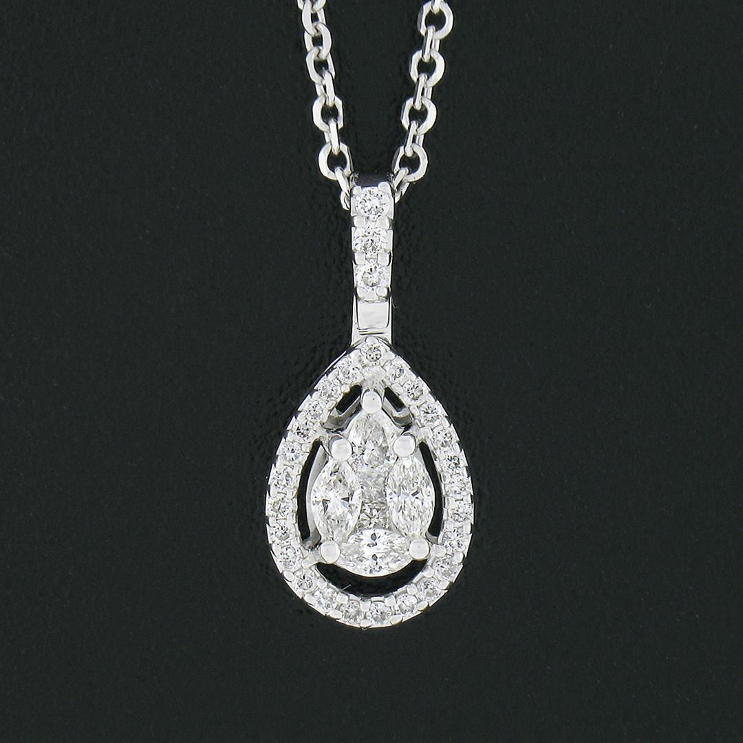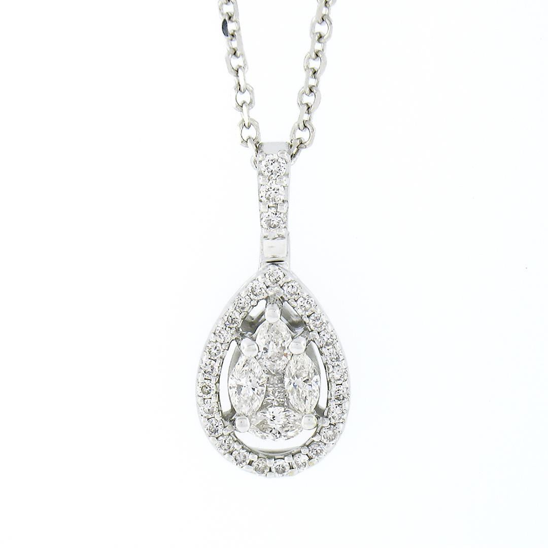 A solid 14k white gold tear drop pendant necklace, with 28 round brilliant cut natural diamonds (VS2/SI1 ; G/H - 0.32ctw), and 1 Pear Cut 3 Marquise Cut 2 Princess Cut Natural diamonds (SI1/SI2 ; G/H - 0.32ctw). 16 inch cable link chain, 2.36 grams total weight, pendant measures 15.50x7.15mm.