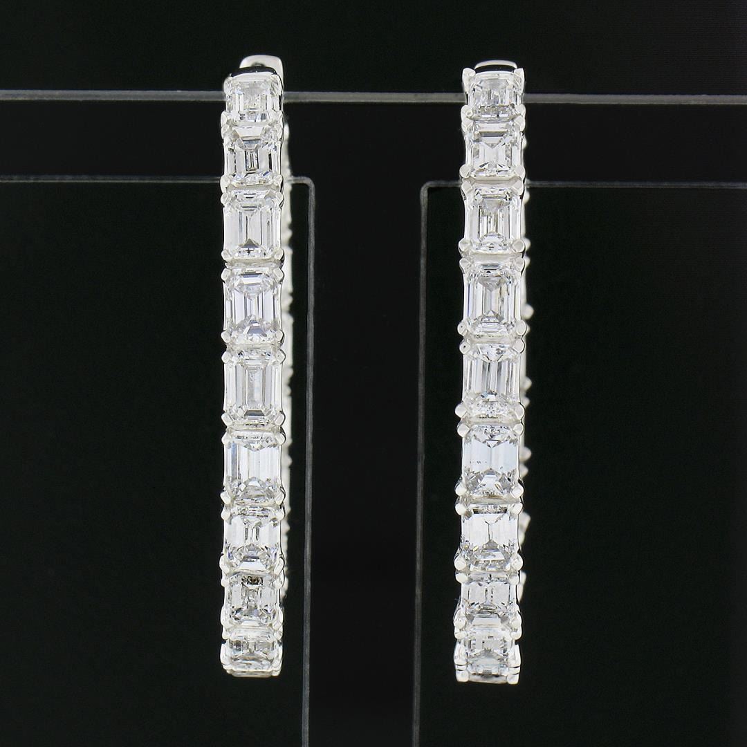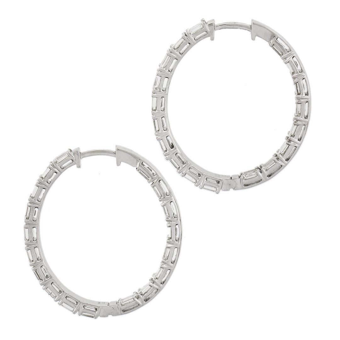 A new solid 14k white gold hoop earrings, with 36 emerald cut natural diamonds (G/H - VS1/VS2 w/ a few SI1 ; 5ctw). The earrings measure approximately 30.5x27.2mm and weigh a total of 7.19 grams.