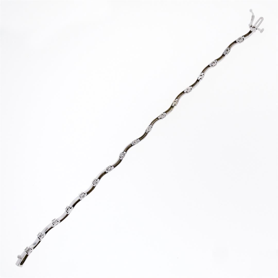 A new solid 14k white gold wavy station link bracelet, with It 18 round brilliant cut natural diamonds (F/G- VS1/VS2; 0.88ctw). weighs a total of 8.6 grams, measures 3.50mm wide, and measures 7 inches in length.