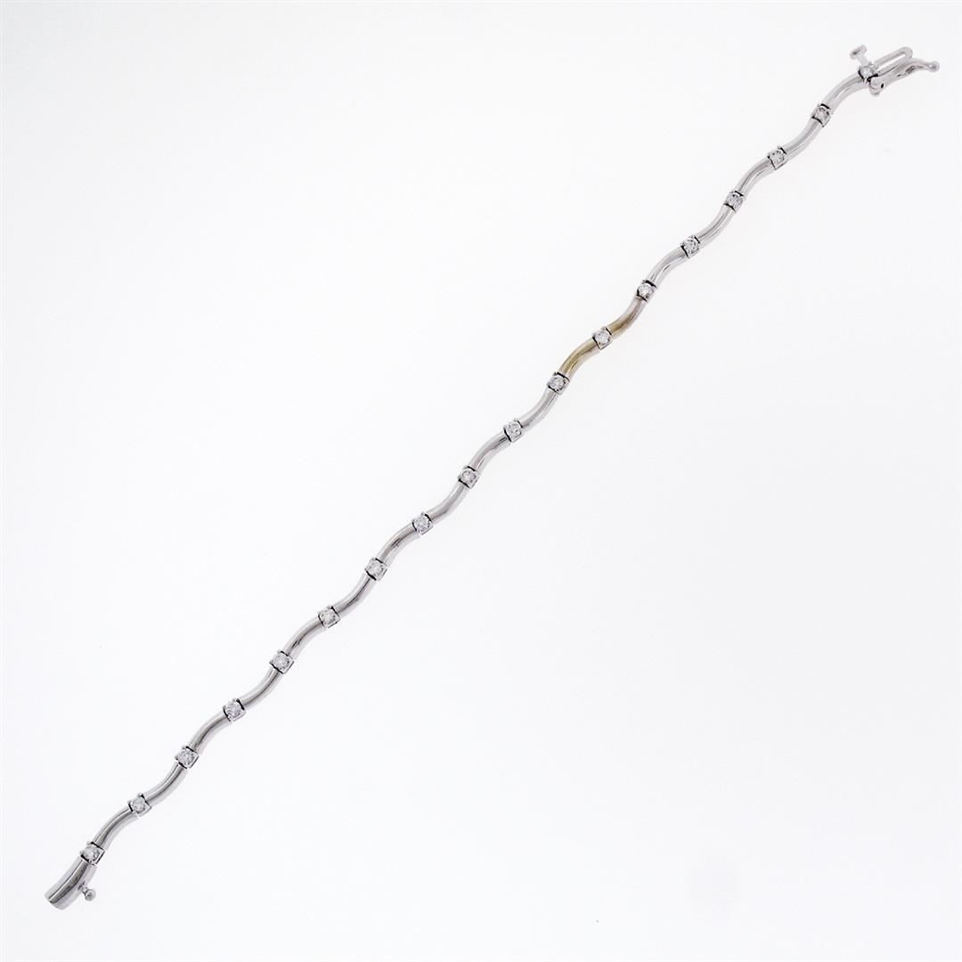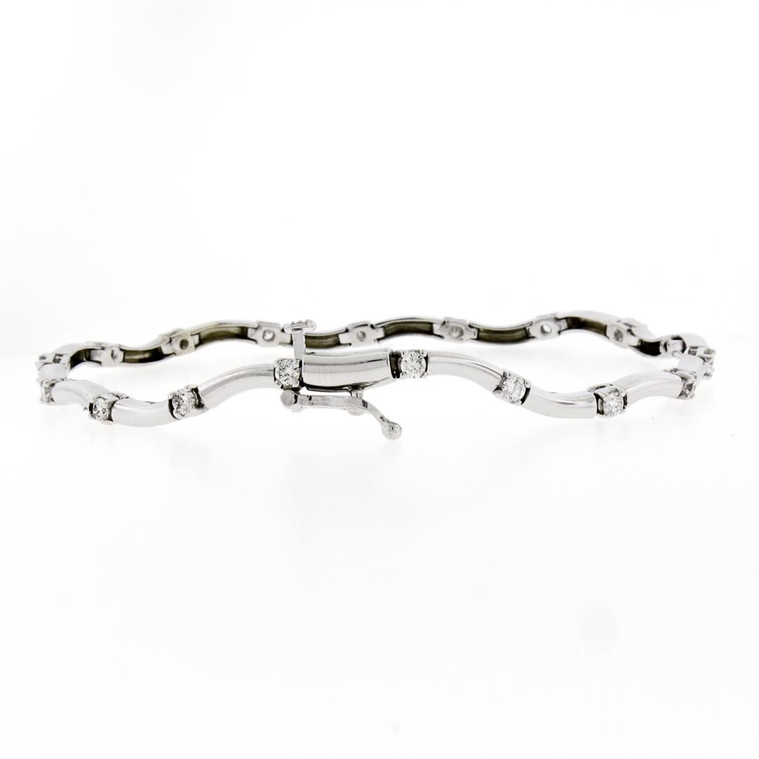A new solid 14k white gold wavy station link bracelet, with It 18 round brilliant cut natural diamonds (F/G- VS1/VS2; 0.88ctw). weighs a total of 8.6 grams, measures 3.50mm wide, and measures 7 inches in length.