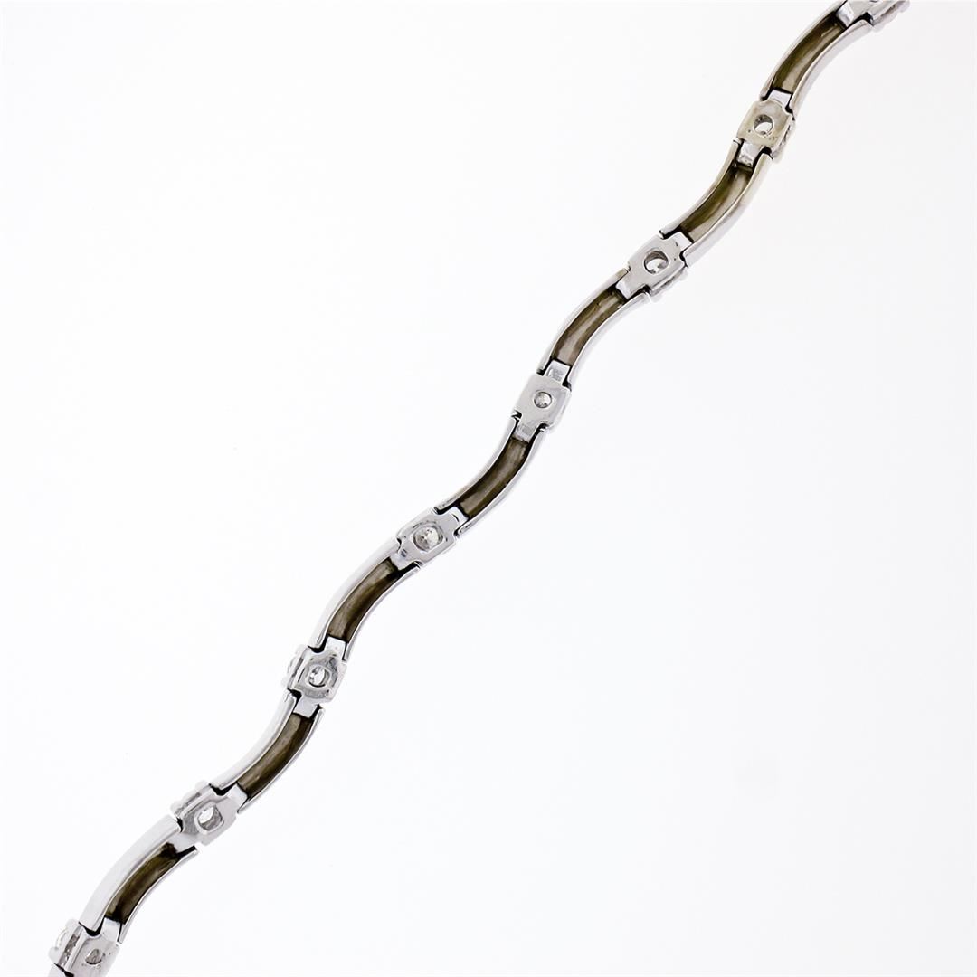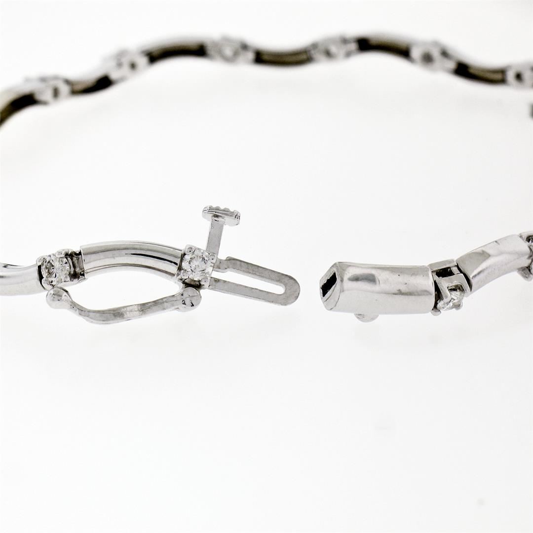A new solid 14k white gold wavy station link bracelet, with It 18 round brilliant cut natural diamonds (F/G- VS1/VS2; 0.88ctw). weighs a total of 8.6 grams, measures 3.50mm wide, and measures 7 inches in length.