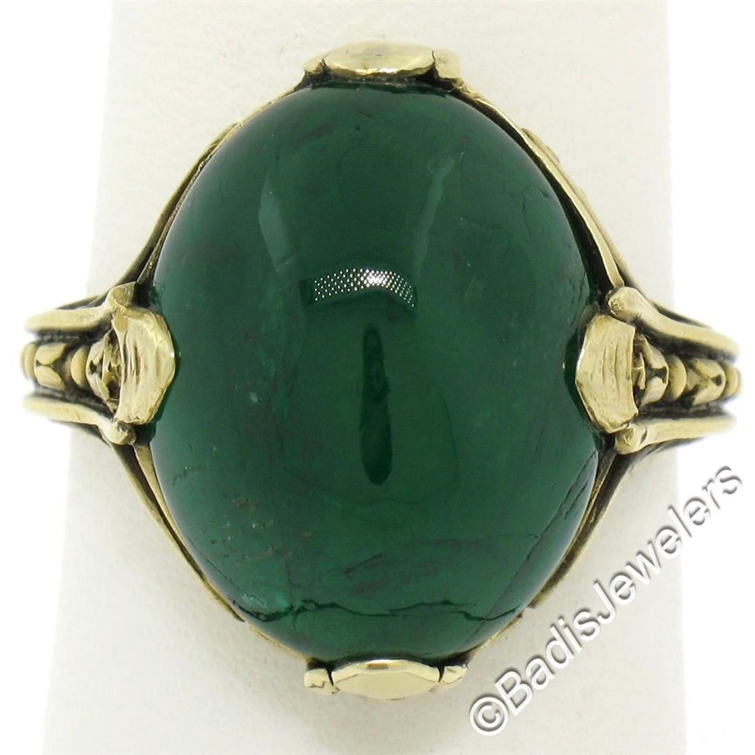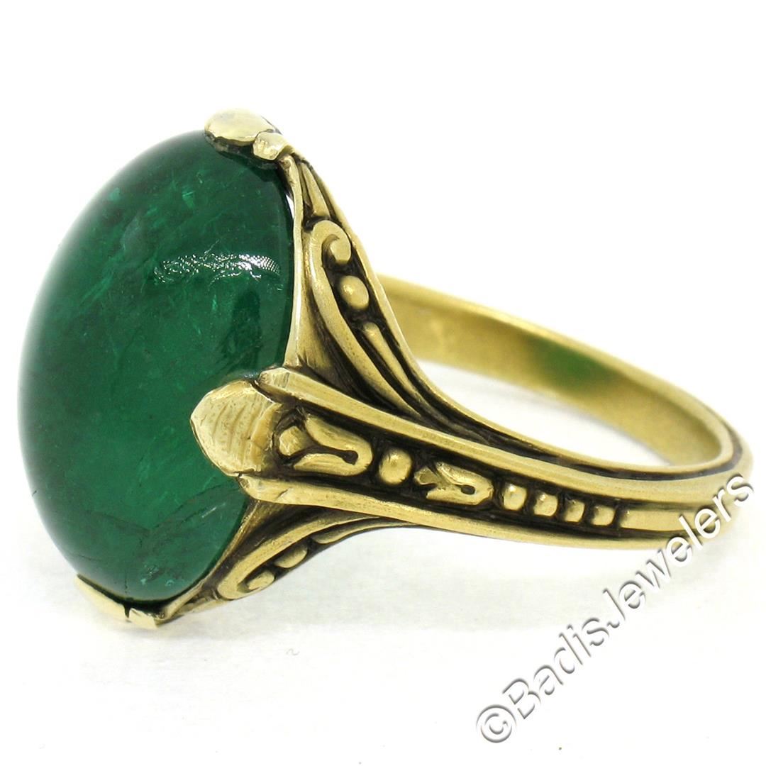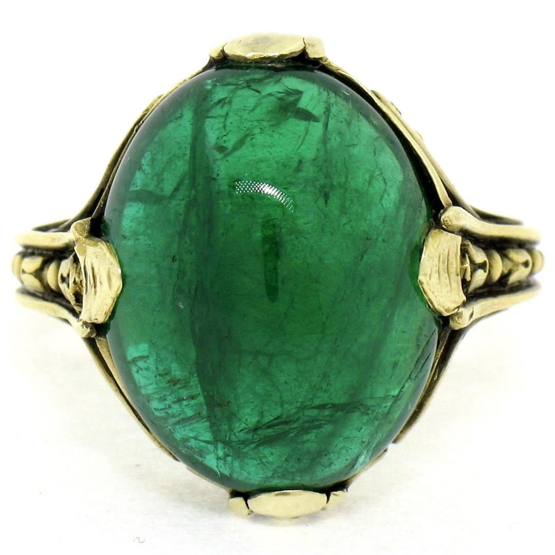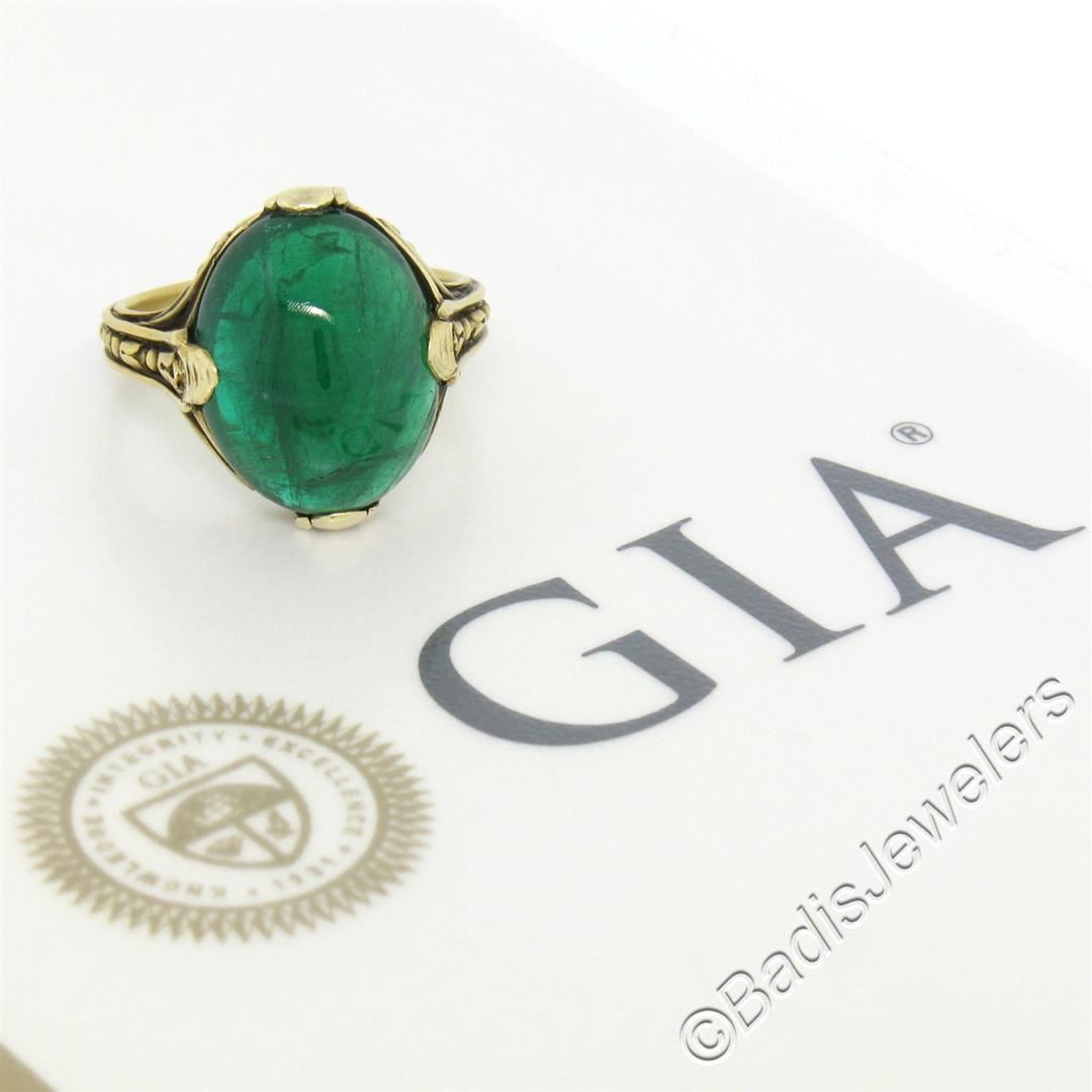 One Antique Etched 14K Yellow Gold 10.03ct GIA Oval Cabochon Zambian Emerald Ring. Item Details: Material: Solid 14K Yellow Gold, Weight: 6.70 Grams, Stone(s): (1) Natural Genuine Emerald - Prong Set - 10.03ct (approx. - based on GIA measurements), Ring Size: 6.5 (We can custom size this ring), Ring Width: 17.65mm (top of the ring) - 2.40mm (bottom of the shank), Ring Height: 8.0mm rise off the finger, Condition: Antique ring w/ gorgeous patina. MINT, 100% ready to wear condition! Comes with original GIA certification for center stone!, Certification Details, Laboratory: GIA, Report Number: 6183143712, Stone Type: Natural Beryl - Emerald, Stone Shape: Oval, Cutting Style: Cabochon, Transparency: Transparent, Measurements: 15.24 x 12.27 x 7.17 mm, Geographic Origin: Zambia, Treatment: Clarity Enhanced