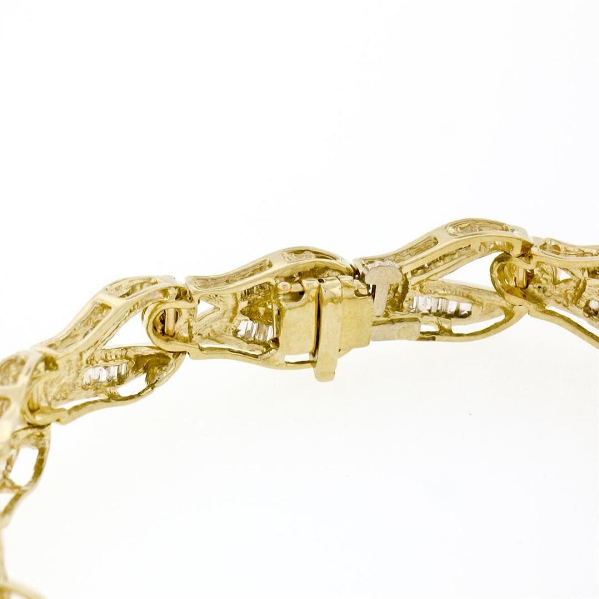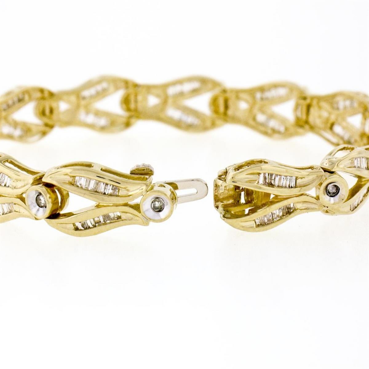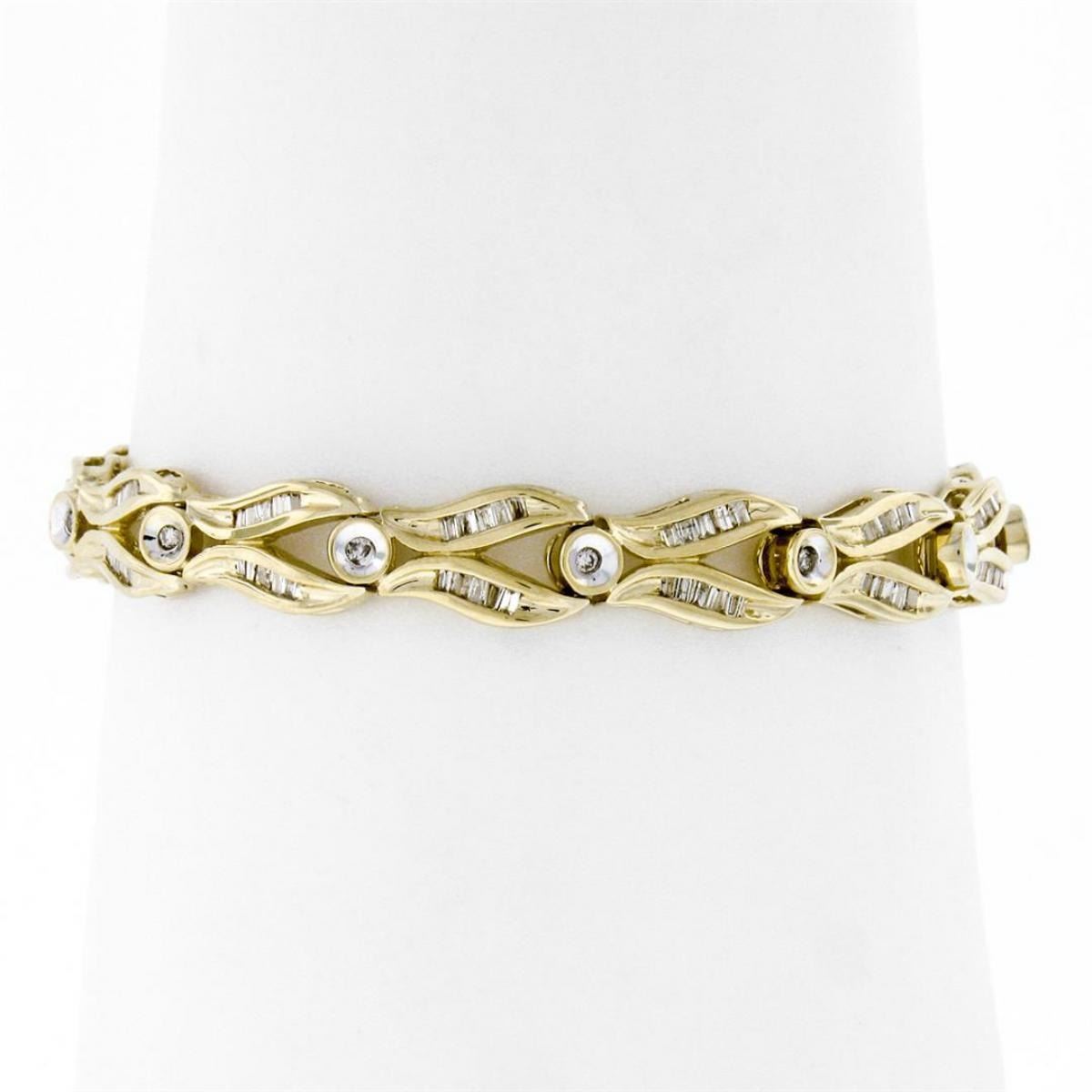 One 14K Yellow Gold 2.25ct Baguette Round Diamond Split & Bezel Link Tennis Bracelet. Item Details: Material: 14K Solid Yellow Gold, Weight: 17.97 Grams, Stone(s): (140) Natural Genuine Diamonds - Straight and Tapered Baguette Cut - Channel Set - SI2/I1 Clarity - I/J Color - 1.90ctw (approx.), (14) Natural Genuine Diamonds - Round Brilliant Cut - Bezel Set - SI2/I1 Clarity - I/J Color - 0.35ctw (approx.), Total Carat Weight: 2.25 (exact), Chain Type: Unique Split Link w/ Round, Bezel Stations, Chain Length: Fits up to 7 1/4 inch wrist, Clasp: Push clasp w/ fold under safety latch, Width: 8.45mm, Thickness: 3.55mm rise off the wrist, Condition: Like New!