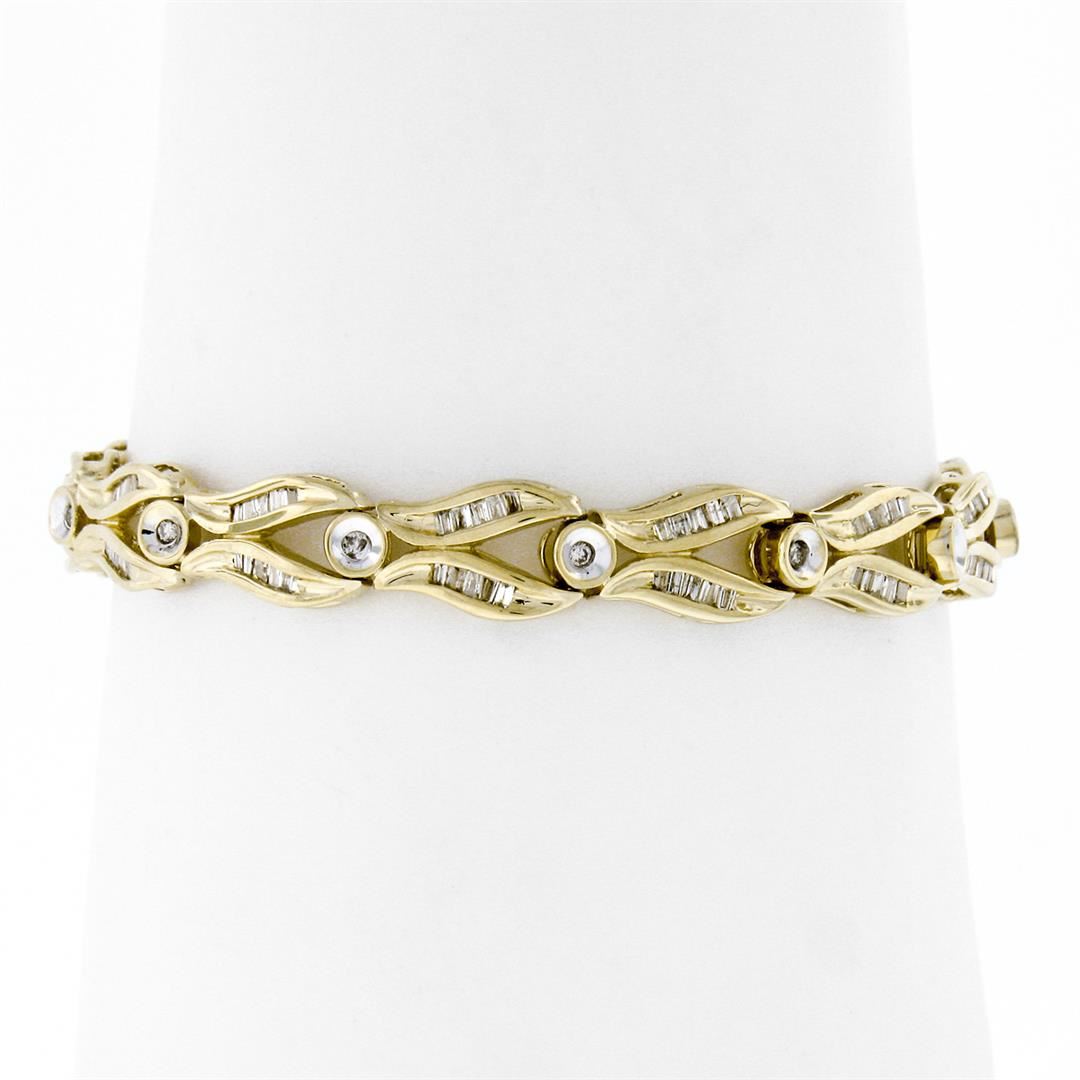 One 14K Yellow Gold 2.25ct Baguette Round Diamond Split & Bezel Link Tennis Bracelet. Item Details: Material: 14K Solid Yellow Gold, Weight: 17.97 Grams, Stone(s): (140) Natural Genuine Diamonds - Straight and Tapered Baguette Cut - Channel Set - SI2/I1 Clarity - I/J Color - 1.90ctw (approx.), (14) Natural Genuine Diamonds - Round Brilliant Cut - Bezel Set - SI2/I1 Clarity - I/J Color - 0.35ctw (approx.), Total Carat Weight: 2.25 (exact), Chain Type: Unique Split Link w/ Round, Bezel Stations, Chain Length: Fits up to 7 1/4 inch wrist, Clasp: Push clasp w/ fold under safety latch, Width: 8.45mm, Thickness: 3.55mm rise off the wrist, Condition: Like New!