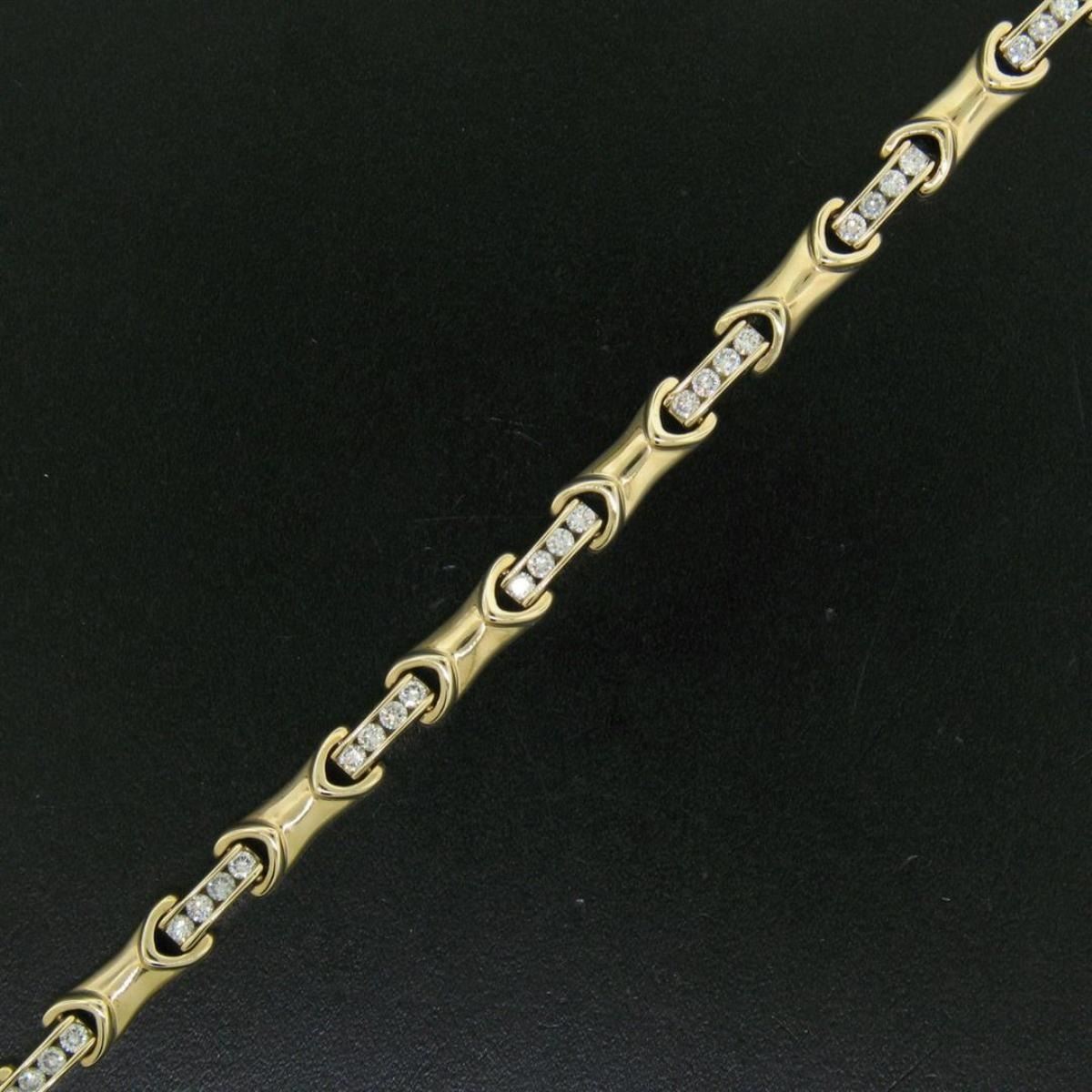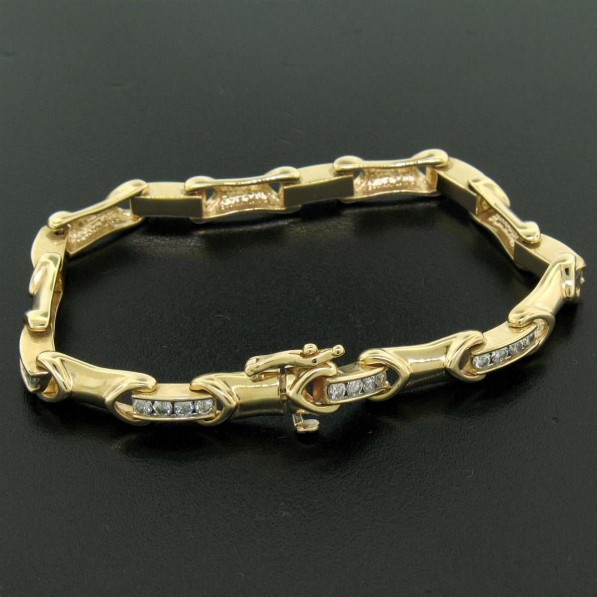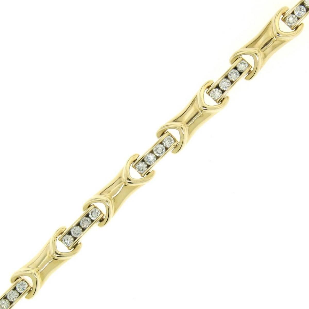 One 14K Yellow Gold 7" 2.16ctw Channel Set Round Brilliant Diamond Tennis Bracelet. Item Details: Material: 14k Solid Yellow Gold, Weight: 17.06 Grams, Stone(s): (36) Natural Genuine Diamonds - Round Brilliant Cut - Channel Set - VS2 Clarity - G/H Color, Total Carat Weight: 2.16 (approx.), Length: 7 Inches, Clasp: Push Clasp w/ Safety Latch, Width: 6mm at the Yellow Gold Bars, Height: 4.17mm Condition: Like New!