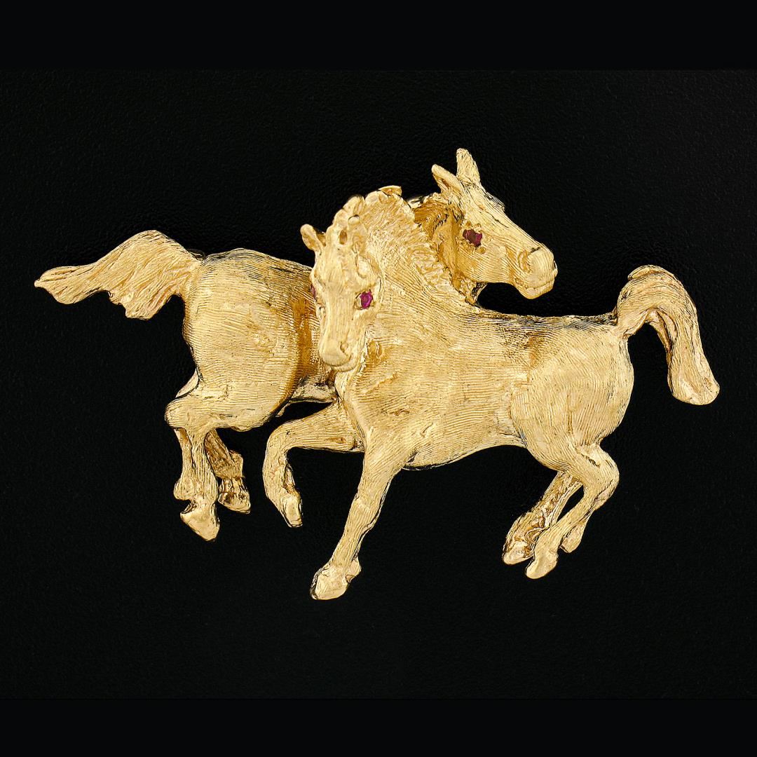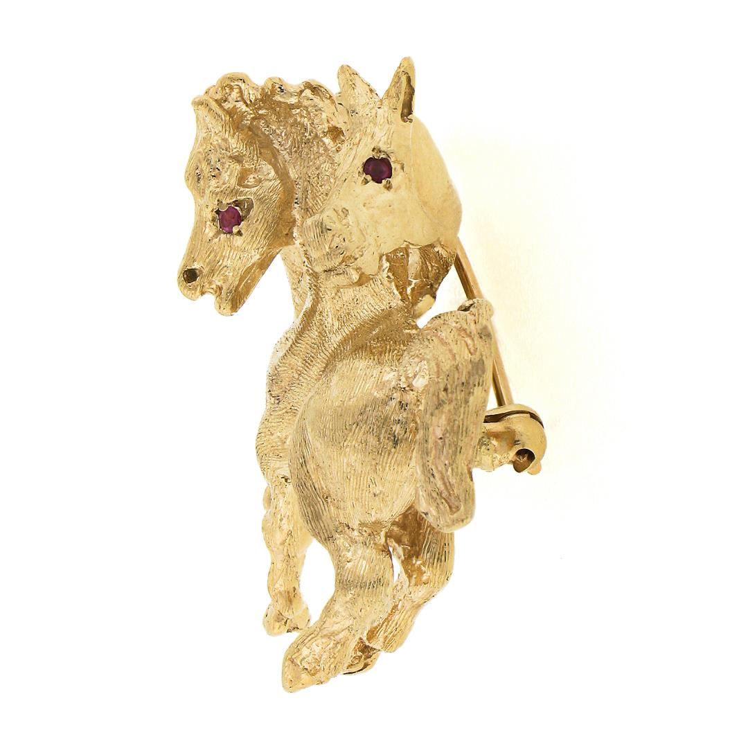 A solid 14k yellow gold brooch, with 4 round cut natural rubies (0.06ctw). Measures 35.7x52.50mm and weighs a total of 17.74 grams.