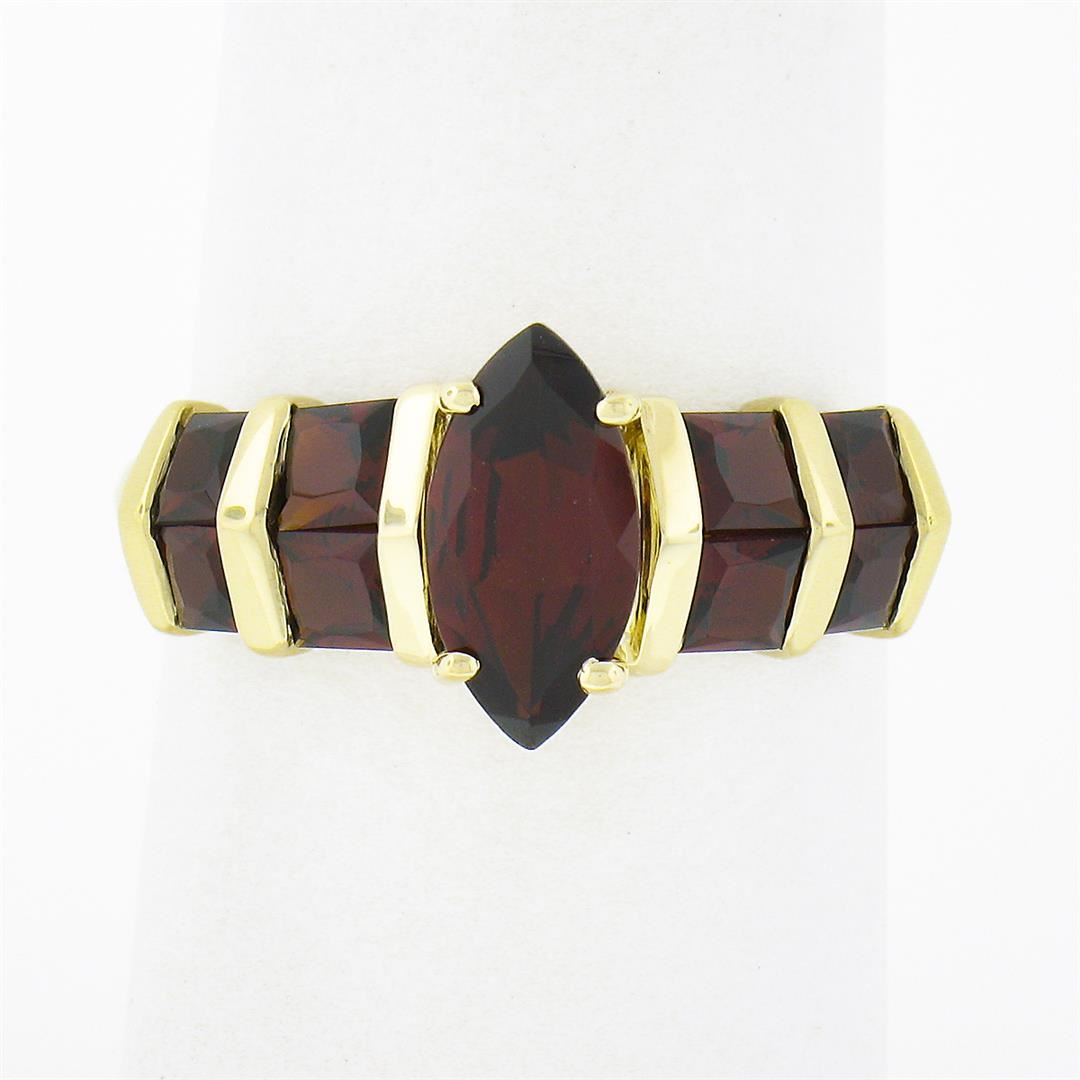 A solid 14k yellow gold ring, with 1 marquise brilliant cut natural garnet (9.9x5.0mm), and 8 square faceted cut natural garnets (2.7x2.7mm each). The ring is size 7.0, weighs a total of 2.60 grams, and measures 9.9mm wide.