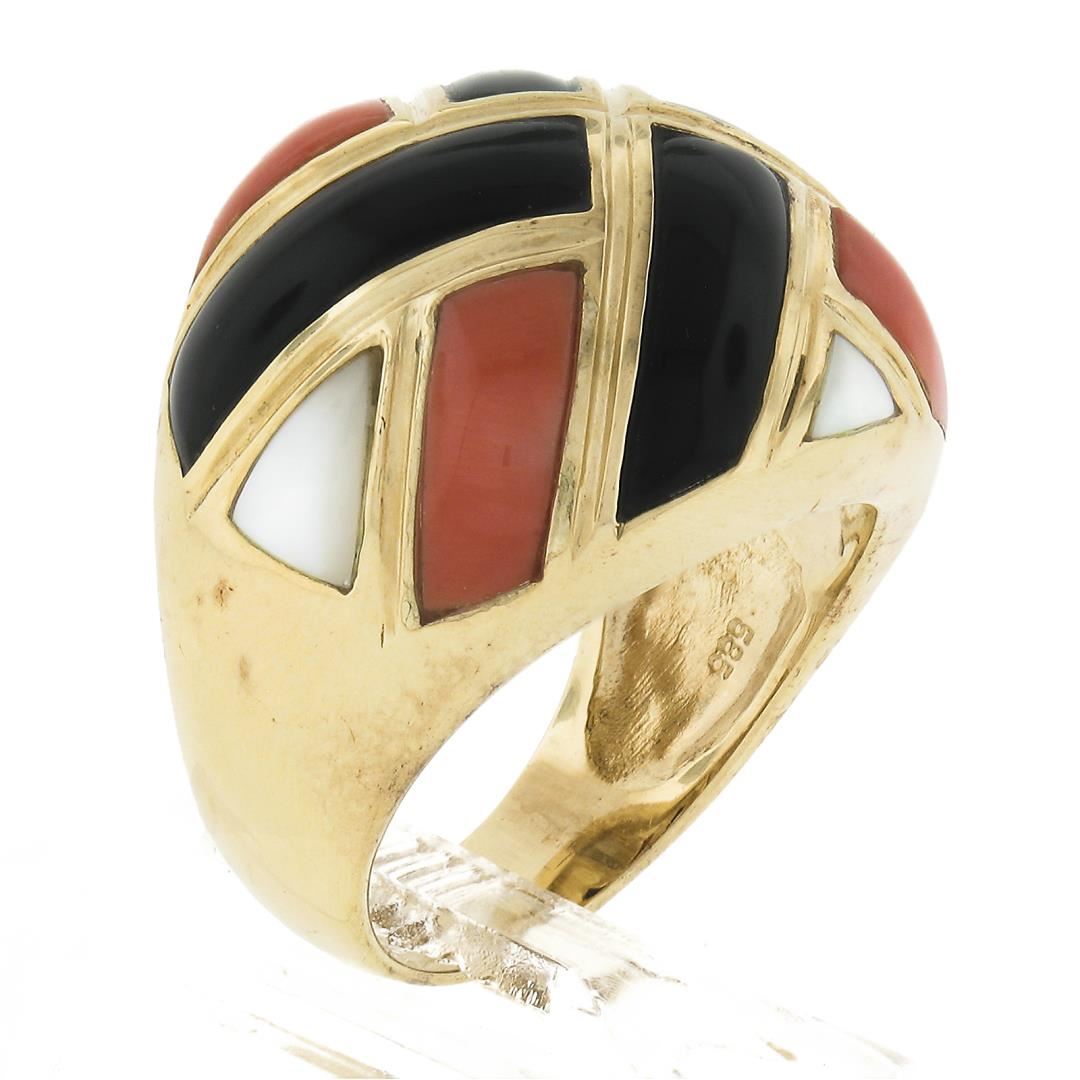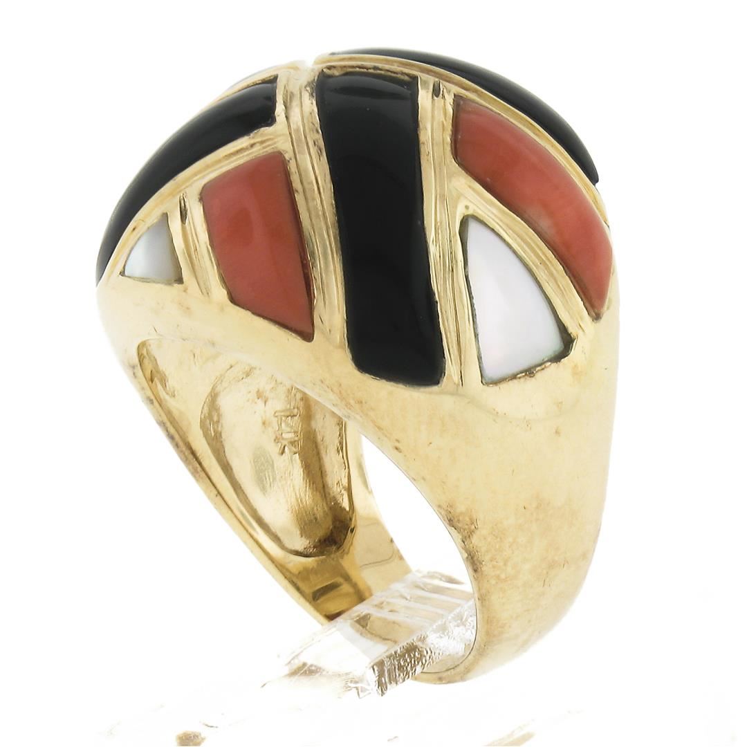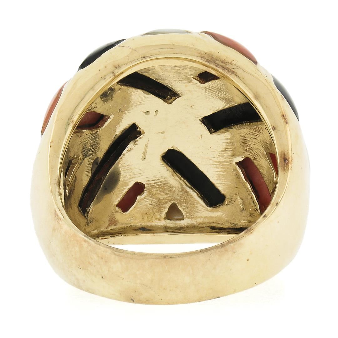 A solid 14k yellow gold domed ring with 4 custom cut natural balck onyx, 4 custom cut genuine mother of pearls, and 4 custom cut natural corals.The ring is size 6.5, weighs a total of 11.88 grams, and measures 19.4mm wide.