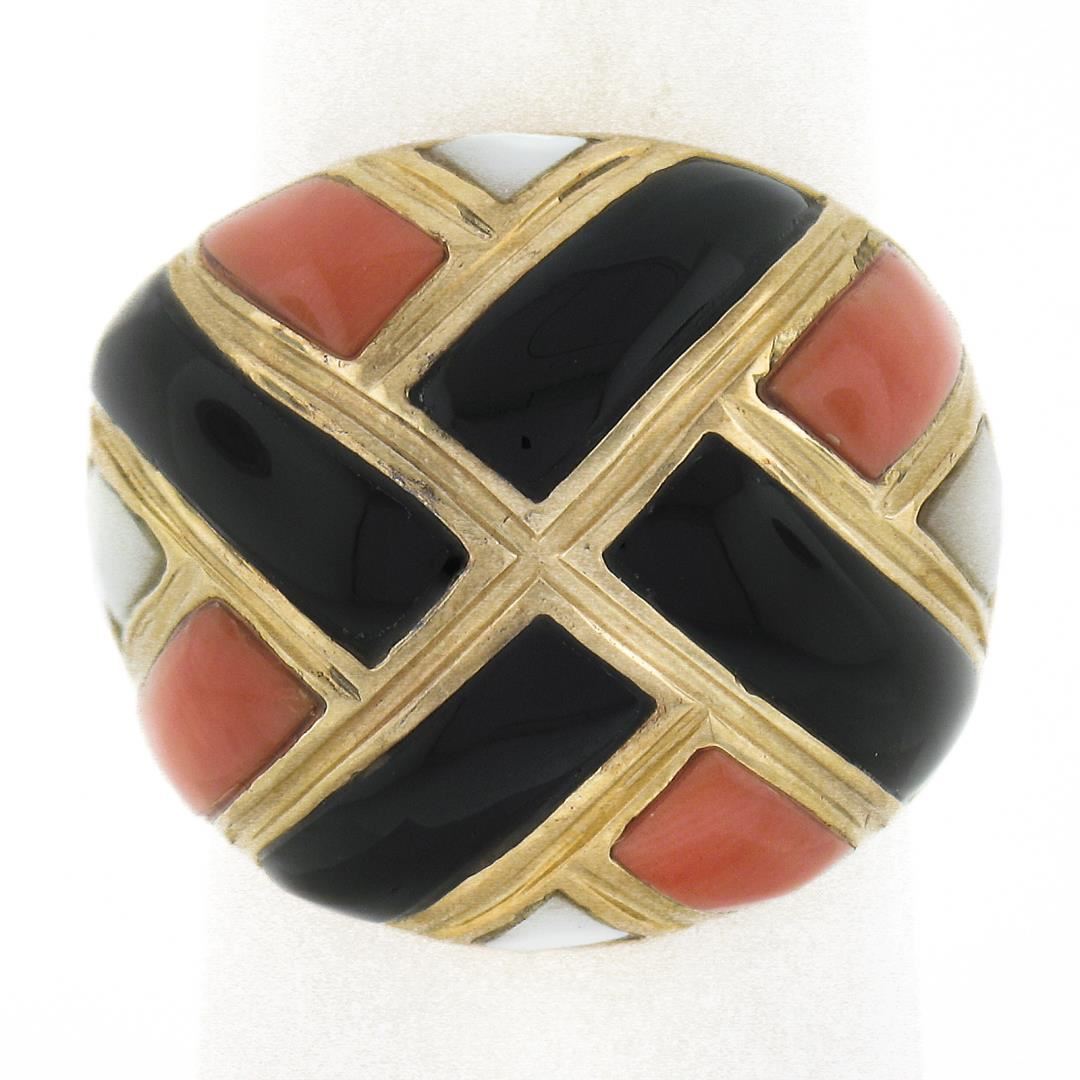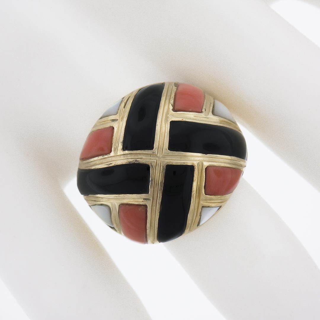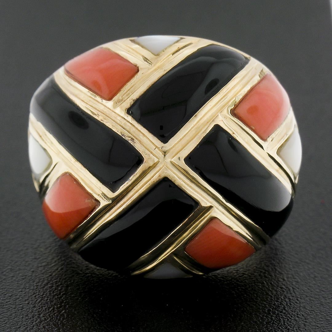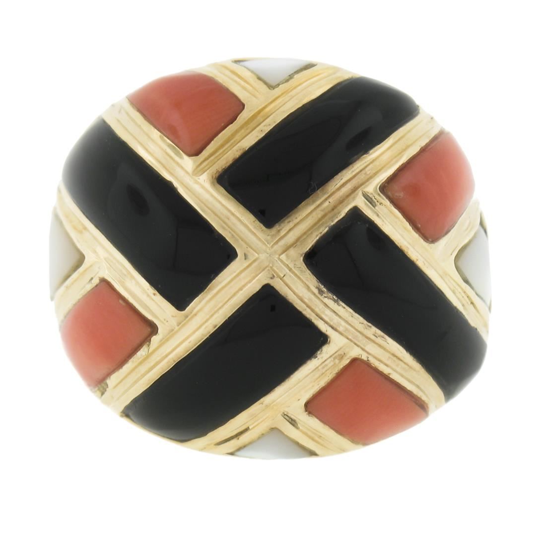 A solid 14k yellow gold domed ring with 4 custom cut natural balck onyx, 4 custom cut genuine mother of pearls, and 4 custom cut natural corals.The ring is size 6.5, weighs a total of 11.88 grams, and measures 19.4mm wide.