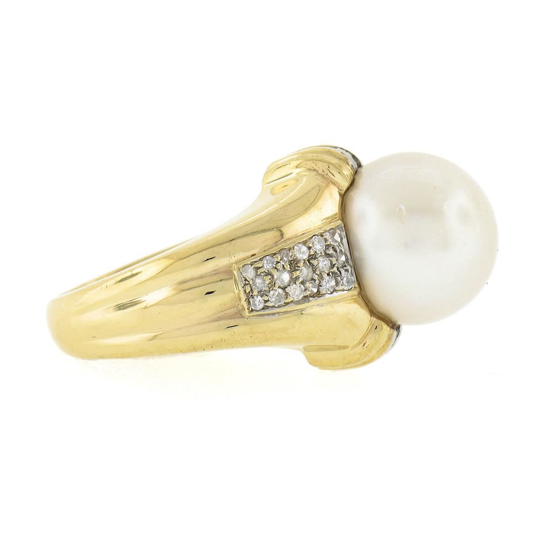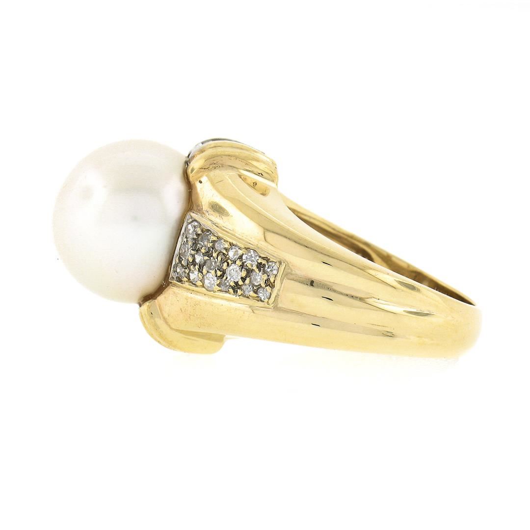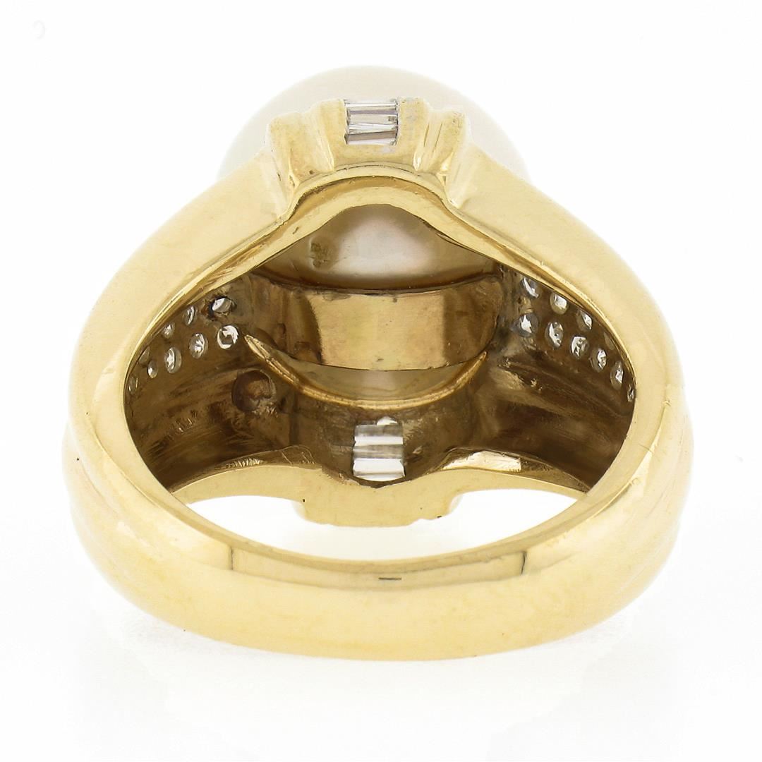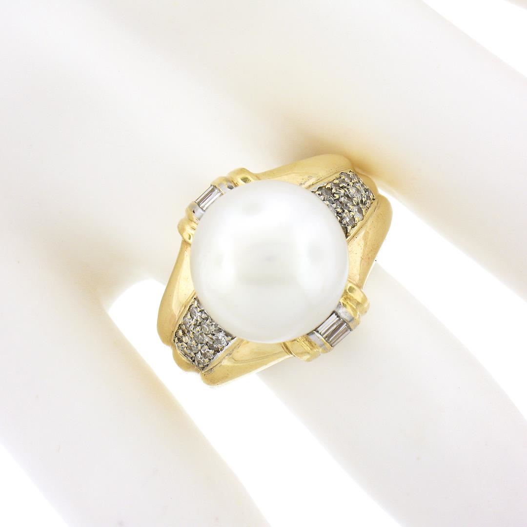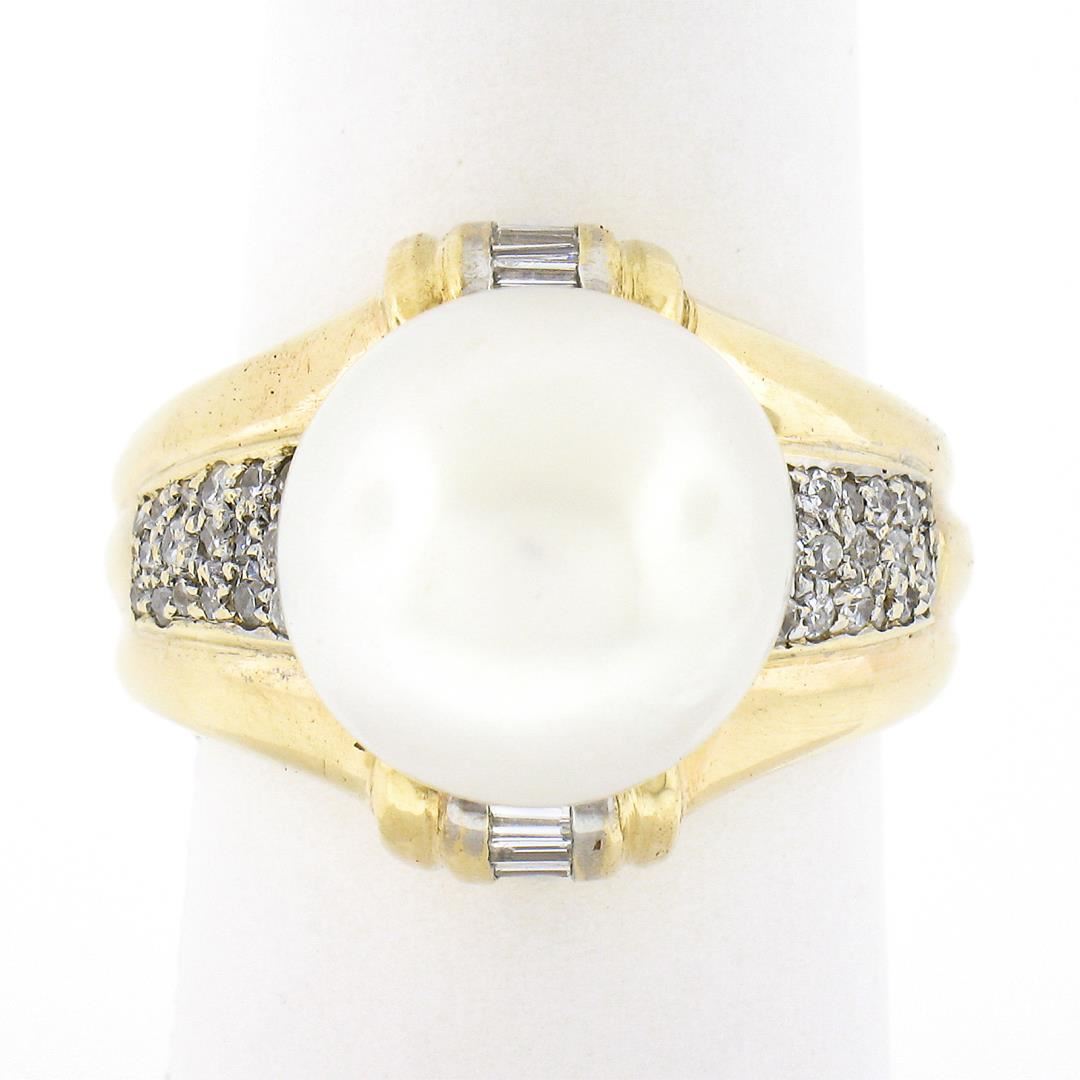 A solid 14k yellow gold ring, with 1 large round shape cultured south sea pearl (12.58mm), and 32 round brilliant w/ 12 baguette cut natural diamonds (G/H Color - SI1-I2 ; 0.56ctw). The ring is size 7.5, weighs a total of 10.80 grams, and measures 16.35mm wide.
