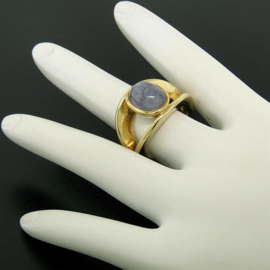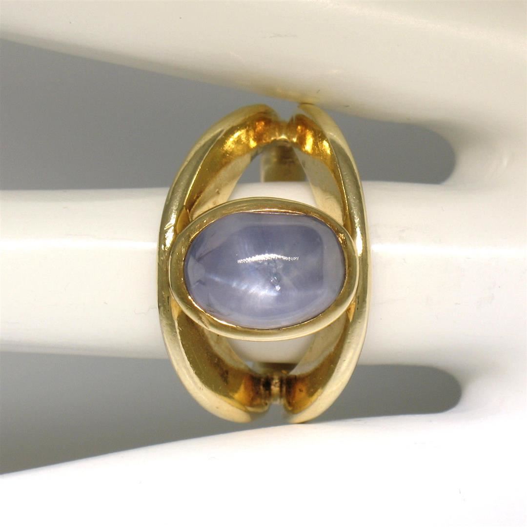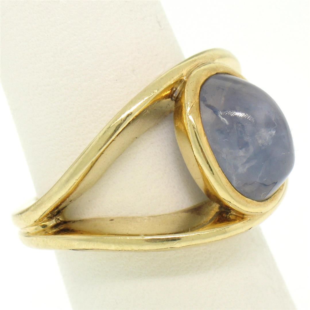 One Vintage 14K Yellow Gold Split Shank Bezel Cabochon Blue Star Sapphire Mens Ring. Item Details: Material: 14K Solid Yellow Gold, Weight: 12.5 Grams, Stone(s): (1) Natural Genuine Star Sapphire - Oval Cabochon Cut - Bezel Set - Gray Color - 11.5x8.3mm (approx.), Ring Size: 6.5, Ring Width: 15.6mm, Ring Height: 10mm rise off the finger, Condition: Vintage piece. Excellent, ready to wear condition.,