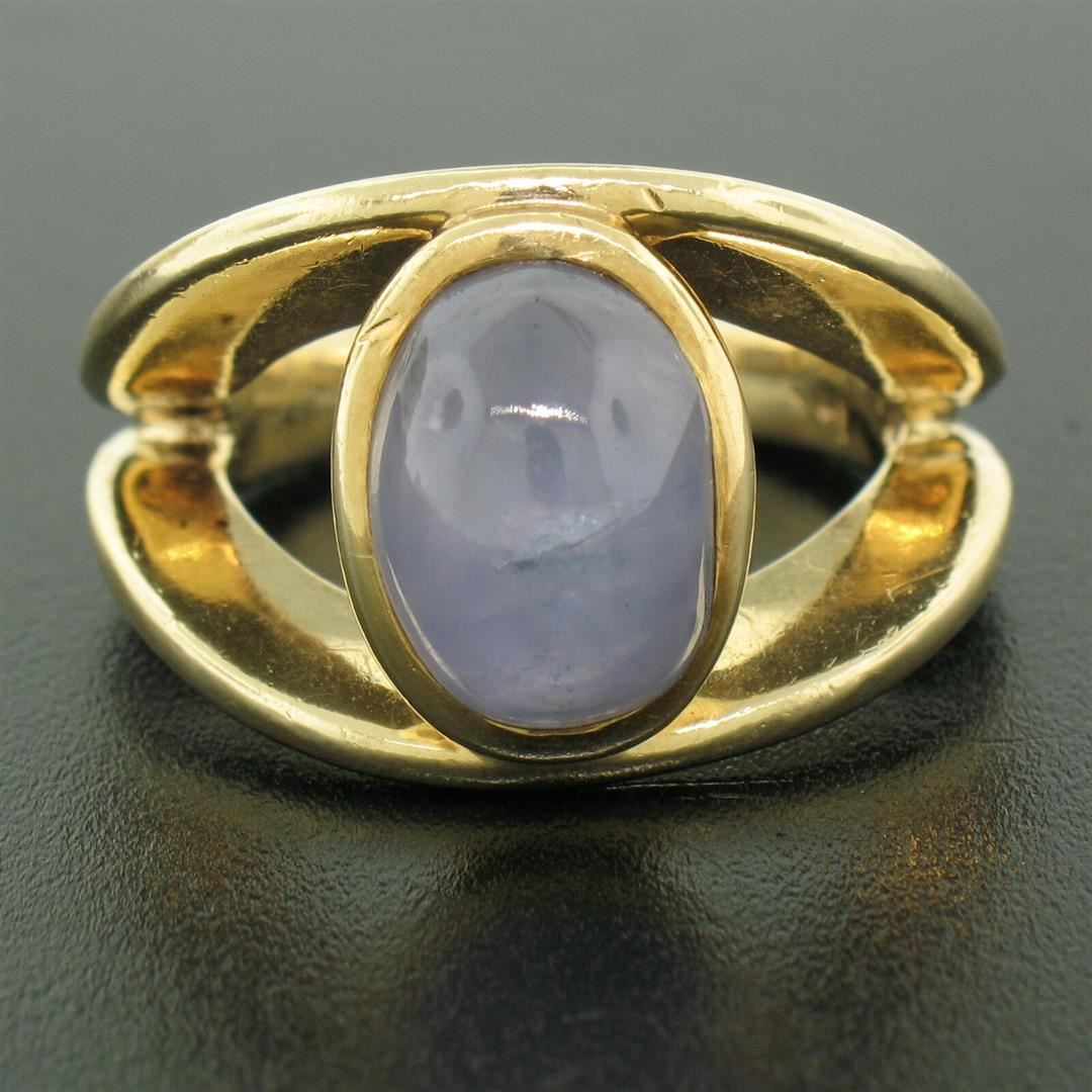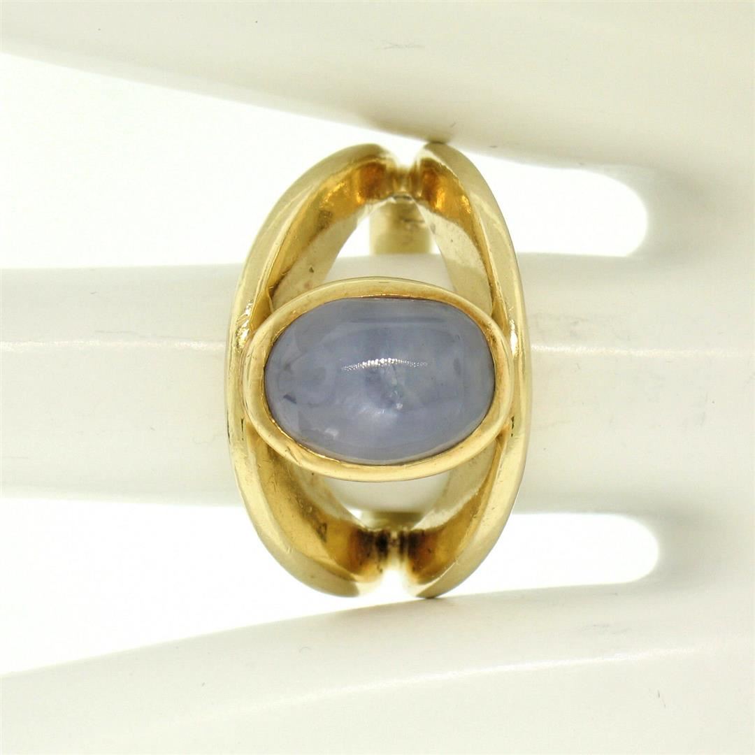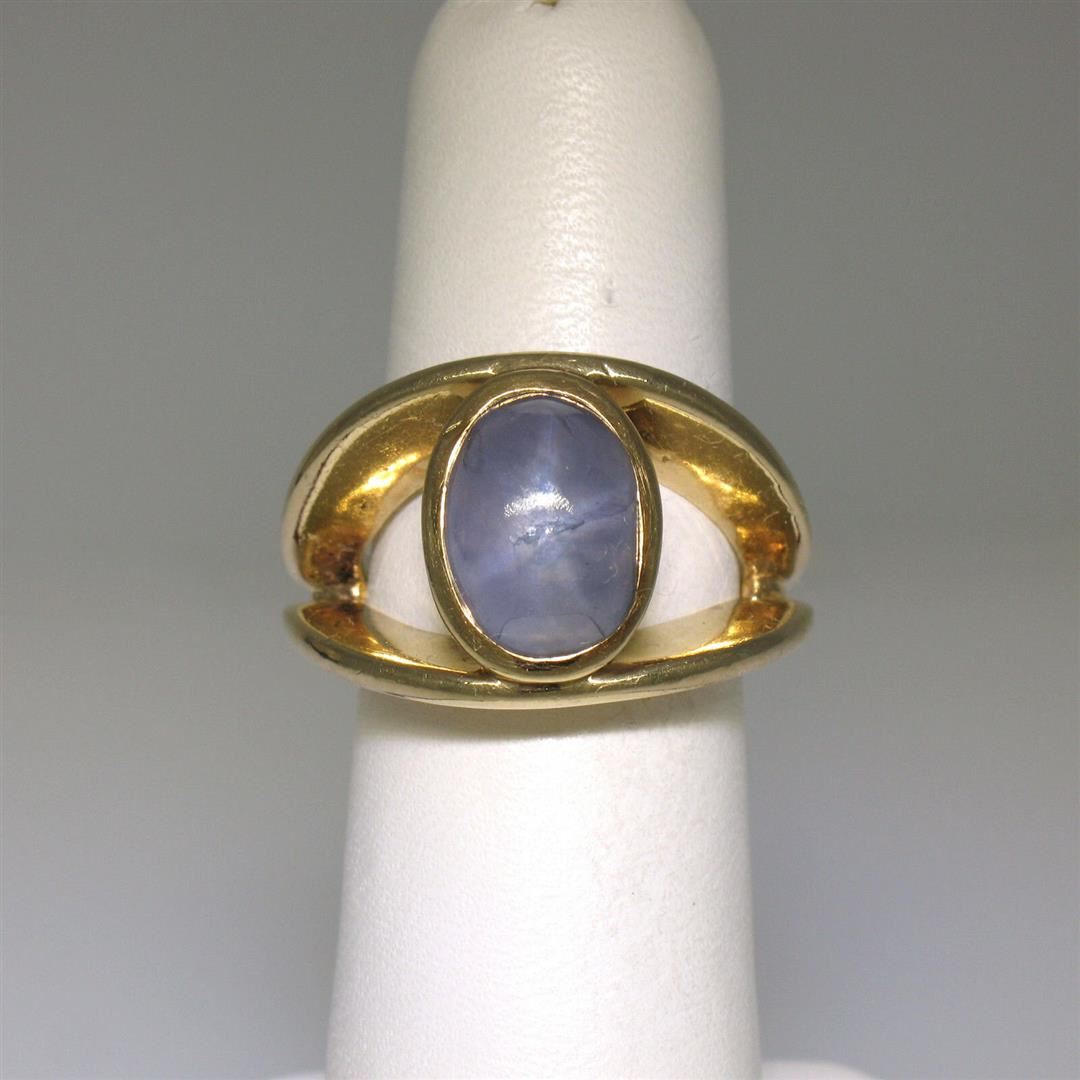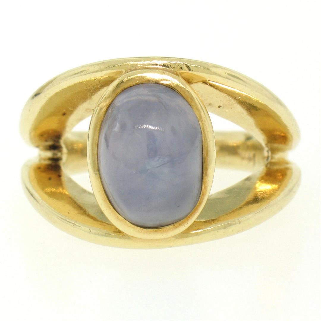 One Vintage 14K Yellow Gold Split Shank Bezel Cabochon Blue Star Sapphire Mens Ring. Item Details: Material: 14K Solid Yellow Gold, Weight: 12.5 Grams, Stone(s): (1) Natural Genuine Star Sapphire - Oval Cabochon Cut - Bezel Set - Gray Color - 11.5x8.3mm (approx.), Ring Size: 6.5, Ring Width: 15.6mm, Ring Height: 10mm rise off the finger, Condition: Vintage piece. Excellent, ready to wear condition.,