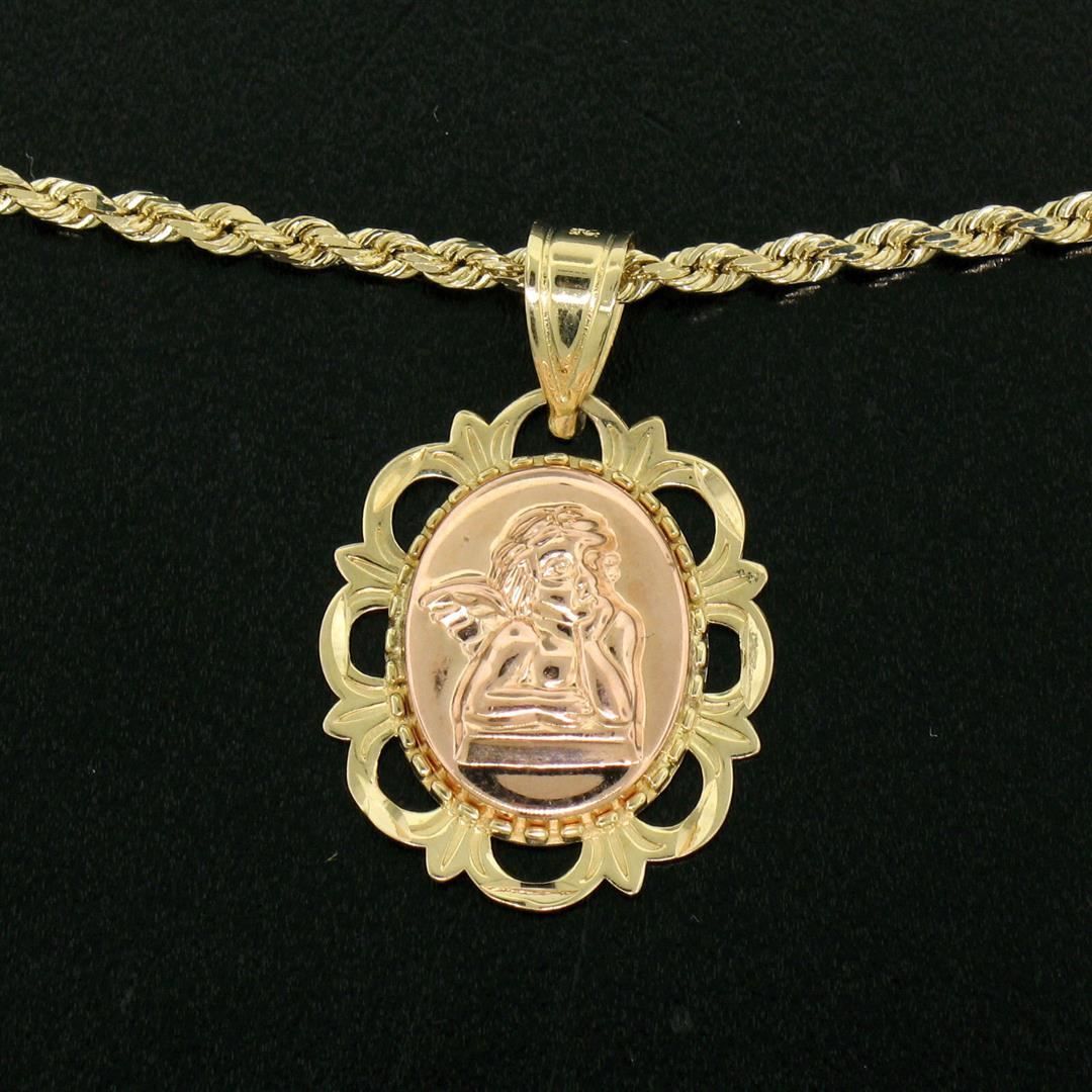 14K Yellow & Rose Gold Guardian Angel God Prayer Pendant 18" Rope Chain Necklace