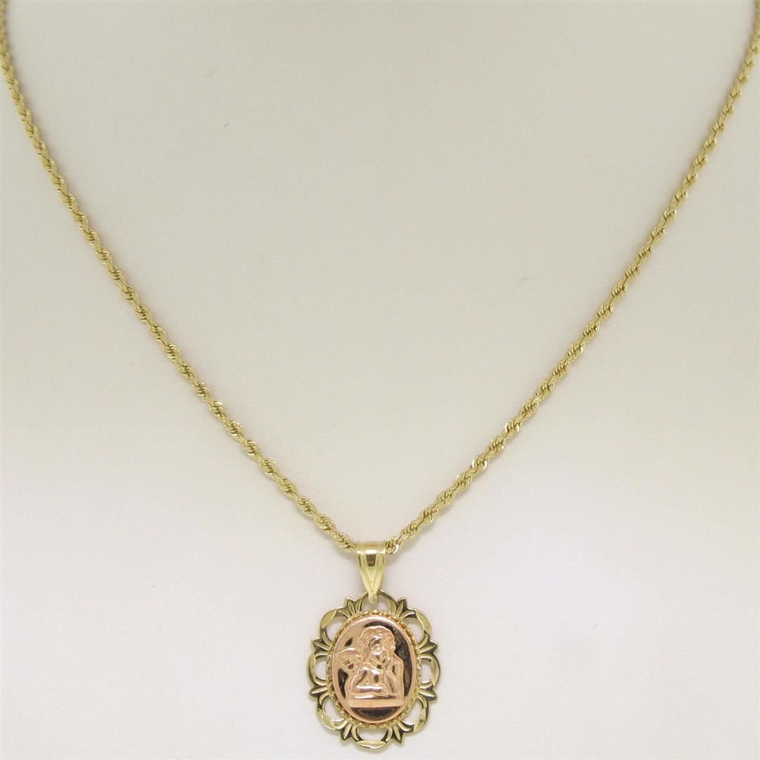 One 14K Yellow & Rose Gold Guardian Angel of God Prayer Pendant w/ 18" Rope Necklace. Item Details: Material: 14K Solid Yellow & Rose Gold, Weight: 6.8 Grams, Chain Type: 1.9mm Rope Link, Chain Length: 18 Inches, Clasp: Lobster Claw, Width: 16.15mm, Height (w/ Bail): 24.7mm, Height (w/o Bail): 19.15mm Thickness: 3.33mm Condition: Like New!