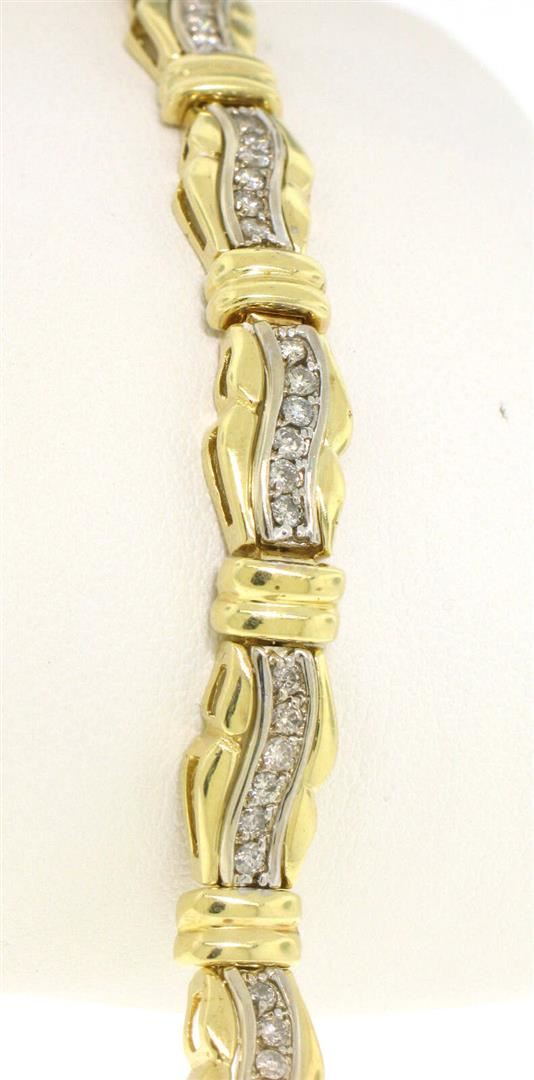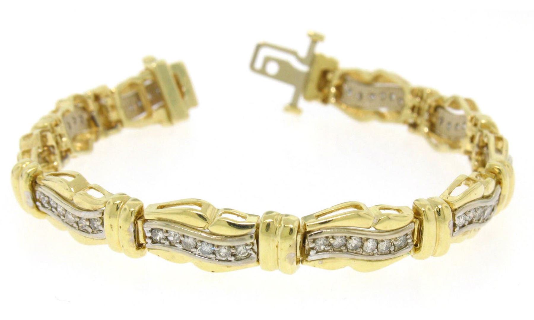 An Estate solid 14k yellow and white gold wavy bracelet, with 60 round brilliant cut natural diamonds (G/H - SI1 ; 1.50ctw). It weighs a total of 19.0 grams, measures 7.84mm wide, and measures 6.75 inches in length.