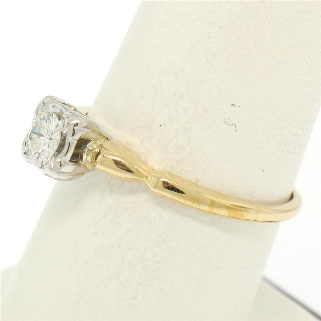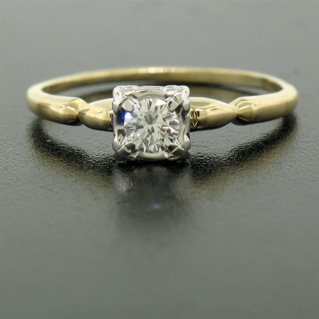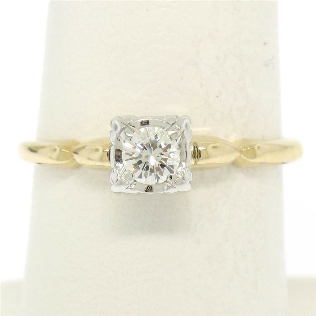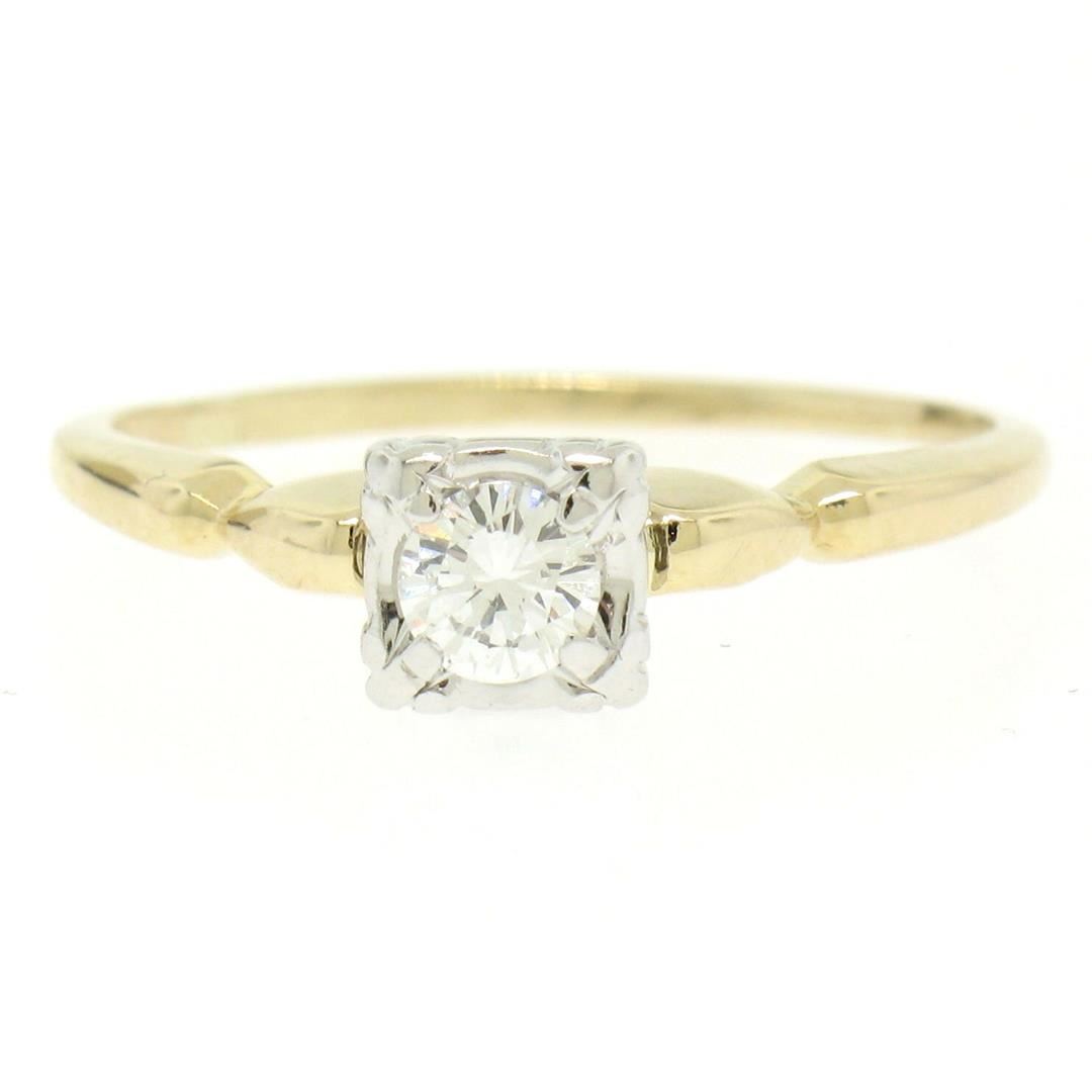 One Vintage 14K Yellow & White Gold Illusion Prong Set 0.25ct Diamond Solitaire Ring. Item Details: Material: 14k Solid Yellow and White Gold, Weight: 2.40 Grams, Stone(s): (1) Natural Genuine Diamond - Round Brilliant Cut - Illusion Prong Set - F Color - VS1 Clarity, Total Carat Weight: 0.25 (approx.), Ring Size: 8.0 (We can custom size this ring.), Ring Width: 5.50mm, Ring Height: 6.50mm rise off the finger, Condition: Vintage piece. Excellent, ready to wear condition!