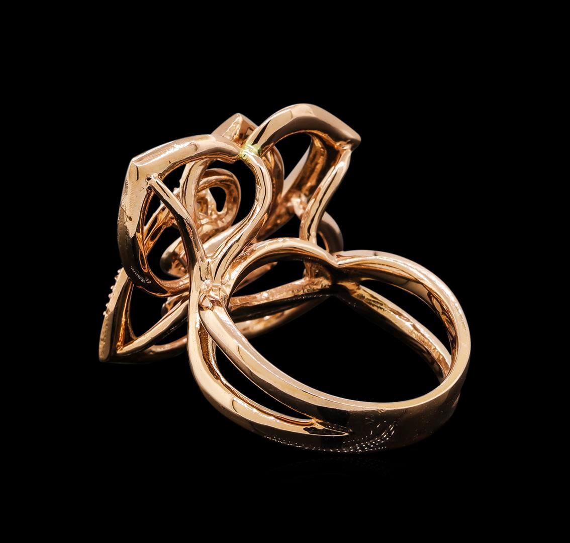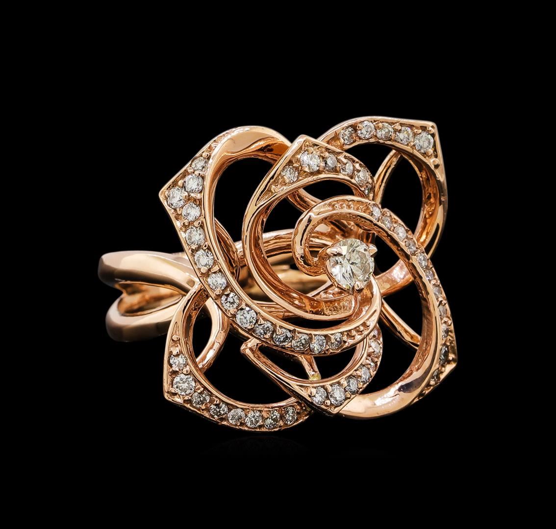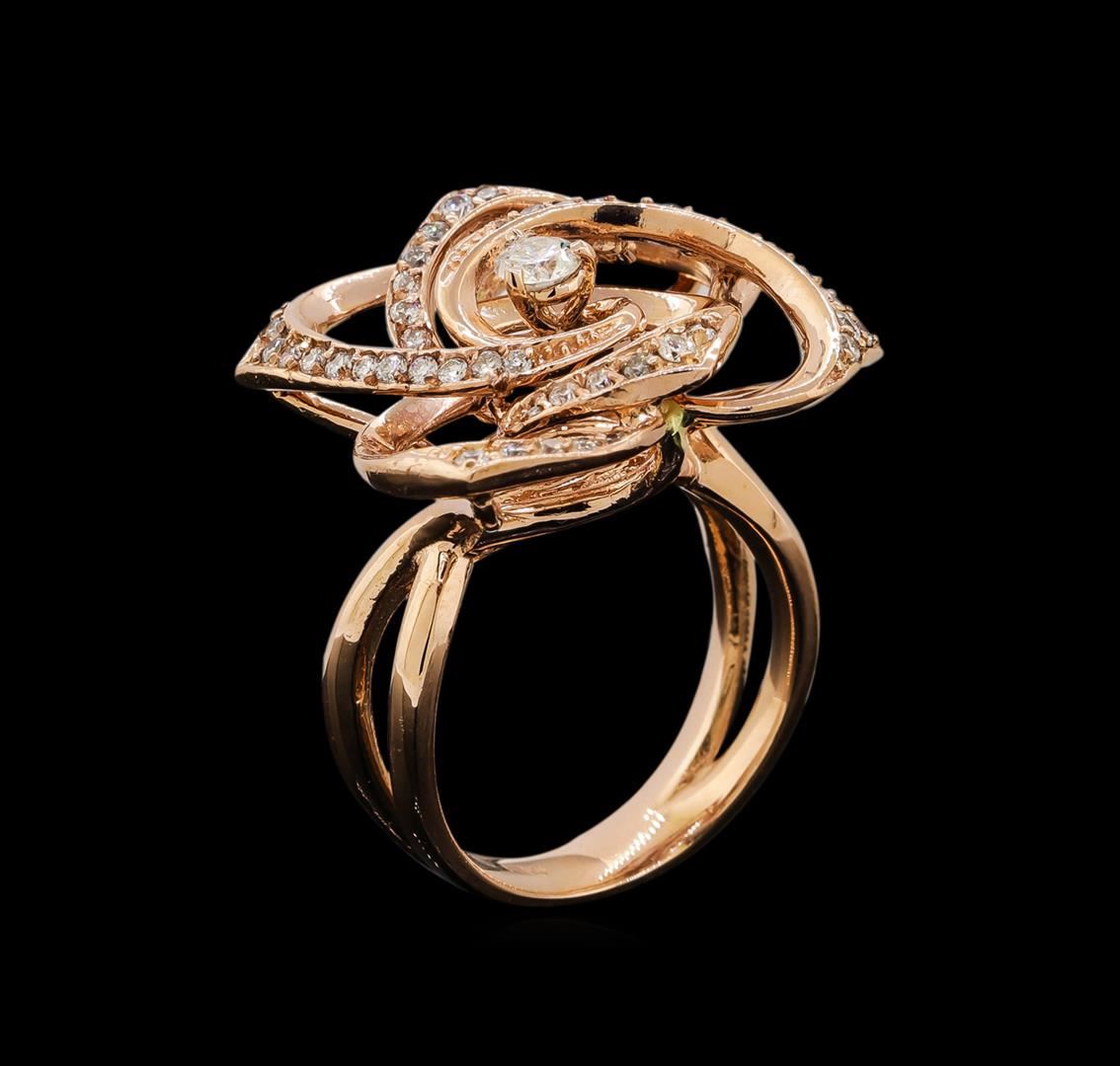 One electronically tested 14KT rose gold ladies combination cast & assembled diamond ring with a bright polish finish. Identified with markings of "K14". Condition is new. Containing: One prong set round brilliant cut diamond, measuring 3.40 - 3.40 x 2.04mm (depth est.) approximate weight of 0.14ct. Clarity: SI-2. Color: K, Cut is Good. Fifty prong set round brilliant cut diamonds, measuring 1.30 - 1.00 x 0.69mm (depth est.) approximate total weight of 50 Stones = 0.28ct. Clarity: SI-2 to I-1. Color: I, Cut is Good. All diamonds are graded in the mounting, unless otherwise stated. Total Weight of Diamonds 0.42ct. Total Weight of Ring 10.70 grams. GGL Appraised.