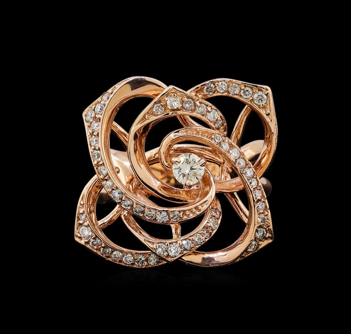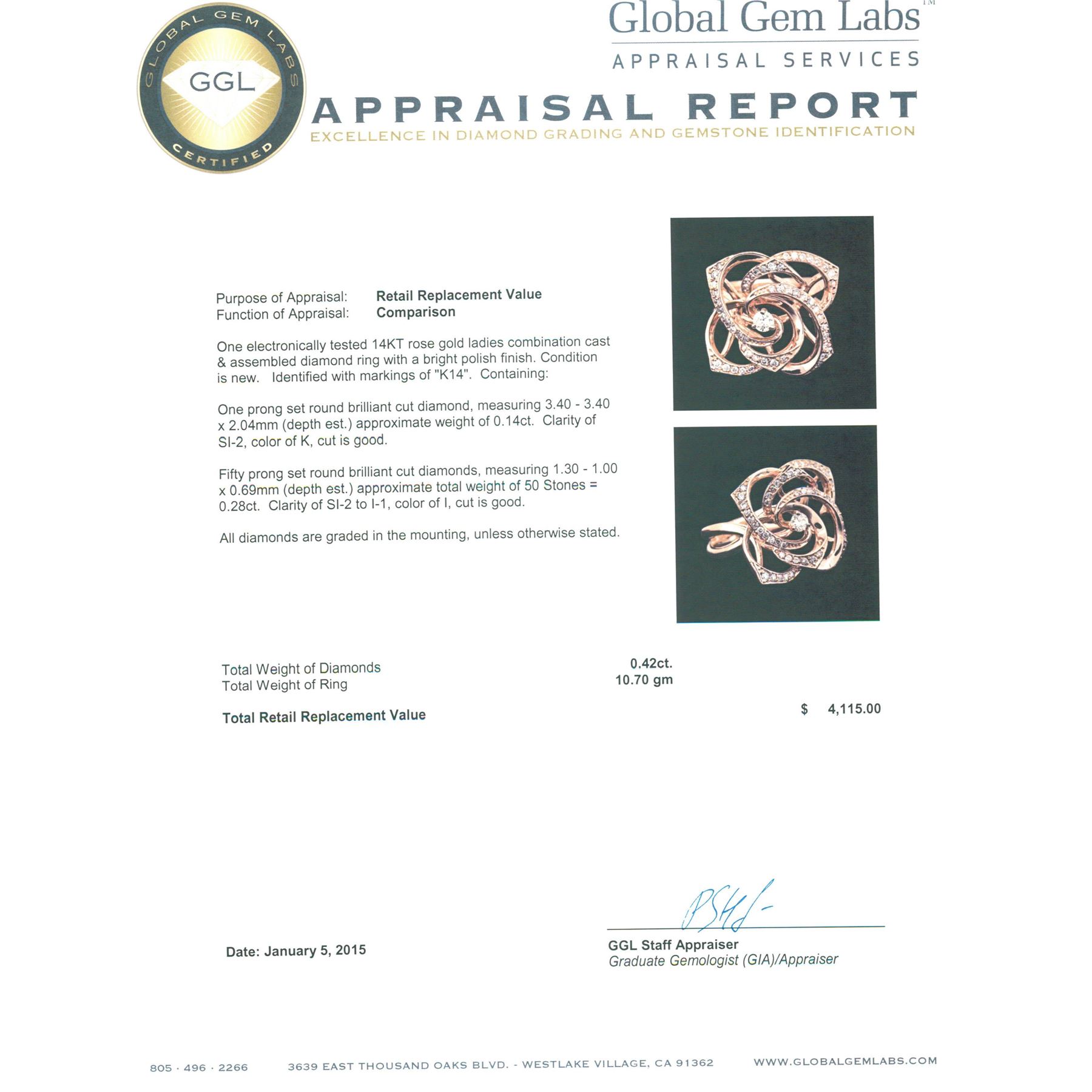 One electronically tested 14KT rose gold ladies combination cast & assembled diamond ring with a bright polish finish. Identified with markings of "K14". Condition is new. Containing: One prong set round brilliant cut diamond, measuring 3.40 - 3.40 x 2.04mm (depth est.) approximate weight of 0.14ct. Clarity: SI-2. Color: K, Cut is Good. Fifty prong set round brilliant cut diamonds, measuring 1.30 - 1.00 x 0.69mm (depth est.) approximate total weight of 50 Stones = 0.28ct. Clarity: SI-2 to I-1. Color: I, Cut is Good. All diamonds are graded in the mounting, unless otherwise stated. Total Weight of Diamonds 0.42ct. Total Weight of Ring 10.70 grams. GGL Appraised.