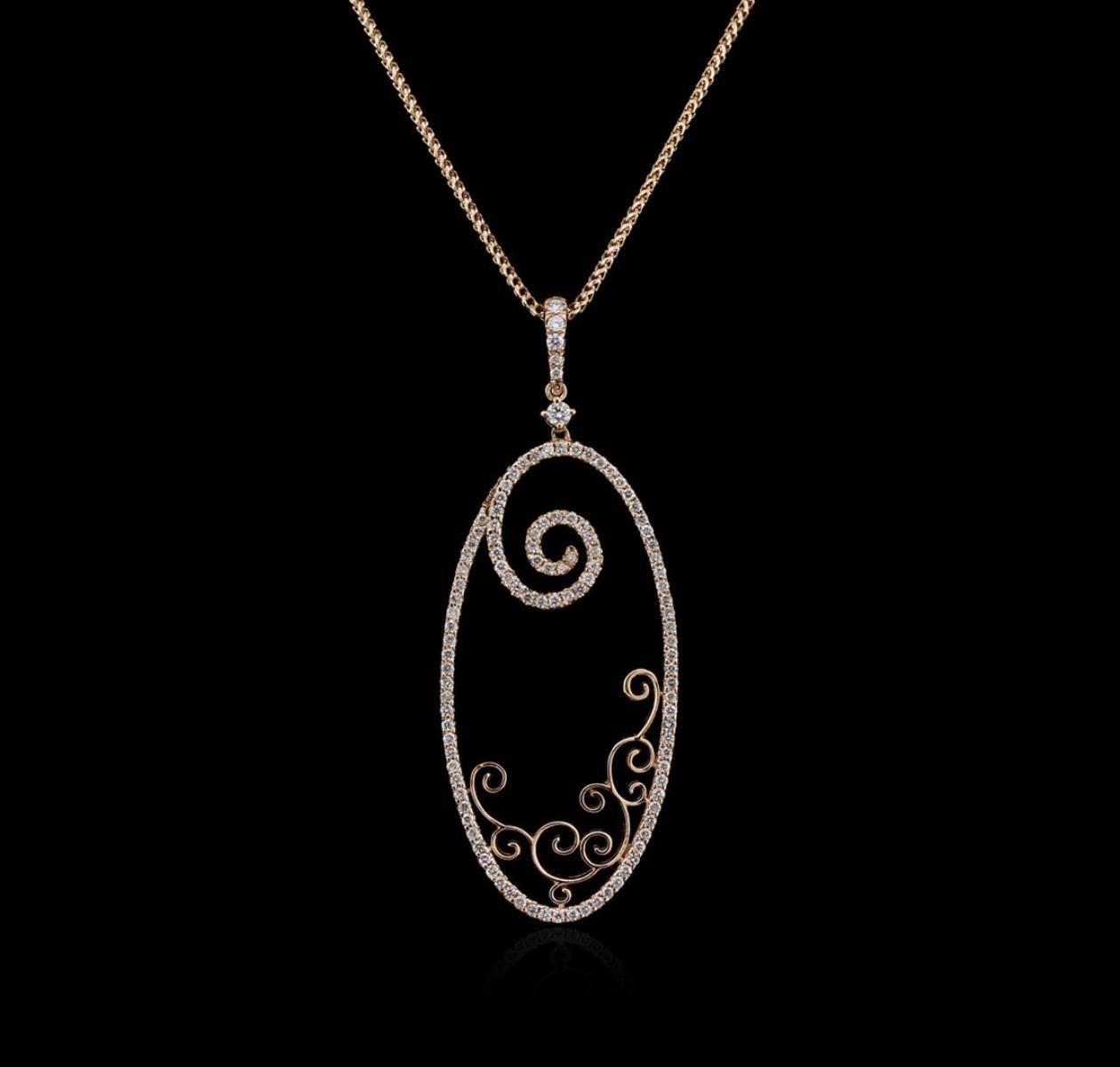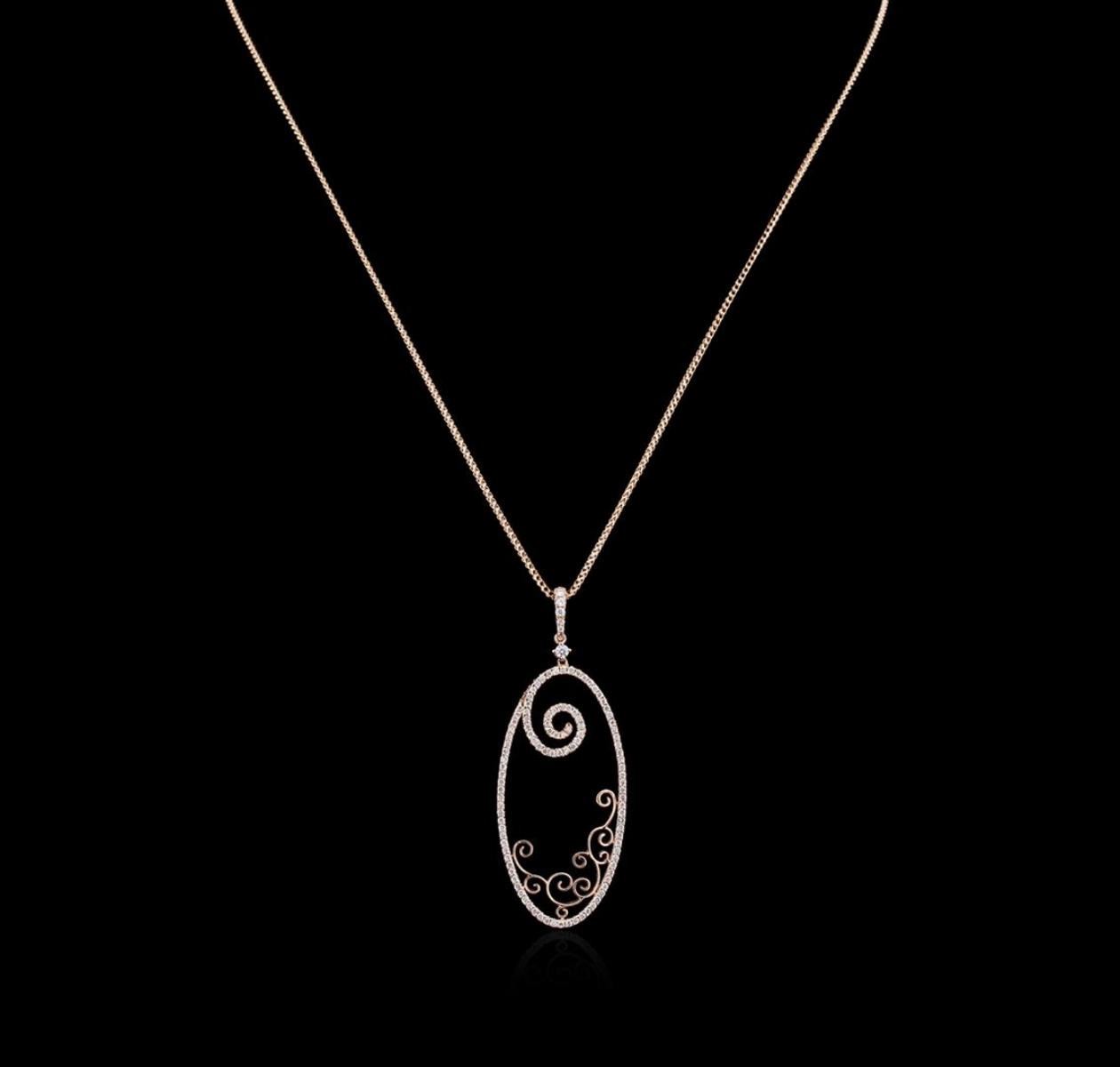One electronically tested 14KT rose gold ladies cast diamond pendant & chain 16.0" long, with a lobster claw clasp with a bright polish finish. Identified with markings of "14K". Condition is new. Containing: One Hundred Ten prong set round brilliant cut diamonds, measuring 1.50 - 1.10 x 0.78mm (depth est.) approximate total weight of 110 Stones = 0.69ct. Clarity: I-1 to I-2. Color: I - J, Cut is Good. Diamonds are graded in the mounting, unless otherwise stated. Total Weight of Diamonds 0.69ct. Total Weight of Pendant & Chain 7.20 grams. GGL Appraised.