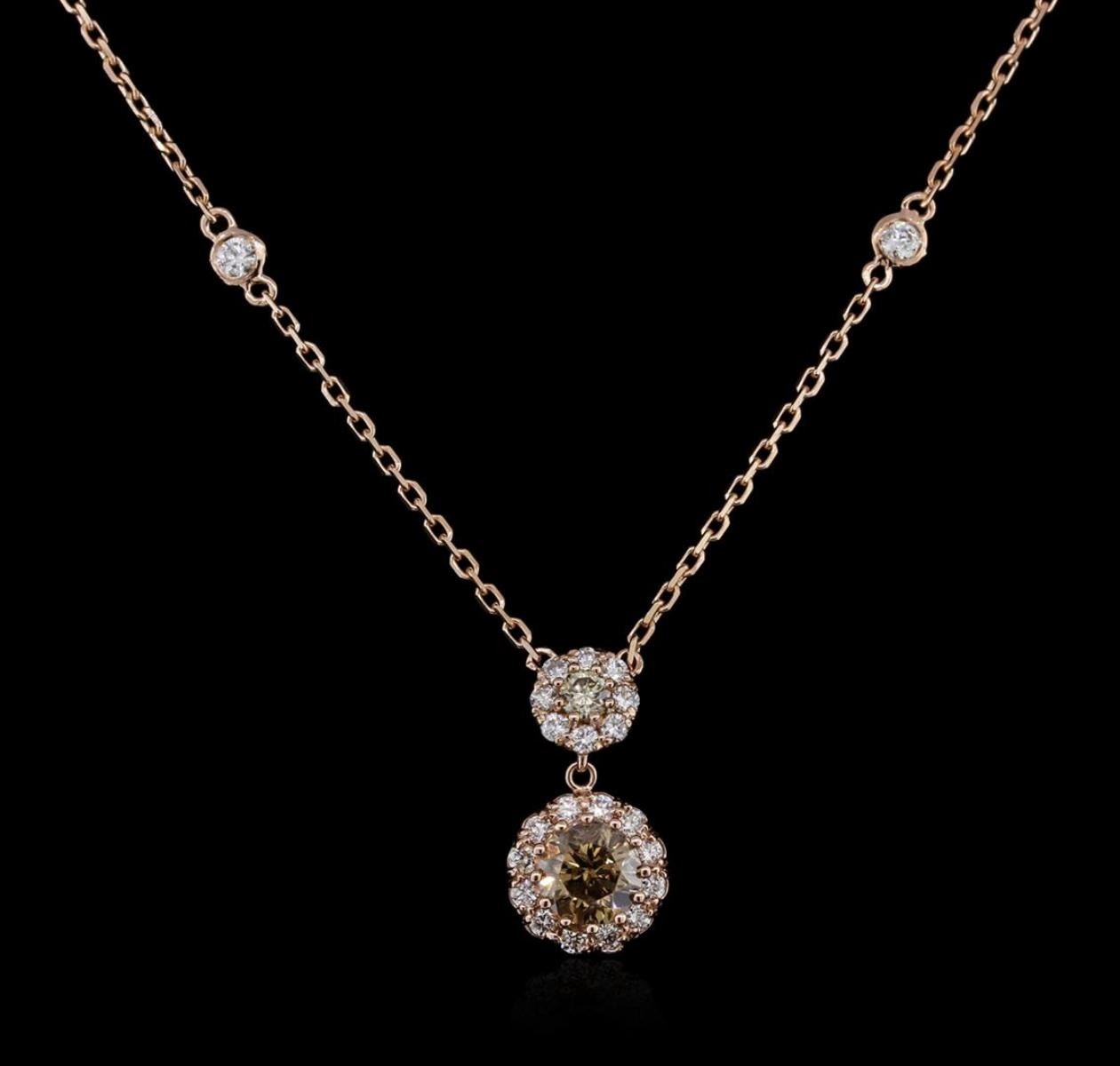 One electronically tested 14KT rose gold ladies diamond necklace with a lobster claw clasp. Identified with markings of "K14". Condition is new. Containing: One prong set round brilliant cut diamond, measuring 5.20 - 5.20 x 3.12mm (depth est.) approximate weight of 0.52ct. Clarity: SI-2, Cut is Good. One prong set round brilliant cut diamond, measuring 2.80 - 2.80 x 1.68mm (depth est.) approximate weight of 0.08ct. Clarity: SI-1, Cut is Good. Twenty-Two prong set round brilliant cut diamonds, measuring 1.50 - 1.50 x 0.90mm (depth est.) approximate total weight of 22 Stones = 0.38ct. Clarity: SI-1 to I-1. Color: K - L, Cut is Good. Diamonds are graded in the mounting, unless otherwise stated. Total Weight of Diamonds 0.98ct. Total Weight of Necklace 3.50 grams. GGL Appraised.
