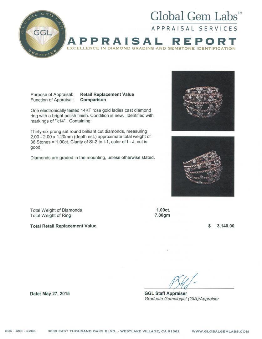 One electronically tested 14KT rose gold ladies cast diamond ring with a bright polish finish. Identified with markings of "k14". Condition is new. Containing: Thirty-Six prong set round brilliant cut diamonds, measuring 2.00 - 2.00 x 1.20mm (depth est.) approximate total weight of 36 Stones = 1.00ct. Clarity: SI-2 to I-1. Color: I - J, Cut is Good. Diamonds are graded in the mounting, unless otherwise stated. Total Weight of Diamonds 1.00ct. Total Weight of Ring 7.80 grams. GGL Appraised at $3,140.00.
