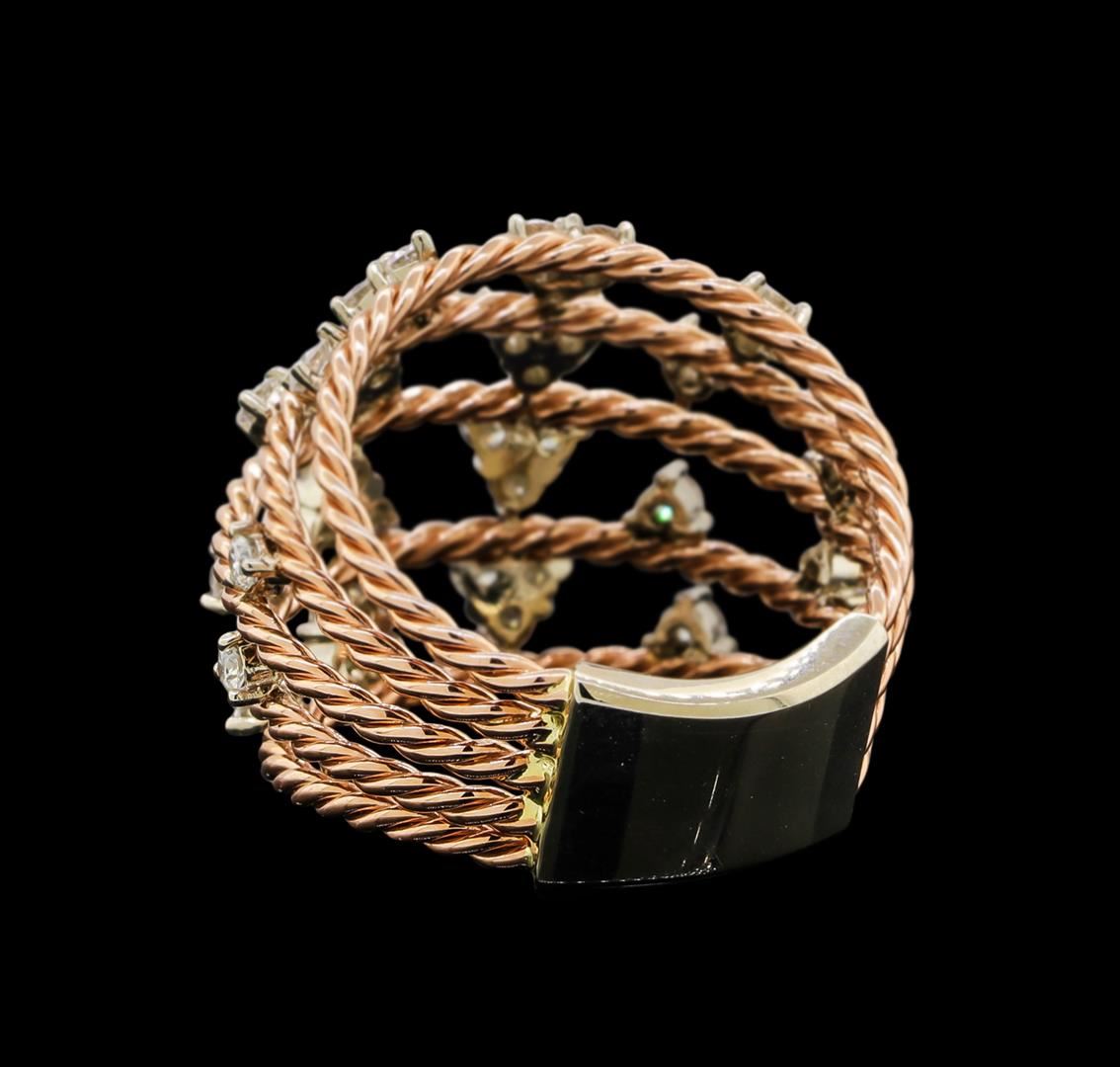 One electronically tested 14KT rose gold ladies cast diamond ring with a bright polish finish. Identified with markings of "k14". Condition is new. Containing: Thirty-Six prong set round brilliant cut diamonds, measuring 2.00 - 2.00 x 1.20mm (depth est.) approximate total weight of 36 Stones = 1.00 ct. Clarity: SI-2 to I-1. Color: I - J, Cut is Good. Diamonds are graded in the mounting, unless otherwise stated. Total Weight of Diamonds 1.00 ct. Total Weight of Ring 7.80 grams.