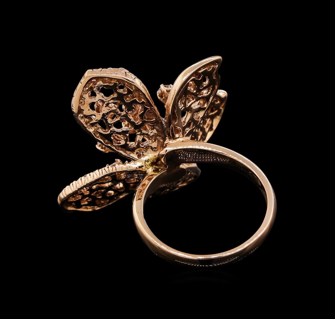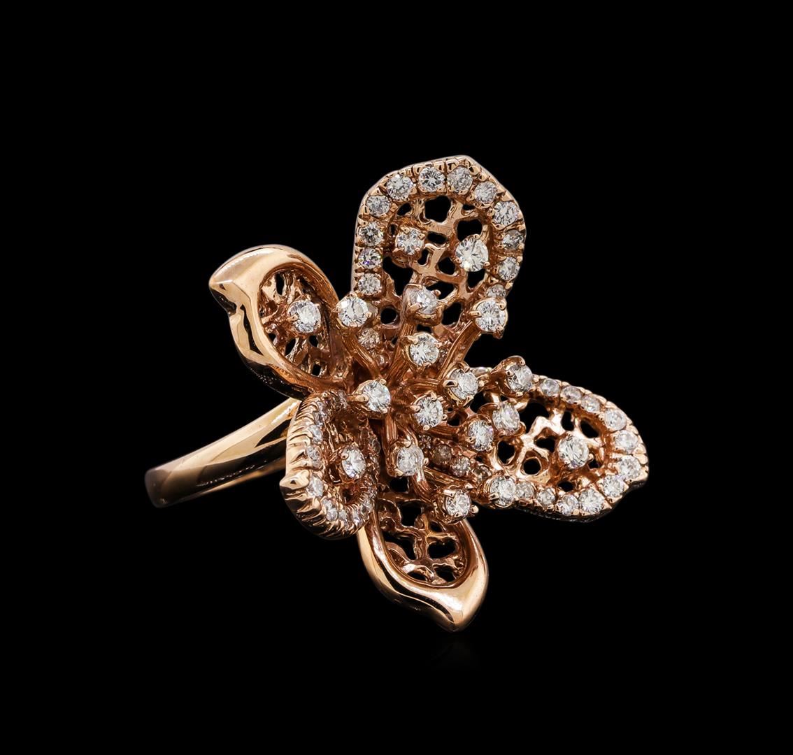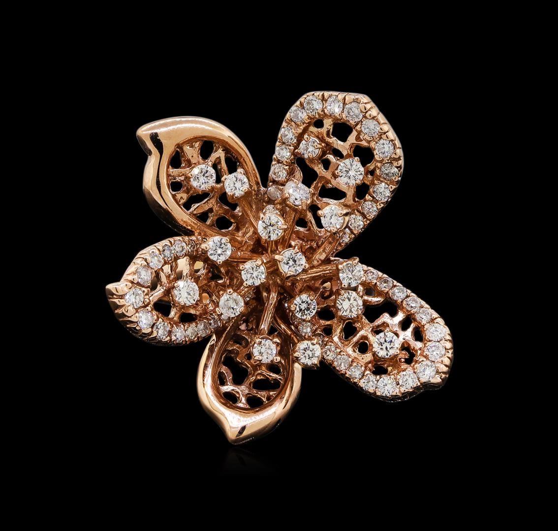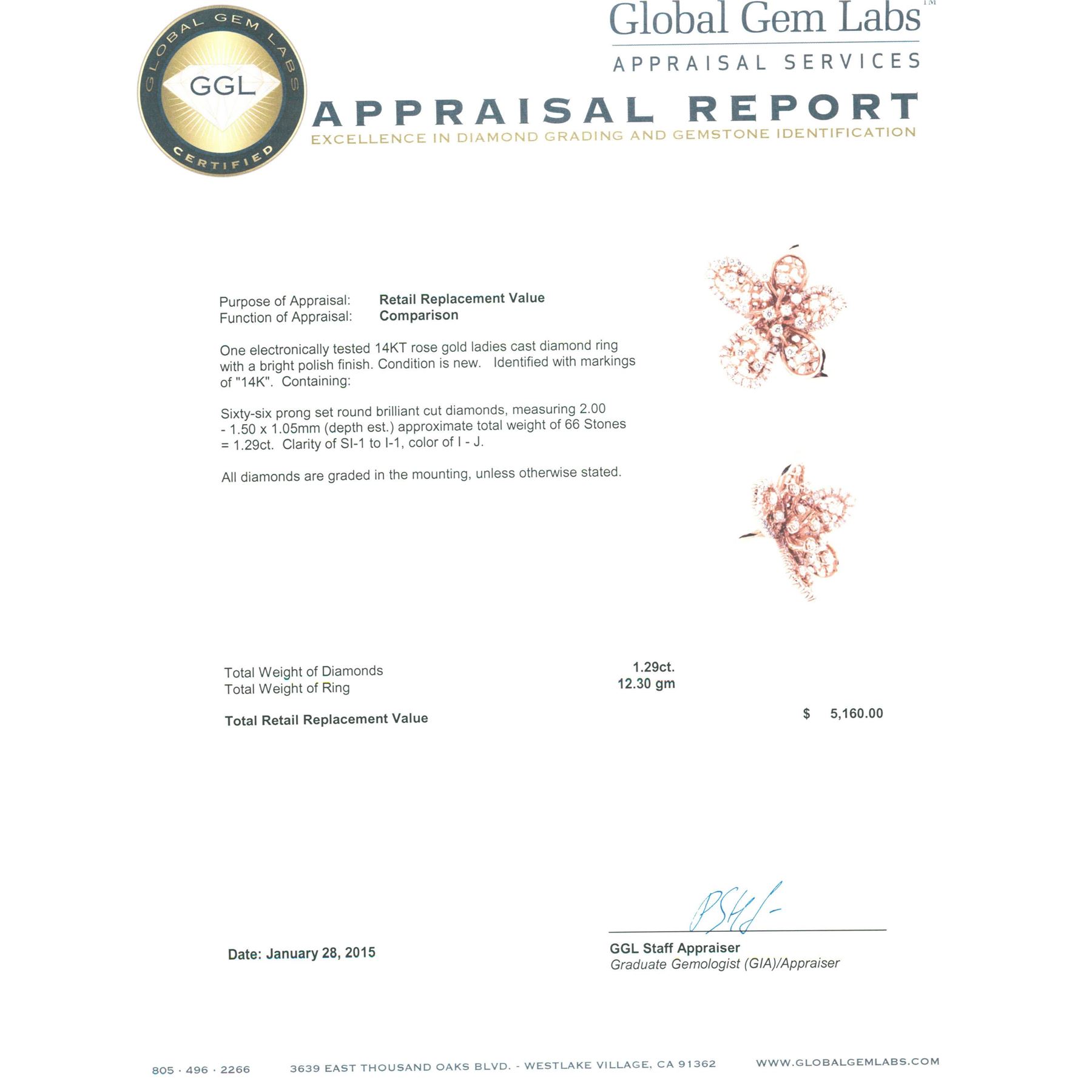 One electronically tested 14KT rose gold ladies cast diamond ring with a bright polish finish. Identified with markings of "14K". Condition is new. Containing: Sixty-Six prong set round brilliant cut diamonds, measuring 2.00 - 1.50 x 1.05mm (depth est.) approximate total weight of 66 Stones = 1.29ct. Clarity: SI-1 to I-1. Color: I - J. All diamonds are graded in the mounting, unless otherwise stated. Total Weight of Diamonds 1.29ct. Total Weight of Ring 12.30 grams. GGL Appraised.