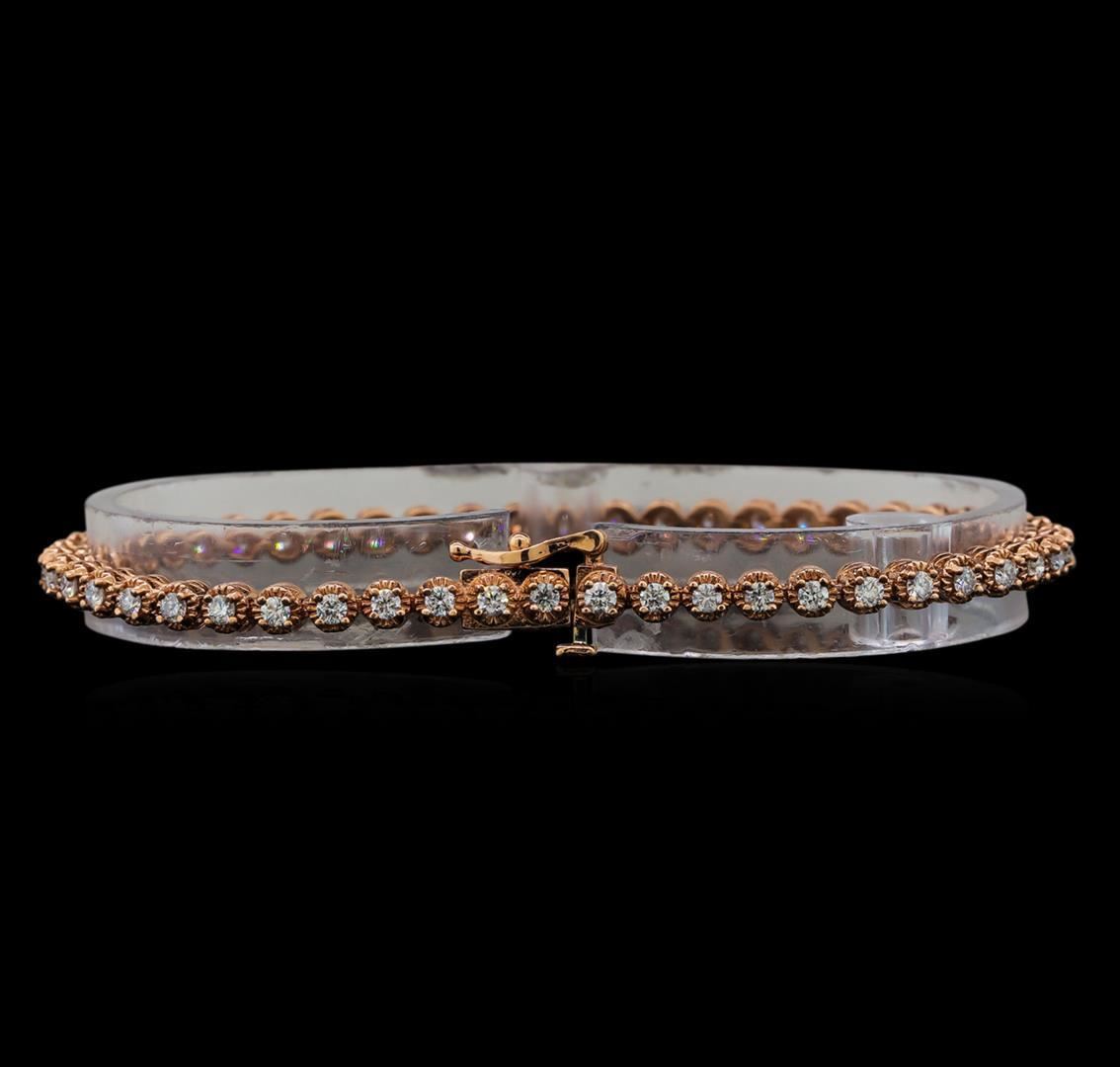 One electronically tested 14KT rose gold ladies cast diamond tennis bracelet with a hidden box clasp with safety closer with a bright polish finish. Measurements: 7" in length Identified with markings of "14K". Condition is new. Containing: Fifty prong set round brilliant cut diamonds, measuring 1.90 - 1.90 x 1.14mm (depth est.) approximate total weight of 50 Stones = 1.78ct. Clarity: SI-2 to I-1. Color: H - I, Cut is Good. All diamonds are graded in the mounting, unless otherwise stated. Total Weight of Diamonds 1.78ct. Total Weight of Tennis Bracelet 10.20 grams. GGL Appraised.