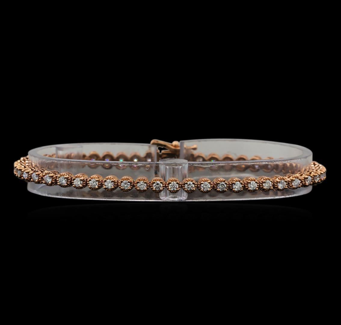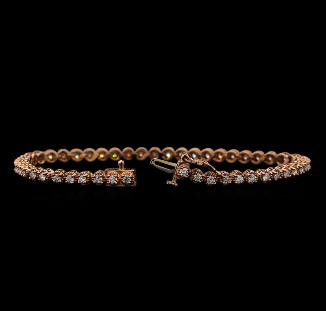 One electronically tested 14KT rose gold ladies cast diamond tennis bracelet with a hidden box clasp with safety closer with a bright polish finish. Measurements: 7" in length Identified with markings of "14K". Condition is new. Containing: Fifty prong set round brilliant cut diamonds, measuring 1.90 - 1.90 x 1.14mm (depth est.) approximate total weight of 50 Stones = 1.78ct. Clarity: SI-2 to I-1. Color: H - I, Cut is Good. All diamonds are graded in the mounting, unless otherwise stated. Total Weight of Diamonds 1.78ct. Total Weight of Tennis Bracelet 10.20 grams. GGL Appraised.