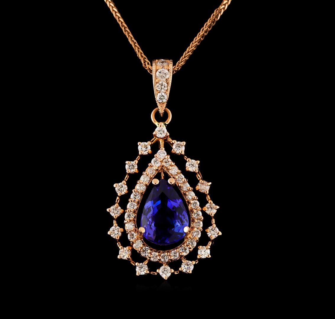 One electronically tested 14KT rose gold ladies cast tanzanite and diamond pendant & chain 18.0" long, herringbone link with a lobster claw clasp with a bright polish finish. Identified with markings of "14K". Condition is new. Containing: One prong set pear modified brilliant cut natural tanzanite, measuring 9.90 x 6.80 x 4.42mm, approximate total weight of 1.99ct., clarity is eye clean, type I, medium light, moderately strong, violet color, (GIA V 4/4), cut is good. Forty-Two prong set round brilliant cut diamonds, measuring 1.70 - 1.30 x 0.90mm (depth est.) approximate total weight of 42 Stones = 0.52ct. Clarity: SI-2 to I-1. Color: I - J, Cut is Good. Five prong set round brilliant cut diamonds, measuring 1.90 - 1.80 x 1.11mm (depth est.) approximate total weight of 5 Stones = 0.12ct. Clarity: SI-2. Color: H - I, Cut is Good. Colored gemstones are presumed to have been subjected to commonly used enhancement processes. All diamonds and colored gemstones are graded in the mounting, unless otherwise stated. Total Weight of Colored Stones 1.99ct. Total Weight of Diamonds 0.63ct. Total Weight of Pendant & Chain 5.40 grams. GGL Appraised at $3,700.00.