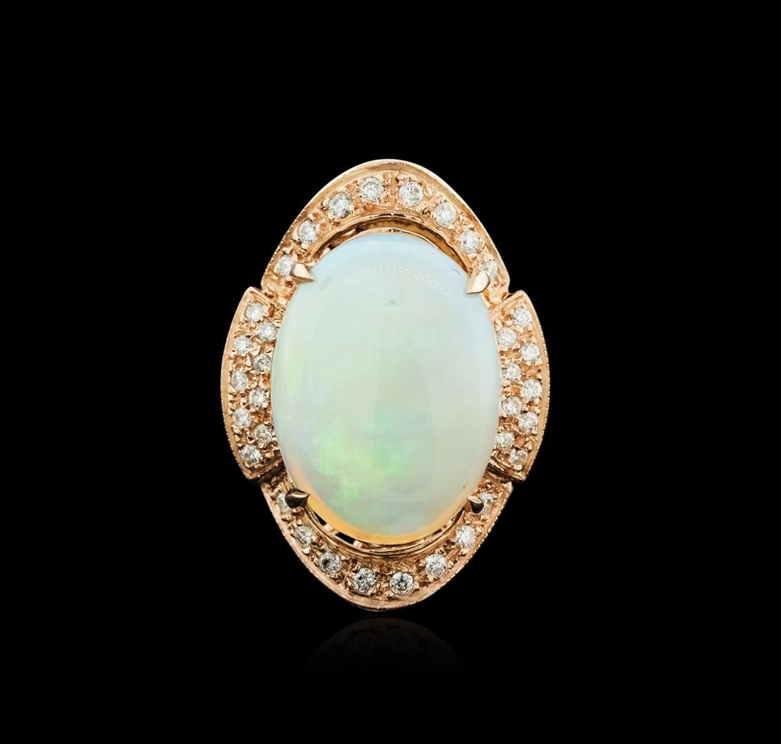 One electronically tested 14KT rose gold ladies cast opal and diamond ring with a bright polish finish. Identified with markings of "14K". Condition is new. Containing: Thirty-Three prong set round brilliant cut diamonds, measuring 1.50 - 1.20 x 0.81mm (depth est.) approximate total weight of 33 Stones = 0.30 ct.. Clarity: SI-2 to I-1. Color: H - I, Cut is Good. One white opal that is cut in a oval shaped cabochon and is prong set, measuring 19.37 mm long x 14.77 mm wide, and 6.50 mm thick and the approximate weight is 11.59 carats. The opal has a somewhat bright, green only play of color (fire) in a flashfire pattern; a dome; a good cut; no inclusions; consistent in its brightness and pattern; and is somewhat directional. Colored gemstones are presumed to have been subjected to commonly used enhancement processes. All diamonds and colored gemstones are graded in the mounting, unless otherwise stated.. Total Weight of Diamonds 0.30 ct.. Total Weight of Opals 11.59ct.. Total Weight of Ring 8.50 grams. GGL Appraised.