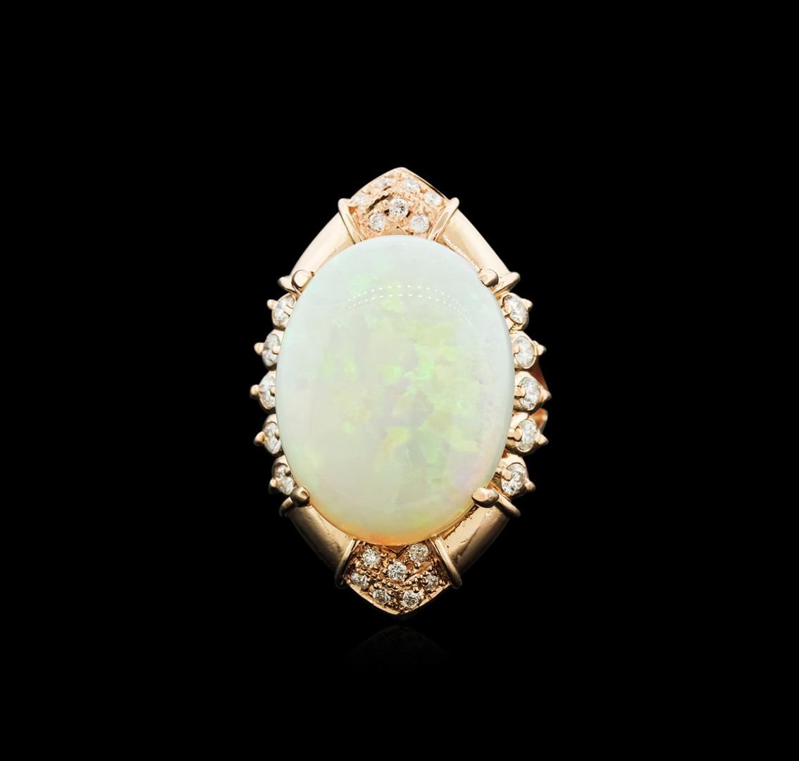 One electronically tested 14KT rose gold ladies cast opal and diamond ring with a bright polish finish. Identified with markings of "14K". Condition is new. Containing: One white opal that is cut in a oval shaped cabochon and is prong set, measuring 21.80 mm long x 16.77 mm wide, and 6.50 mm thick and the approximate weight is 14.82 carats. The opal has a somewhat bright, green only play of color (fire) in a flashfire pattern; a dome; a good cut; no inclusions; consistent in its brightness and pattern; and is somewhat directional. Twenty-Eight prong set round brilliant cut diamonds, measuring 2.10 - 1.30 x 1.02mm (depth est.) approximate total weight of 28 Stones = 0.50ct.. Clarity: SI-2 to I-1. Color: H - I, Cut is Good. Colored gemstones are presumed to have been subjected to commonly used enhancement processes. All diamonds and colored gemstones are graded in the mounting, unless otherwise stated.. Total Weight of Diamonds 0.50ct.. Total Weight of Opals 14.82ct.. Total Weight of Ring 12.70 grams. GGL Appraised at $5,225.00.