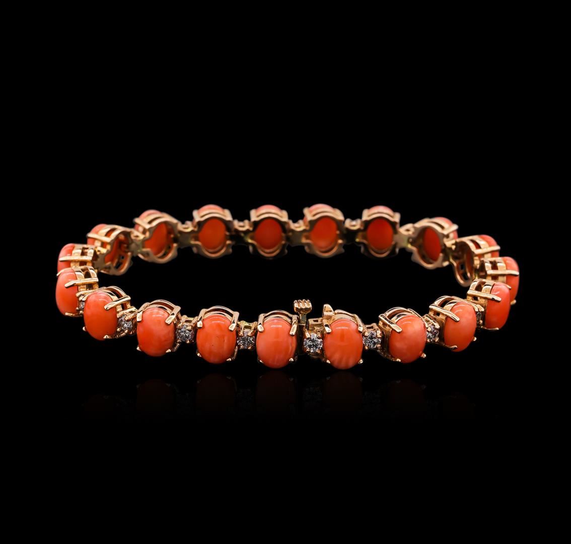 One electronically tested 14KT rose gold Ladies cast bracelet with a hidden box clasp with a bright polish finish. Condition is new. Measurements: 7" in length. Identified with markings of "14K". Containing: Nineteen prong set oval cabochon cut natural pink corals, measuring 8.00 x 6.00 x 2.60mm, approximate. Total Weight of 16.91ct., clarity is heavily included, medium light, very slightly grayish, pink color, (GIA Pk 4/3), cut is very good. Colored gemstones are presumed to have been subjected to commonly used color/clarity enhancement processes. Nineteen prong set round brilliant cut diamonds, measuring 3.00 - 3.00 x 1.80mm (depth est.) approximate. Total Weight of 19 Stones = 1.88ct. Clarity: SI-2 to I-2. Color: H - I, Cut is Good. Total Weight of Colored Stones 16.91ct. Total Weight of Diamonds 1.88ct. Total Weight of Bracelet 21.50 grams. GGL Appraised at $13,765.00.