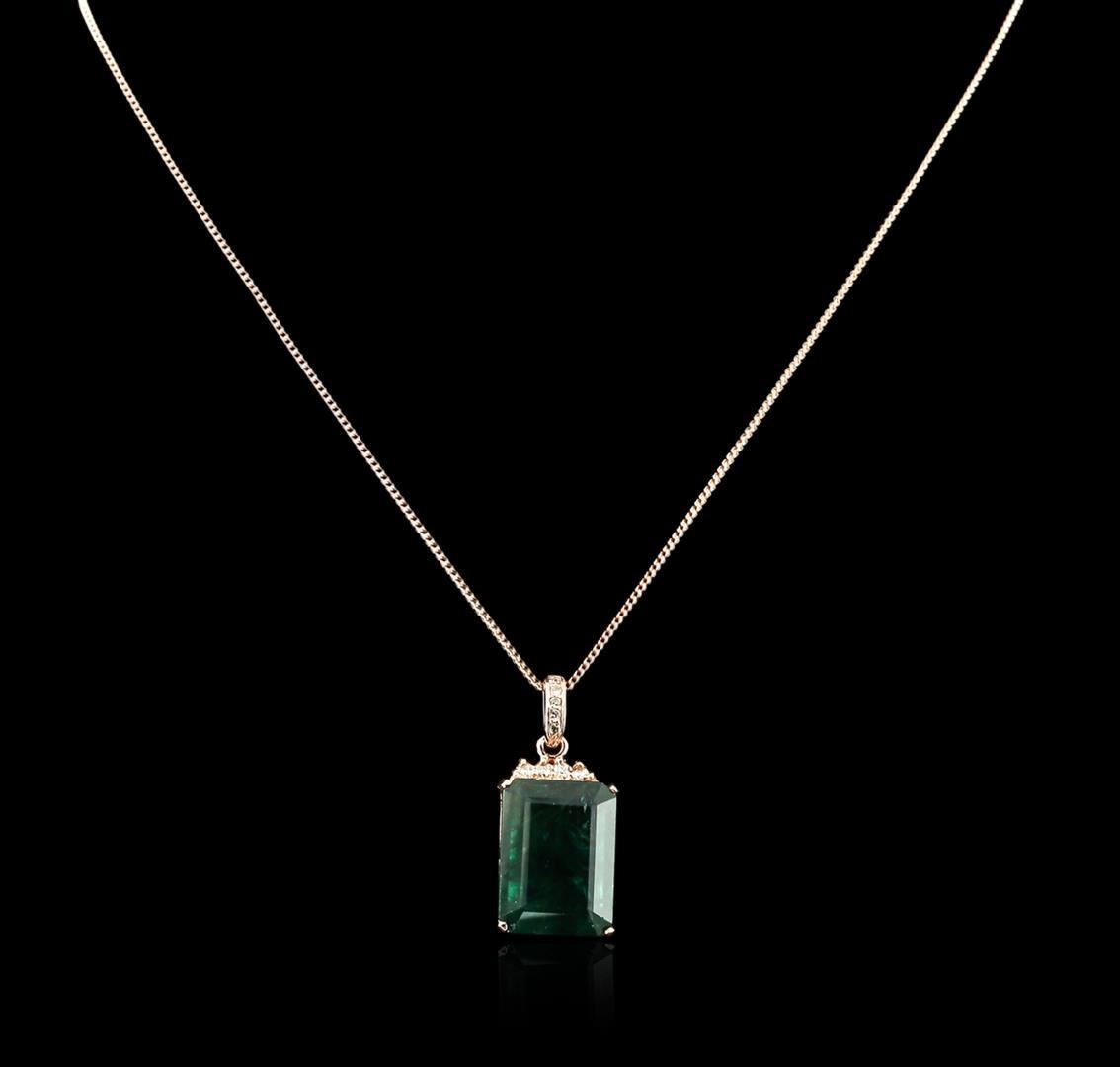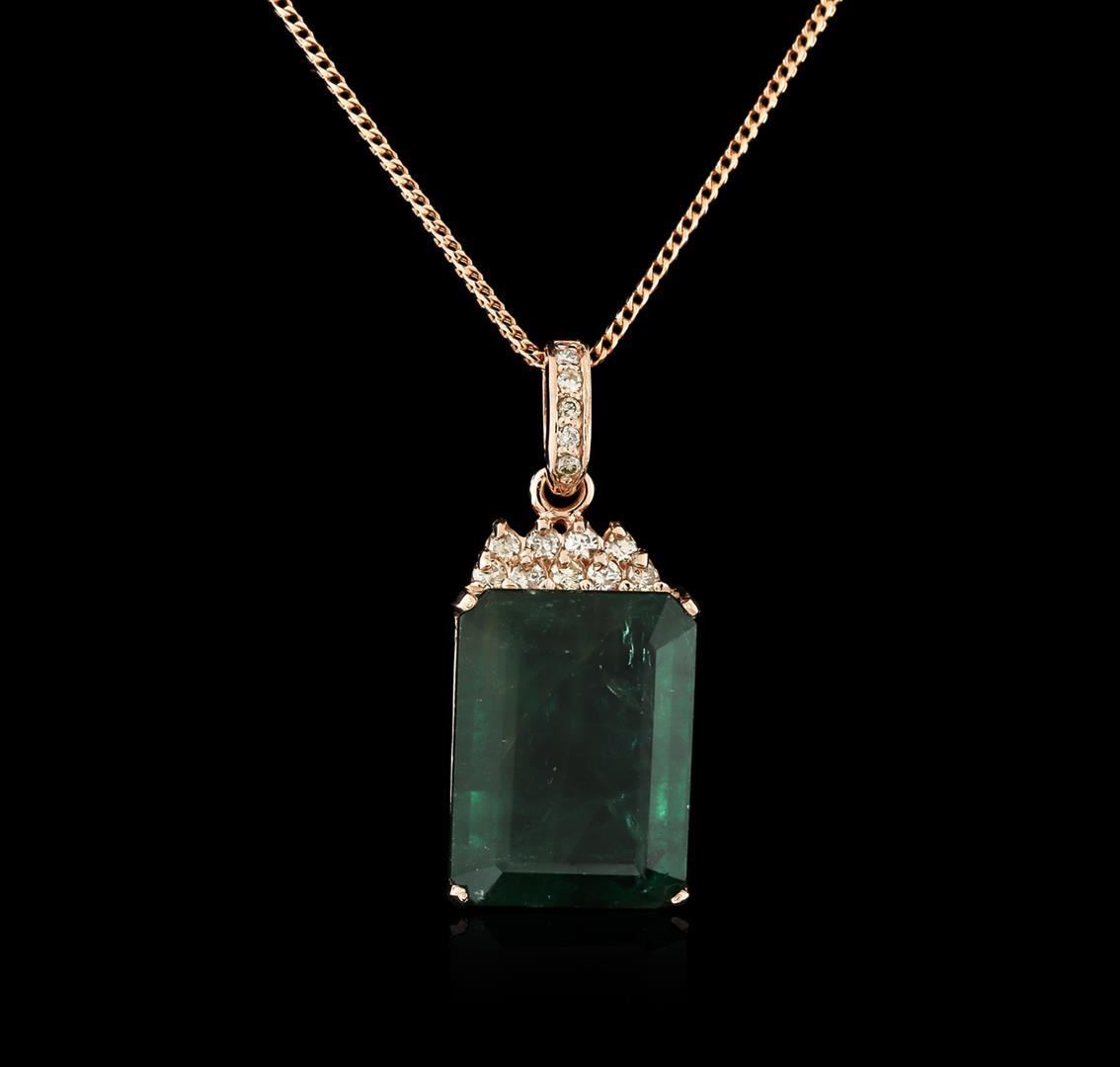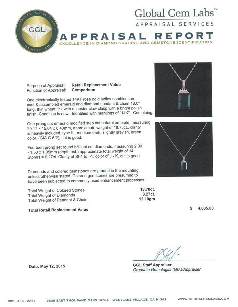 One electronically tested 14KT rose gold ladies combination cast & assembled emerald and diamond pendant & chain 18.0" long, thin wheat link with a lobster claw clasp with a bright polish finish. Identified with markings of "14K". Condition is new. Containing: One prong set emerald modified step cut natural emerald, measuring 20.17 x 15.04 x 8.43mm, approximate weight of 18.78ct., clarity is heavily included, type III, medium dark, slightly grayish, green color, (GIA G 6/2), cut is good. Fourteen prong set round brilliant cut diamonds, measuring 2.00 - 1.50 x 1.05mm (depth est.) approximate total weight of 14 Stones = 0.27ct. Clarity: SI-1 to I-1. Color: J - K, Cut is Good. Diamonds and colored gemstones are graded in the mounting, unless otherwise stated. Colored gemstones are presumed to have been subjected to commonly used enhancement processes. Total Weight of Colored Stones 18.78ct. Total Weight of Diamonds 0.27ct. Total Weight of Pendant & Chain 12.10 grams. GGL Appraised.
