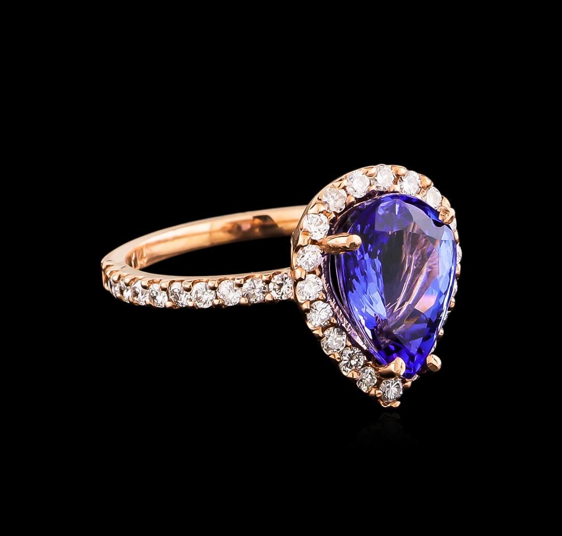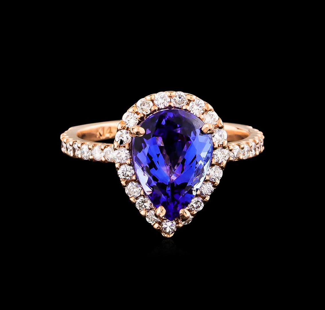 One electronically tested 14KT rose gold Ladies combination cast & assembled ring with a bright polish finish. Condition is new. Identified with markings of "14K". Containing: One prong set pear modified brilliant cut natural tanzanite, measuring 10.09 x 7.95 x 5.16mm, approximate. Total Weight of 2.77ct., clarity is eye clean, type I, medium, moderately strong, bluish violet color, (GIA bV 5/4), cut is good. Forty prong set round brilliant cut diamonds, measuring 1.50 - 1.50 x 0.90mm (depth est.) approximate. Total Weight of 40 Stones = 0.49ct. Clarity: I-1 to I-2. Color: I - J, Cut is Good. Colored gemstones are presumed to have been subjected to commonly used enhancement processes. All diamonds and colored gemstones are graded in the mounting, unless otherwise stated. Total Weight of Colored Stones 2.77ct. Total Weight of Diamonds 0.49ct. Total Weight of Ring 3.70 grams. GGL Appraised.