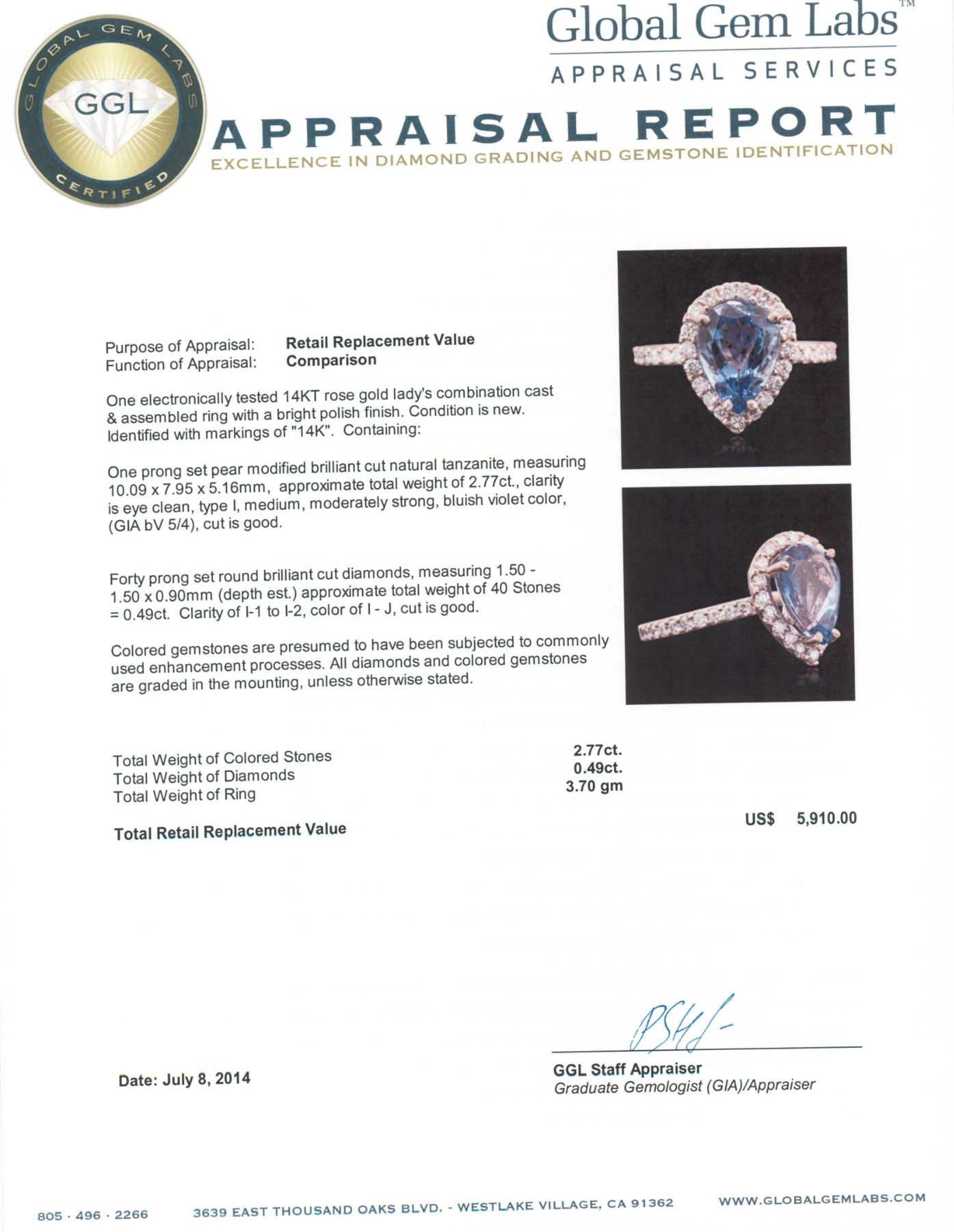 One electronically tested 14KT rose gold Ladies combination cast & assembled ring with a bright polish finish. Condition is new. Identified with markings of "14K". Containing: One prong set pear modified brilliant cut natural tanzanite, measuring 10.09 x 7.95 x 5.16mm, approximate. Total Weight of 2.77ct., clarity is eye clean, type I, medium, moderately strong, bluish violet color, (GIA bV 5/4), cut is good. Forty prong set round brilliant cut diamonds, measuring 1.50 - 1.50 x 0.90mm (depth est.) approximate. Total Weight of 40 Stones = 0.49ct. Clarity: I-1 to I-2. Color: I - J, Cut is Good. Colored gemstones are presumed to have been subjected to commonly used enhancement processes. All diamonds and colored gemstones are graded in the mounting, unless otherwise stated. Total Weight of Colored Stones 2.77ct. Total Weight of Diamonds 0.49ct. Total Weight of Ring 3.70 grams. GGL Appraised.