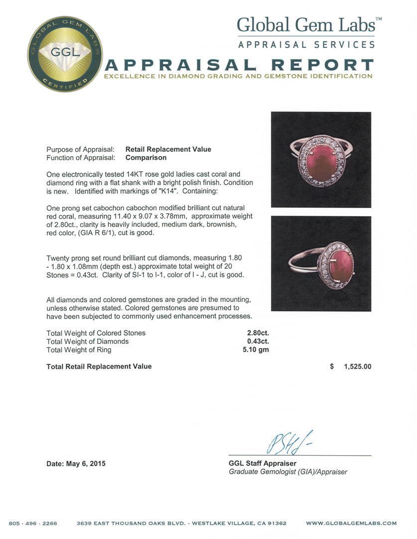 One electronically tested 14KT rose gold ladies cast coral and diamond ring with a flat shank with a bright polish finish. Identified with markings of "K14". Condition is new. Containing: One prong set cabochon cabochon modified brilliant cut natural red coral, measuring 11.40 x 9.07 x 3.78mm, approximate weight of 2.80ct., clarity is heavily included, medium dark, brownish, red color, (GIA R 6/1), cut is good. Twenty prong set round brilliant cut diamonds, measuring 1.80 - 1.80 x 1.08mm (depth est.) approximate total weight of 20 Stones = 0.43ct. Clarity: SI-1 to I-1. Color: I - J, Cut is Good. All diamonds and colored gemstones are graded in the mounting, unless otherwise stated. Colored gemstones are presumed to have been subjected to commonly used enhancement processes.. Total Weight of Colored Stones 2.80ct. Total Weight of Diamonds 0.43ct. Total Weight of Ring 5.10 grams. GGL Appraised at $1,525.00.