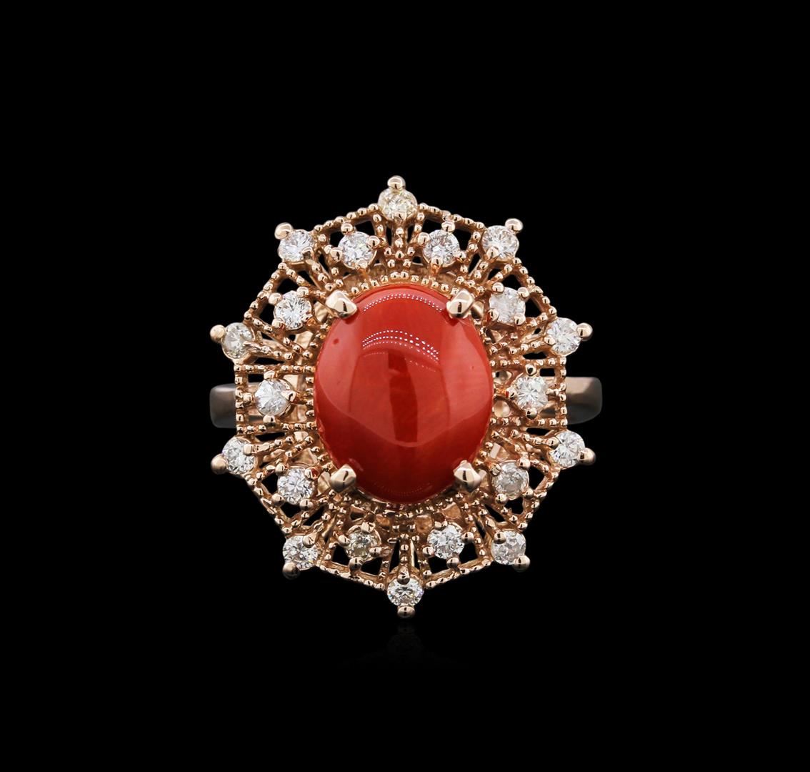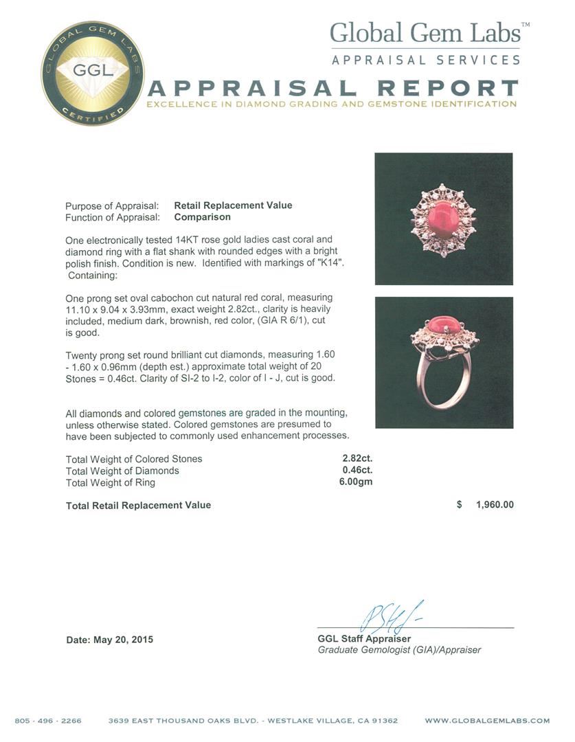 One electronically tested 14KT rose gold ladies cast coral and diamond ring with a flat shank with rounded edges with a bright polish finish. Identified with markings of "K14". Condition is new. Containing: One prong set oval cabochon cut natural red coral, measuring 11.10 x 9.04 x 3.93mm, exact weight 2.82ct., clarity is heavily included, medium dark, brownish, red color, (GIA R 6/1), cut is good. Twenty prong set round brilliant cut diamonds, measuring 1.60 - 1.60 x 0.96mm (depth est.) approximate total weight of 20 Stones = 0.46ct. Clarity: SI-2 to I-2. Color: I - J, Cut is Good. All diamonds and colored gemstones are graded in the mounting, unless otherwise stated. Colored gemstones are presumed to have been subjected to commonly used enhancement processes. Total Weight of Colored Stones 2.82ct. Total Weight of Diamonds 0.46ct. Total Weight of Ring 6.00 grams. GGL Appraised at $1,960.00.