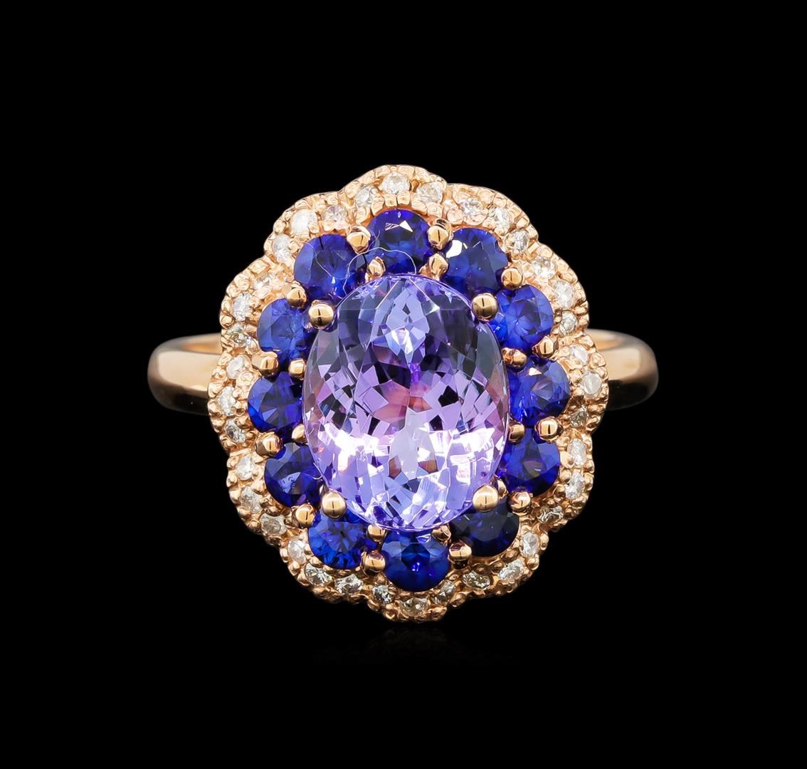 One electronically tested 14KT rose gold ladies cast tanzanite, sapphire and diamond ring with a bright polish finish. Identified with markings of "K14". Condition is new. Containing: One prong set oval modified brilliant cut natural tanzanite, measuring 9.90 x 8.00 x 5.20mm, approximate weight of 2.90 ct., clarity is eye clean, type I, medium light, very slightly grayish, violet color, (GIA V 4/3), cut is good. Twelve prong set round modified brilliant cut natural blue sapphires, measuring 2.80 - 2.80 x 1.83 mm, approximate total weight of 1.32ct., clarity is slightly included, type II, medium, moderately strong, blue color, (GIA B 5/4), cut is good. Thirty-Nine prong set round brilliant cut diamonds, measuring 1.00 - 1.00 x 0.60mm (depth est.) approximate total weight of 39 Stones = 0.14ct. Clarity: I-2. Color: J - K, Cut is Good. Colored gemstones are presumed to have been subjected to commonly used enhancement processes. All diamonds and colored gemstones are graded in the mounting, unless otherwise stated. Total Weight of Colored Stones 4.22ct. Total Weight of Diamonds 0.14ct. Total Weight of Ring 6.90 grams. GGL Appraised.