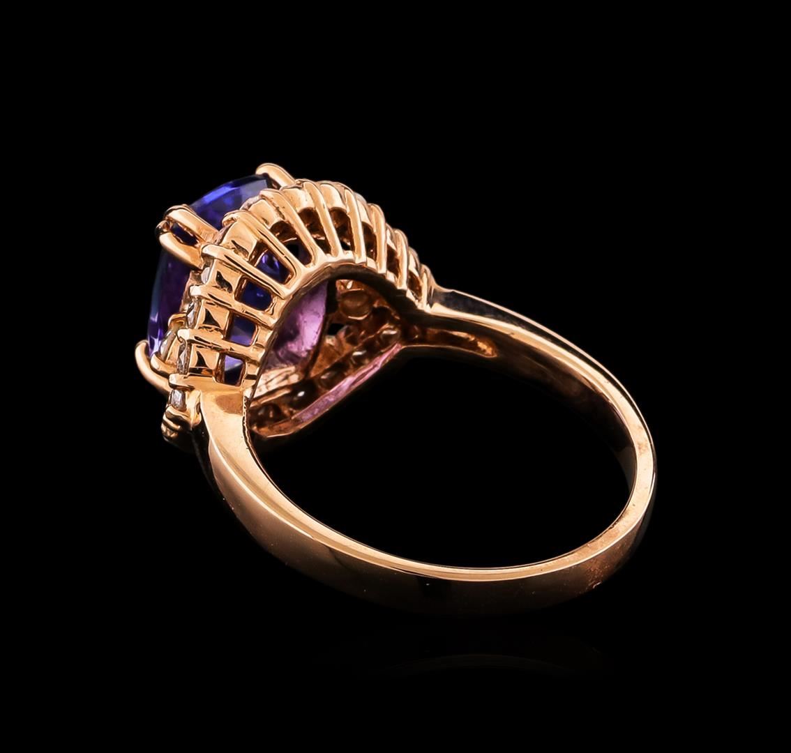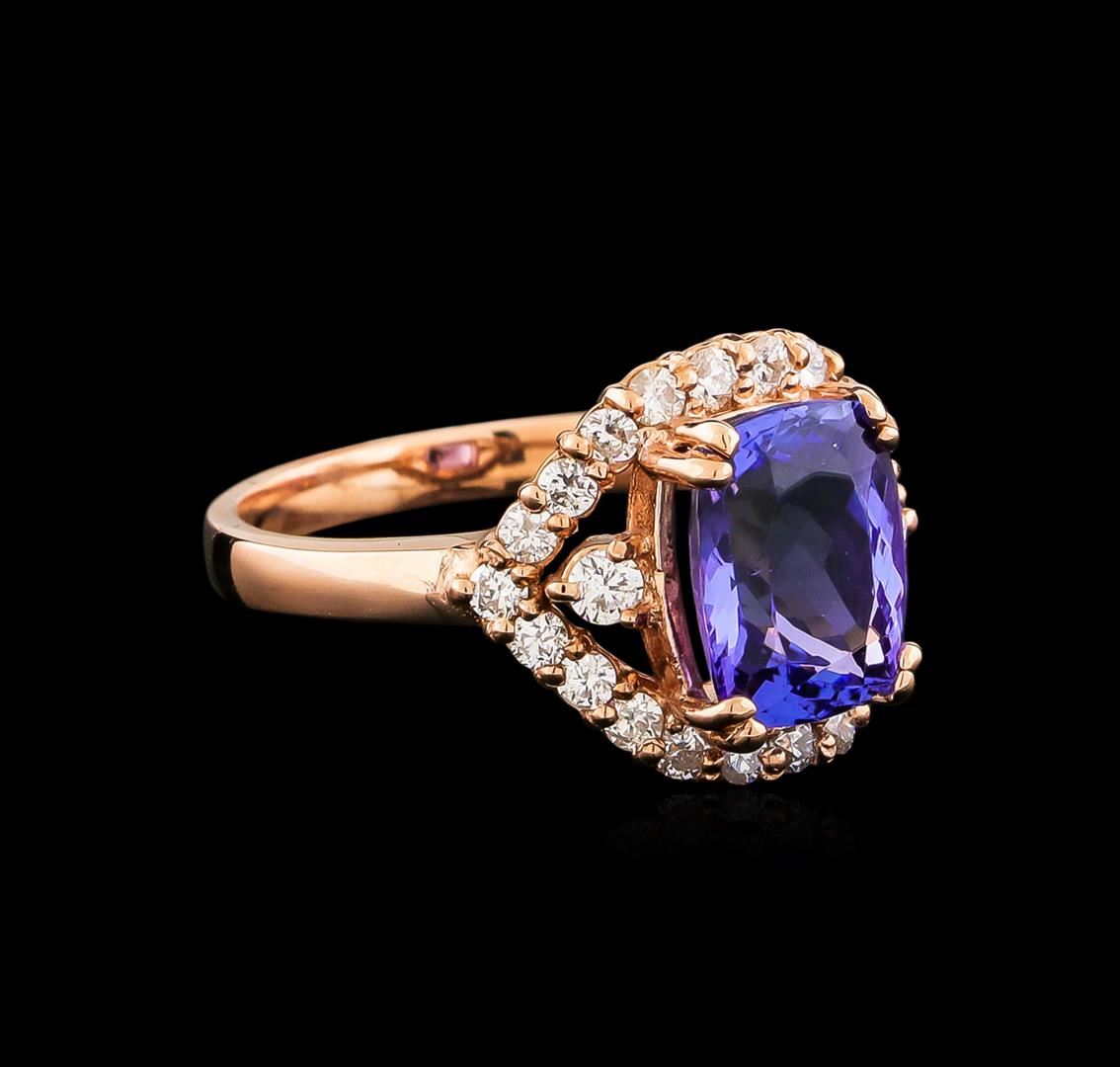 One electronically tested 14KT rose gold ladies combination cast & assembled ring with a bright polish finish. Condition is new. Identified with markings of "K14". Containing: Twenty-Four prong set round brilliant cut diamonds, measuring 2.20 - 1.70 x 1.17mm (depth est.) approximate. Total Weight of 24 Stones = 0.35ct. Clarity: SI-1 to SI-2. Color: I - J, Cut is Good. One prong set rectangular cushion modified brilliant cut natural tanzanite, measuring 9.85 x 7.60 x 5.00mm, approximate weight of 2.95ct., clarity is eye clean, type I, medium, very slightly grayish, bluish violet color, (GIA bV 5/3), cut is good. Colored gemstones are presumed to have been subjected to commonly used enhancement processes. All diamonds and colored gemstones are graded in the mounting, unless otherwise stated. Total Weight of Colored Stones 2.95ct. Total Weight of Diamonds 0.35ct. Total Weight of Ring 5.30 grams. GGL Appraised at $7,265.00.
